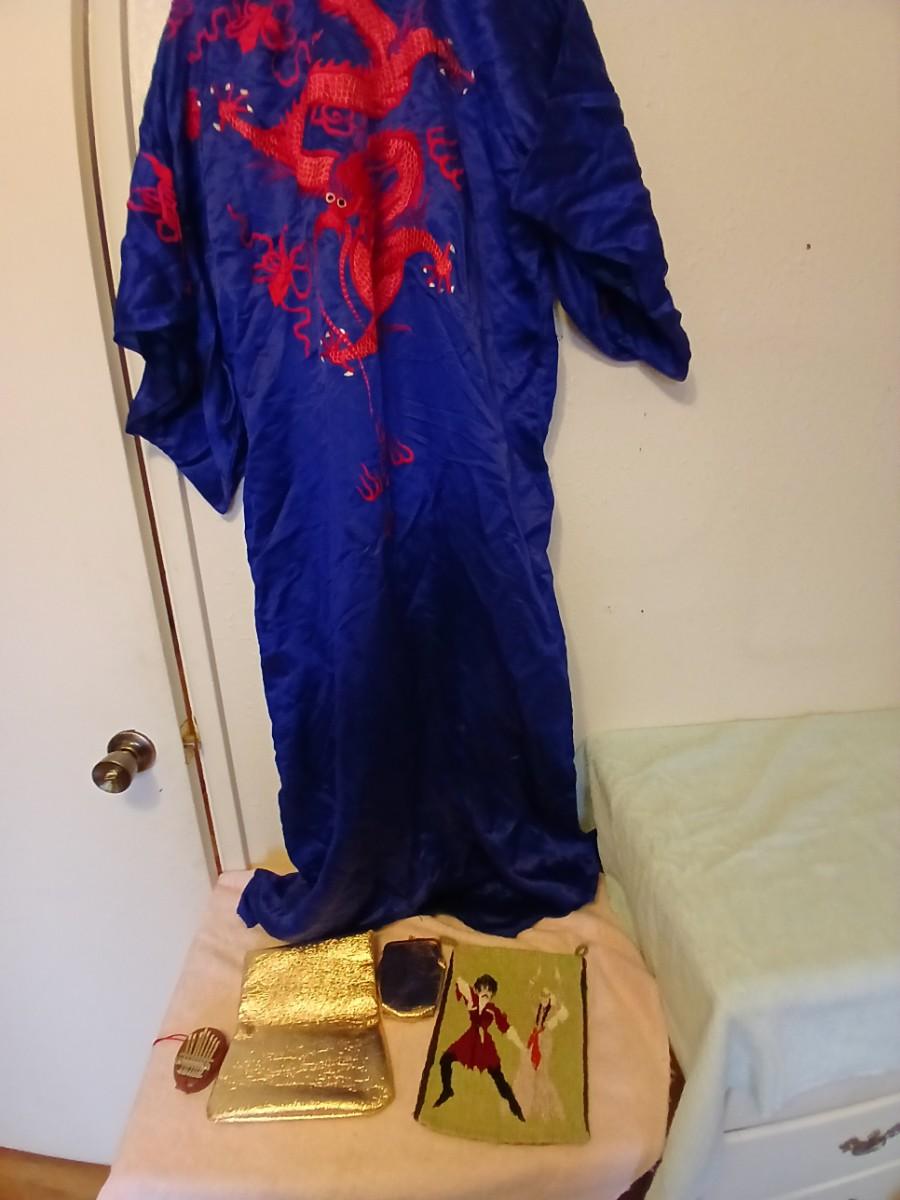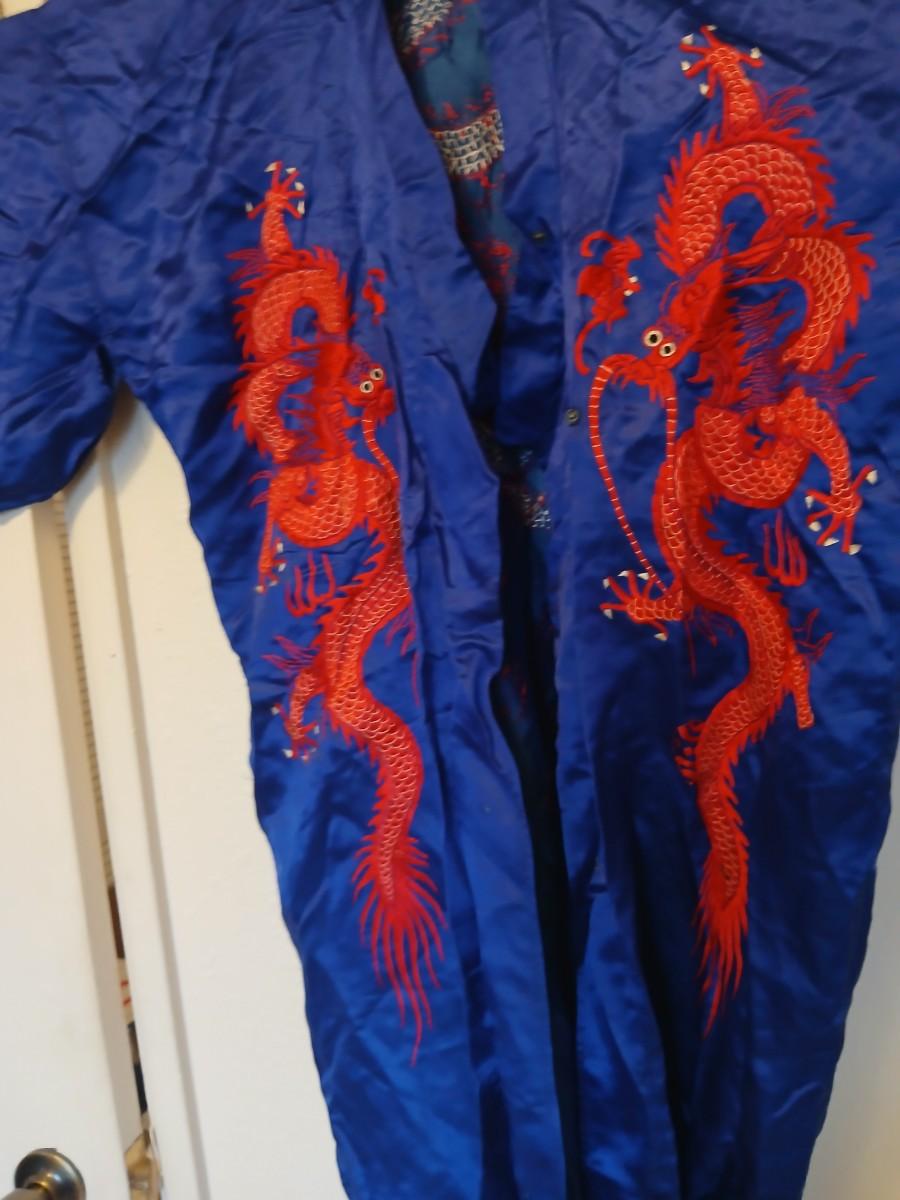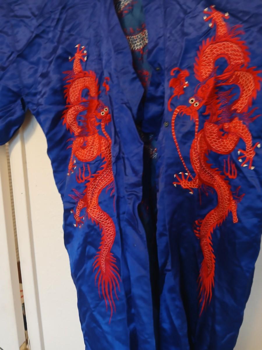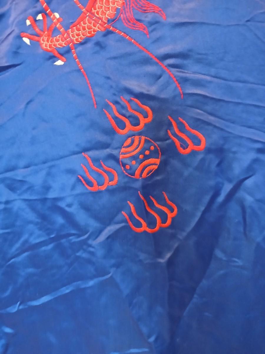 Vintage Japanese Kimono Blue Silk Embroidered Red Dragons with gold coin purse and embroidered art cloth