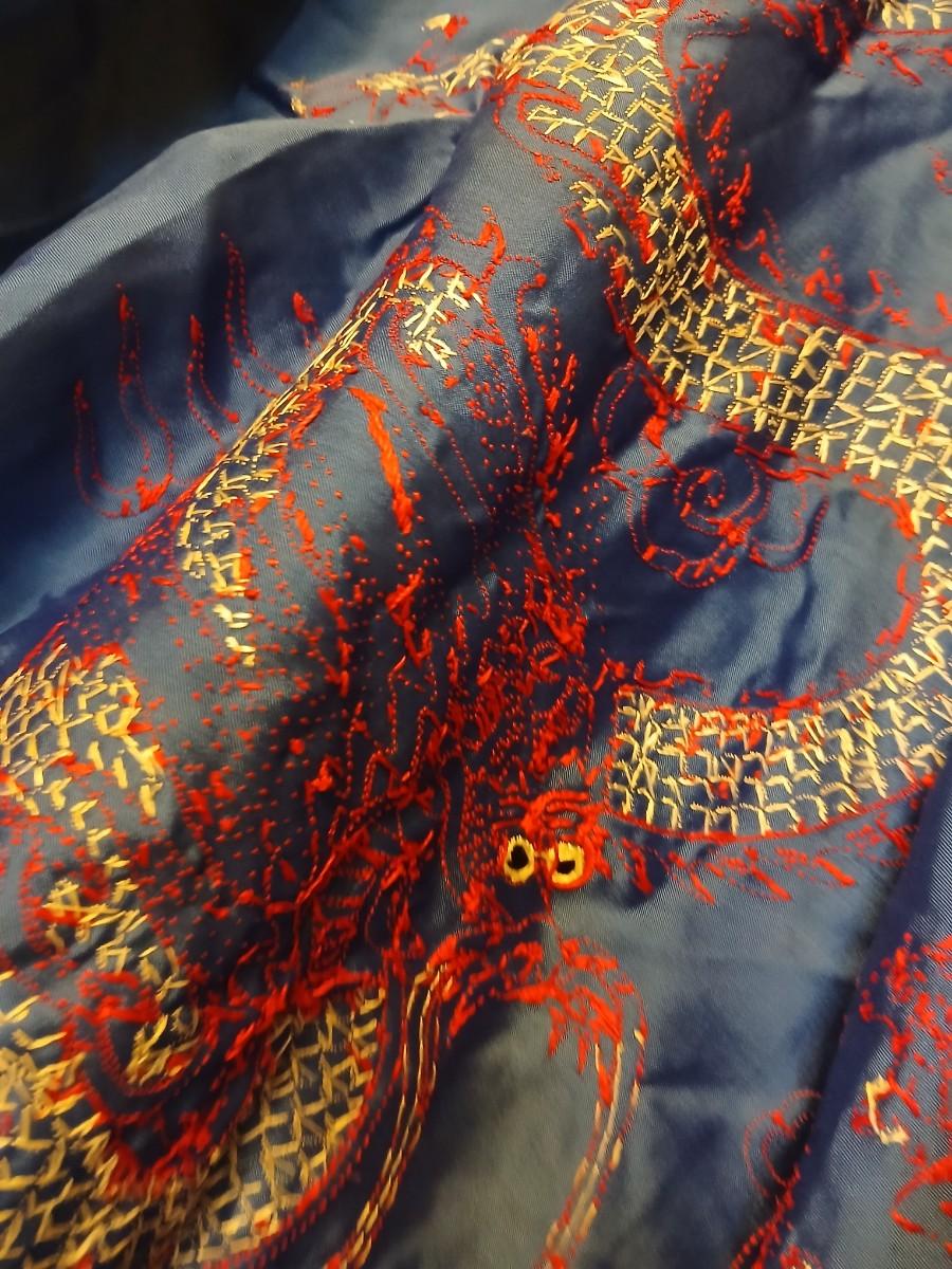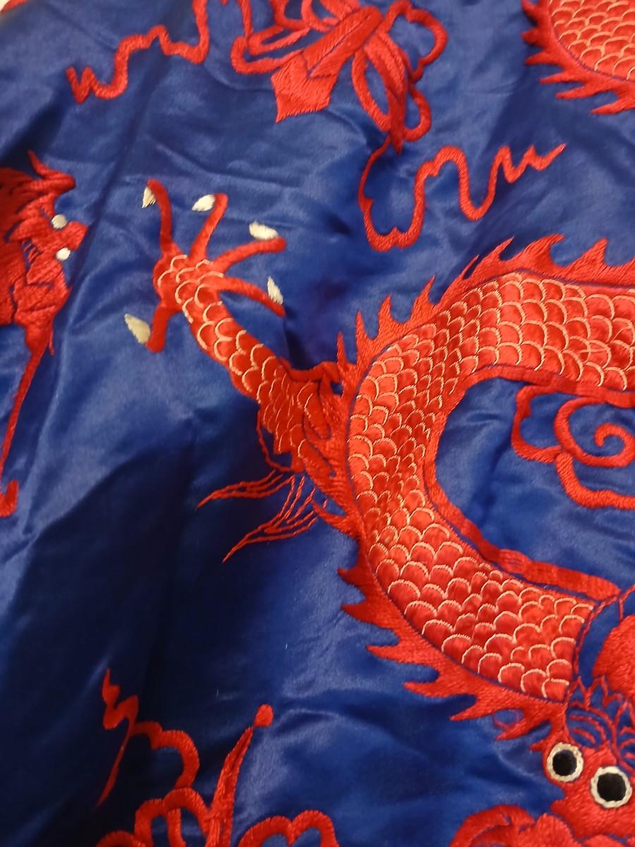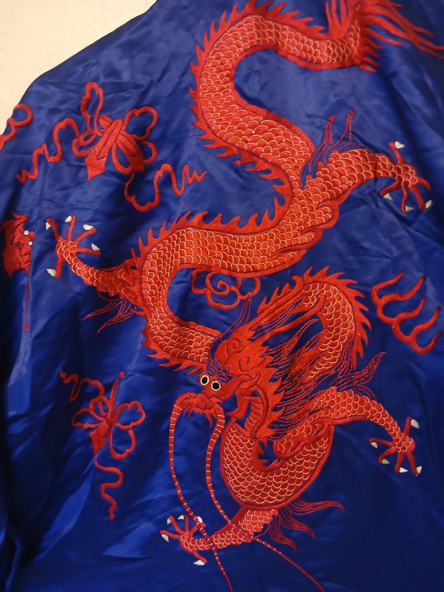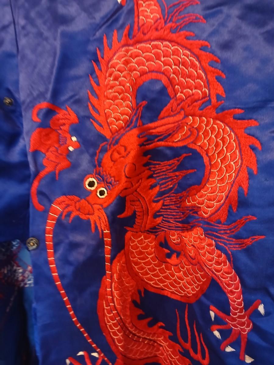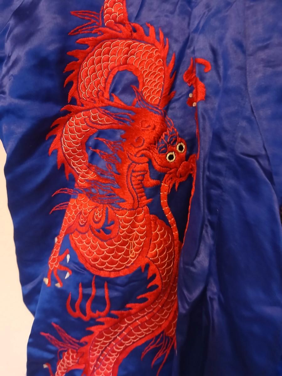 Vintage Japanese Kimono Blue Silk Embroidered Red Dragons with gold coin purse and embroidered art cloth