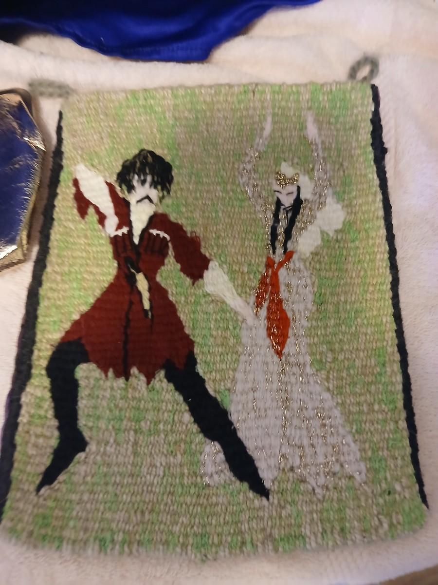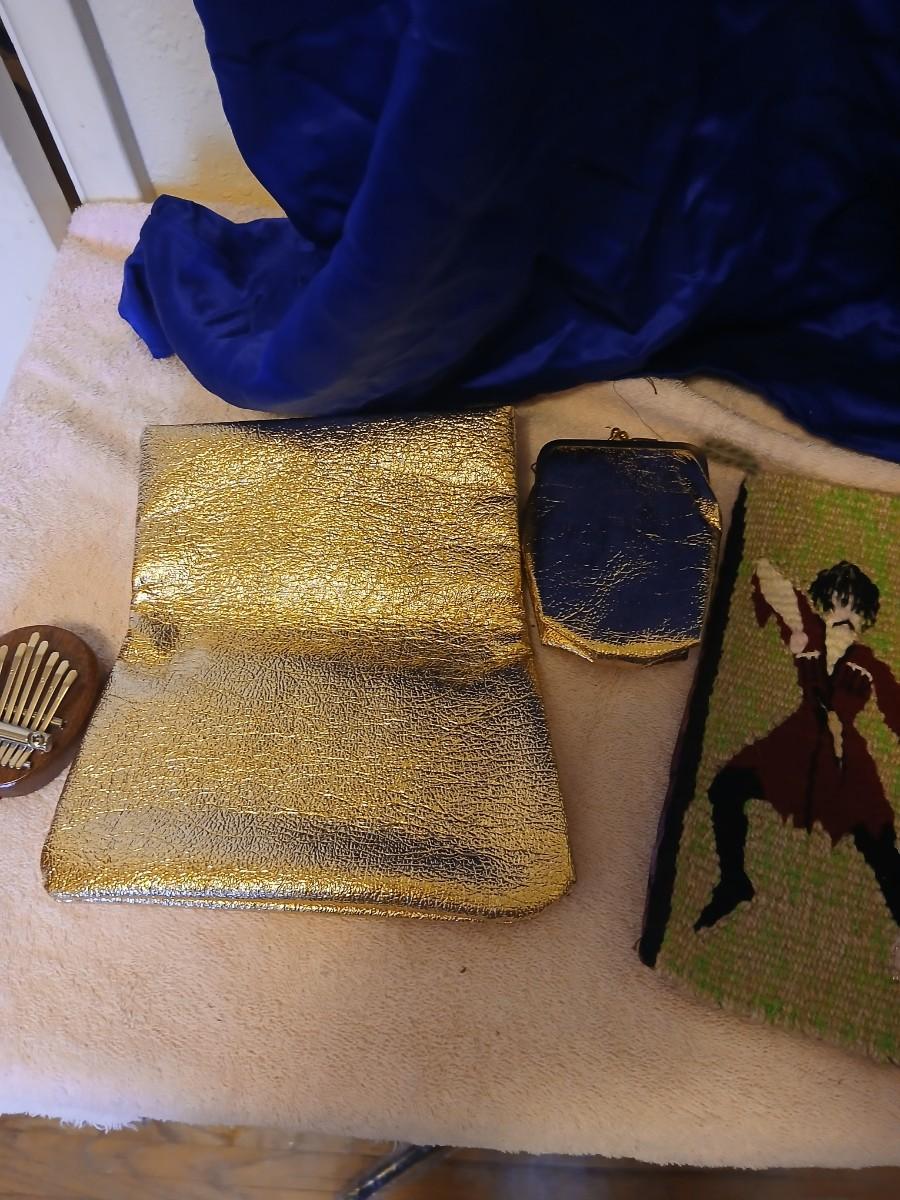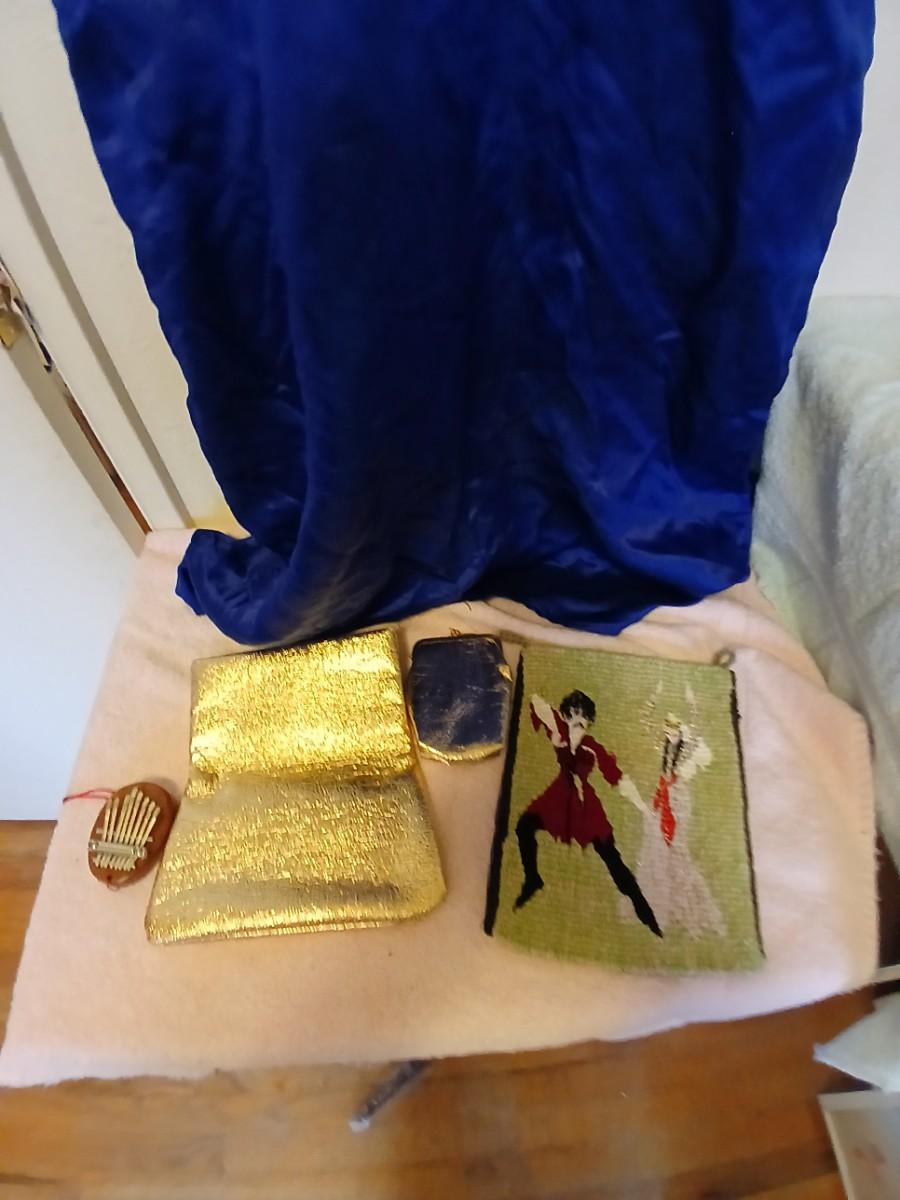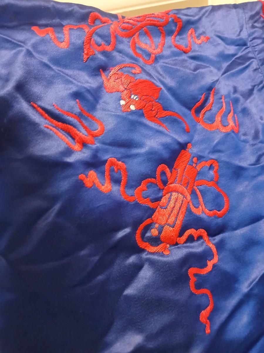 Vintage Japanese Kimono Blue Silk Embroidered Red Dragons with gold coin purse and embroidered art cloth