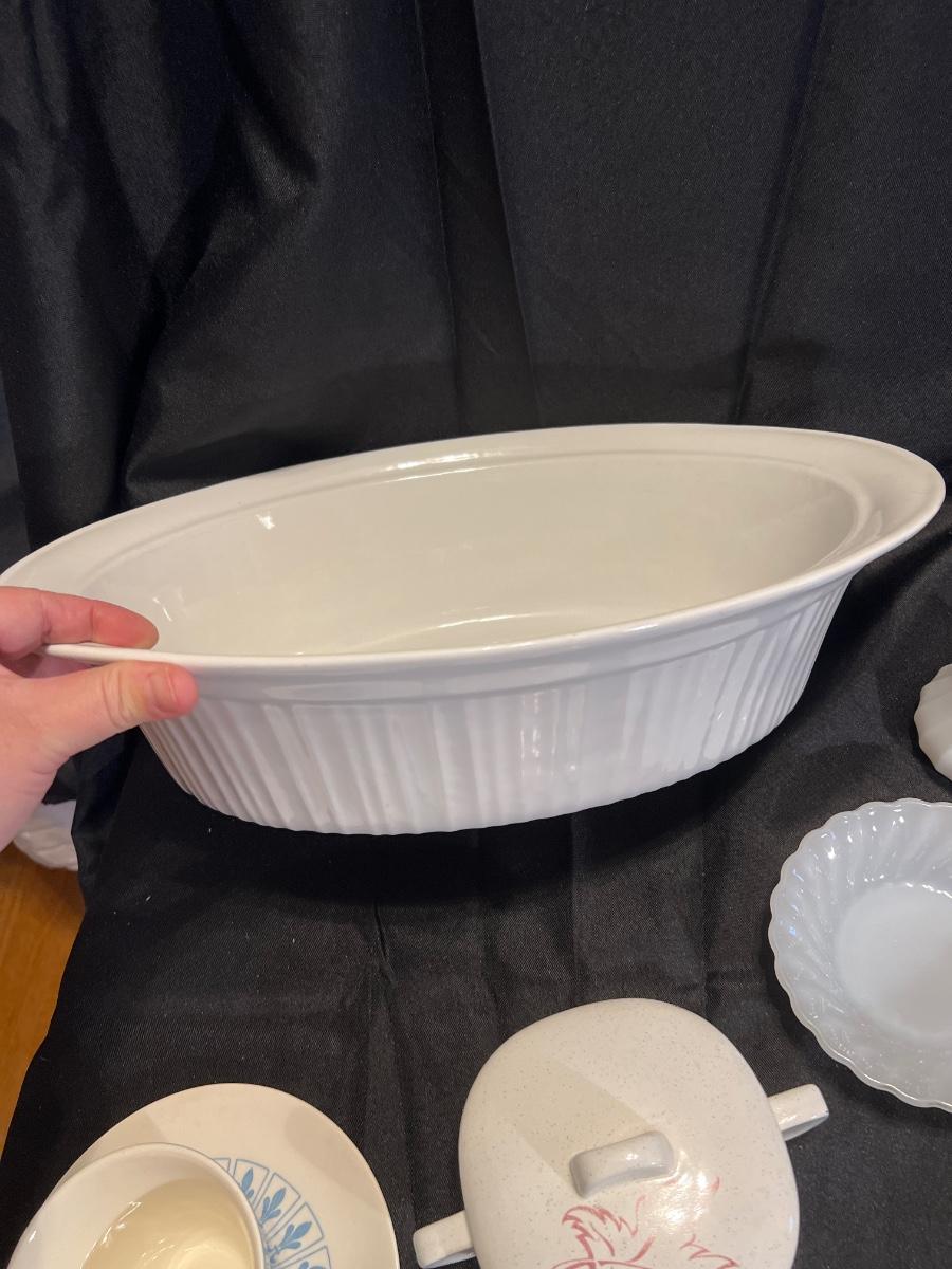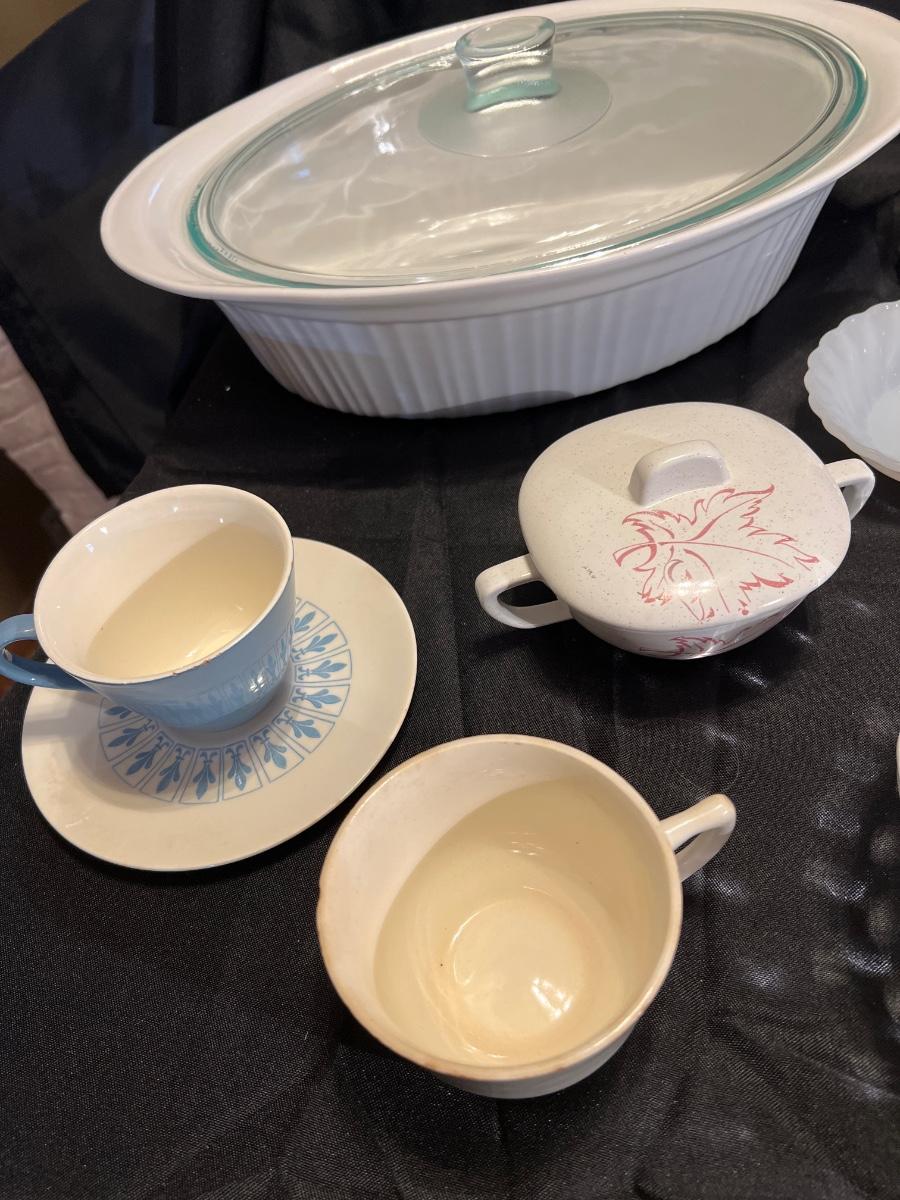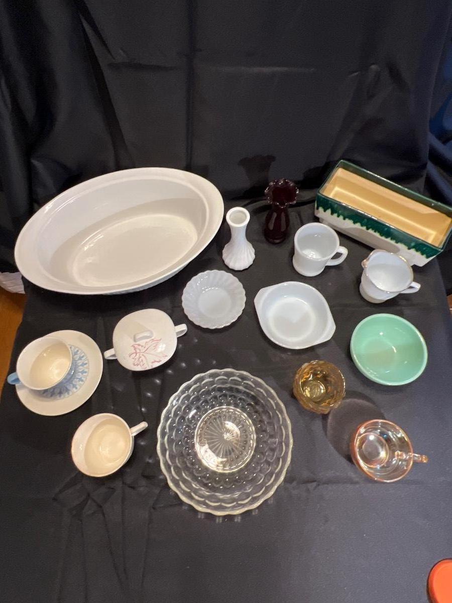 4 pieces of vintage Fire King glass (2 bowls and 2 cups. An Anchor Hocking bowl. 4 quart CorningWare oval bowl. Vintage Sugar bowl. Vintage cups. 2 Vases and a ceramic planter.