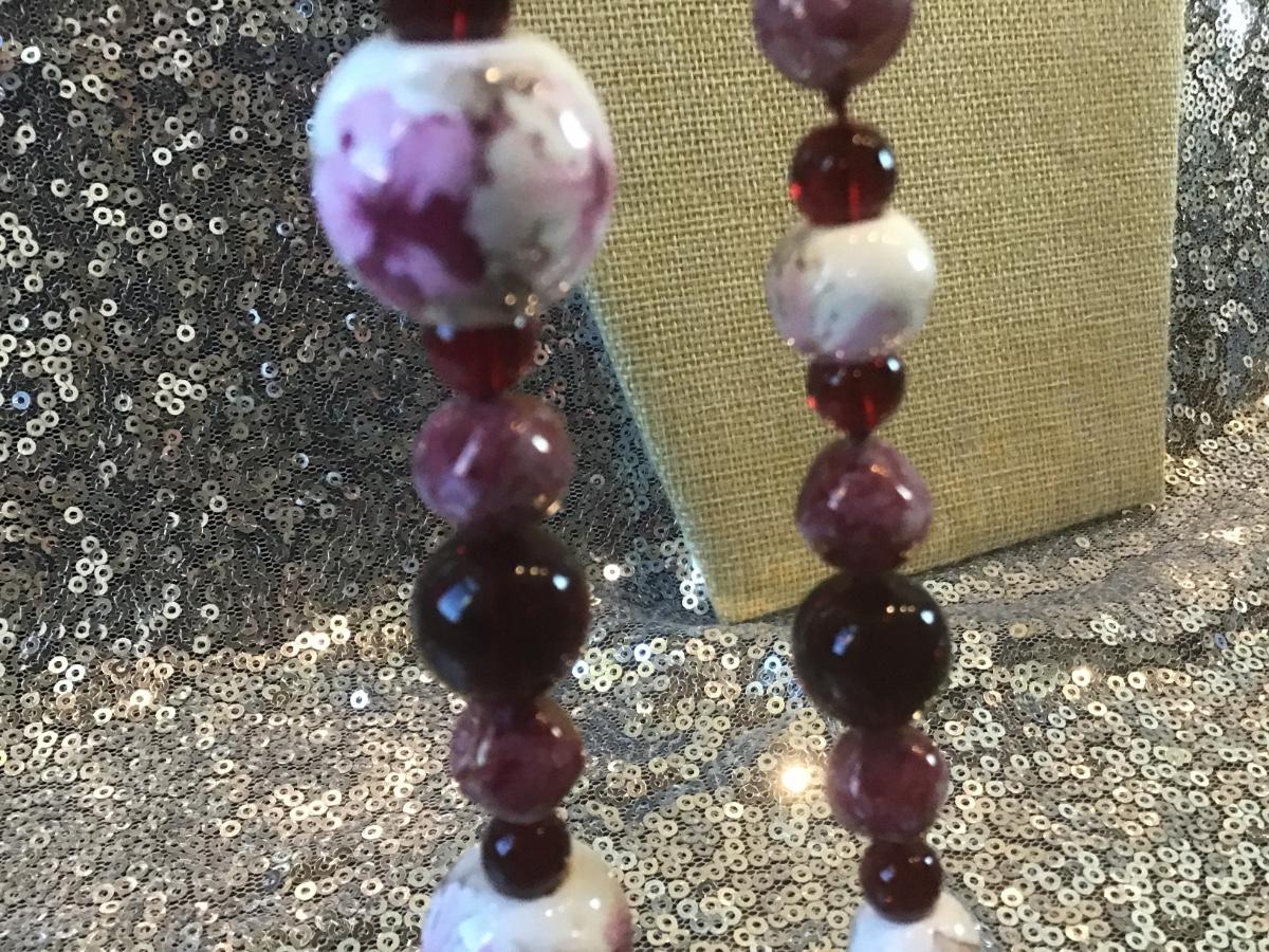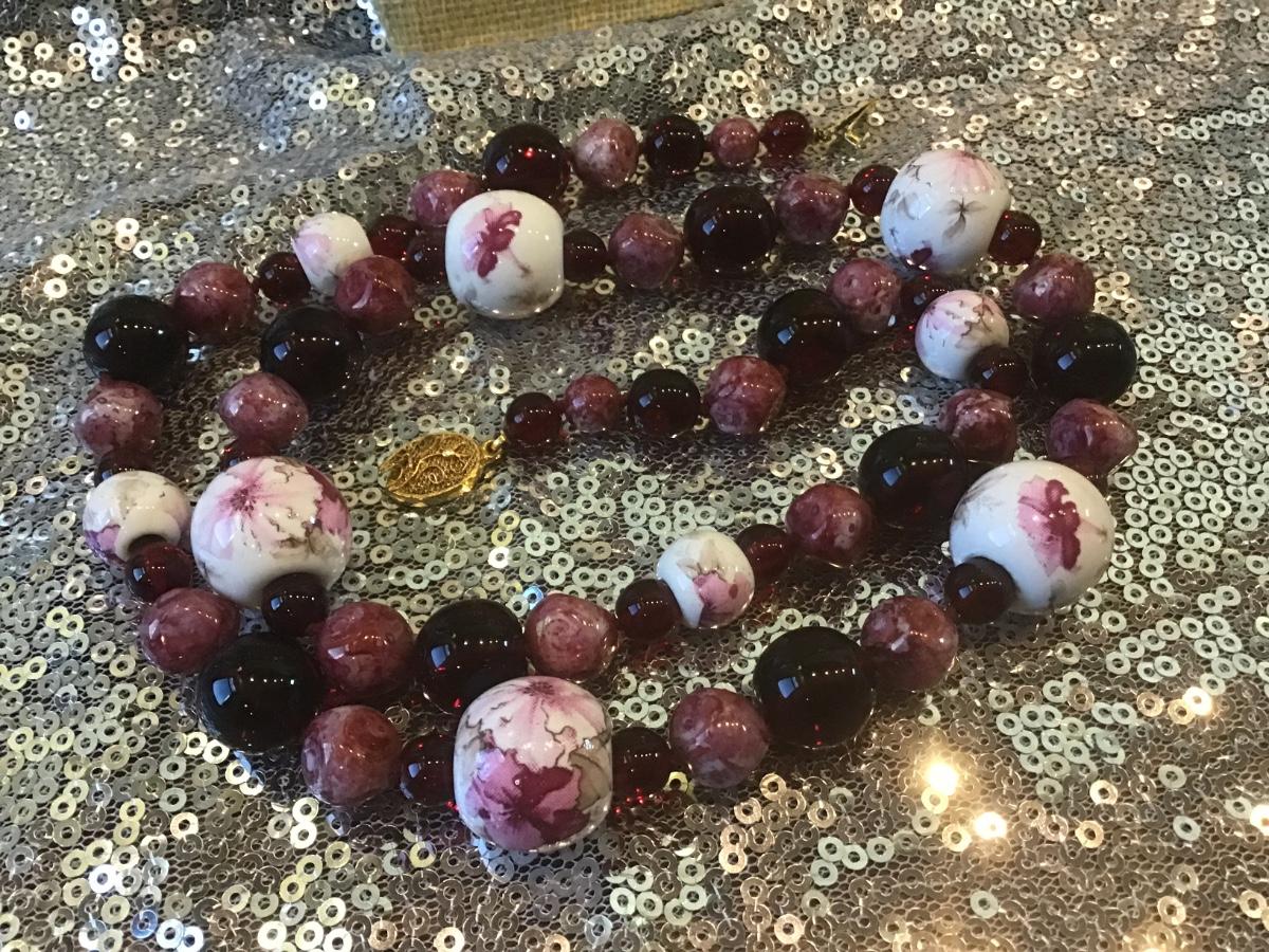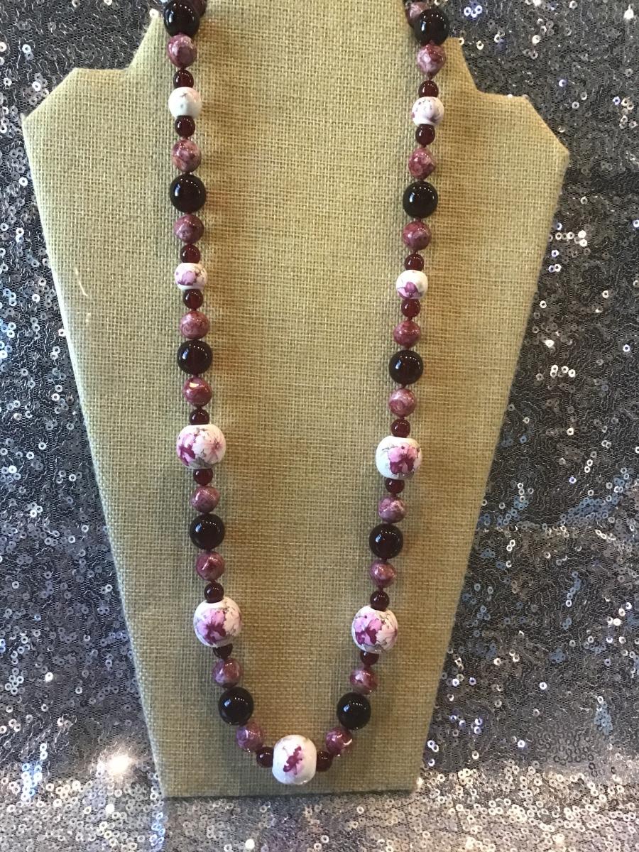 Vintage Knotted Red Purple Garnet Color With Porcelain Flower Bead Necklace 26”