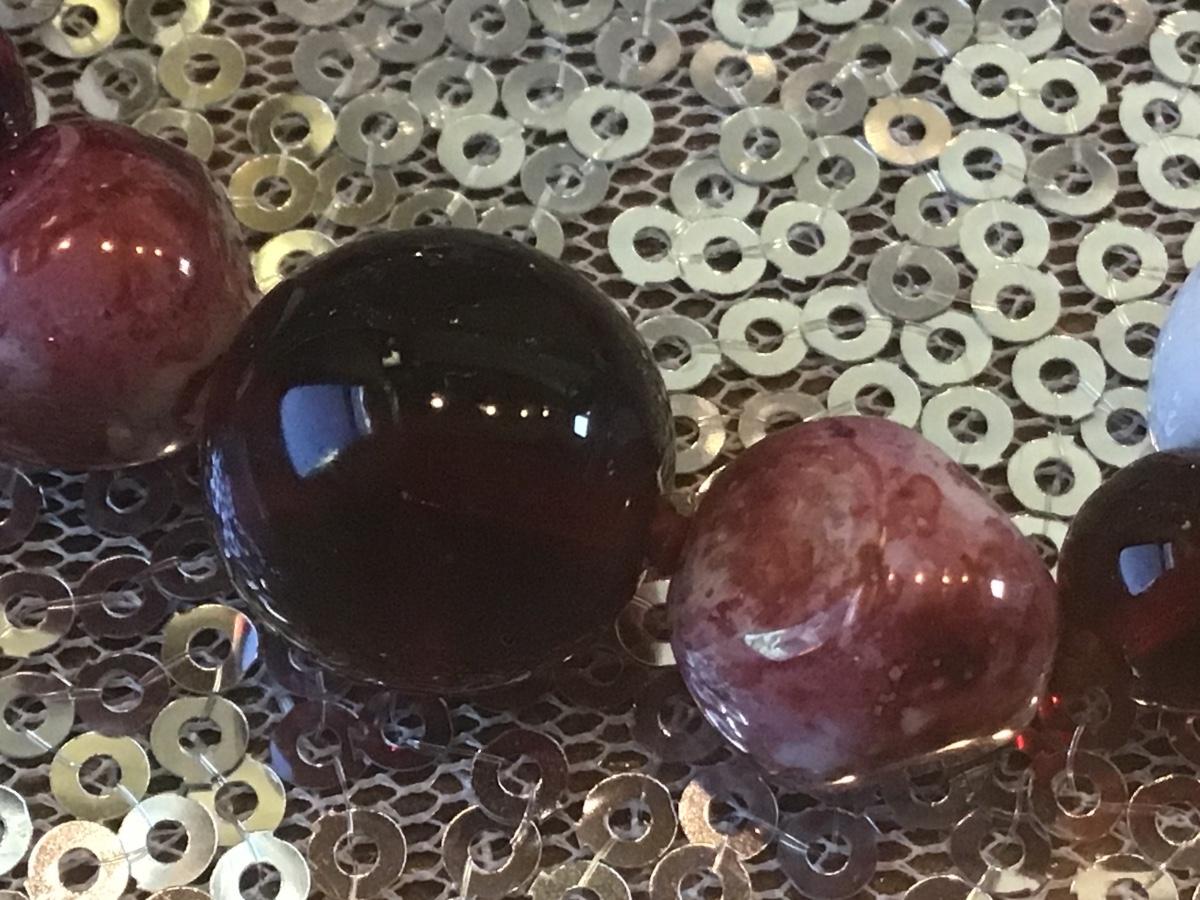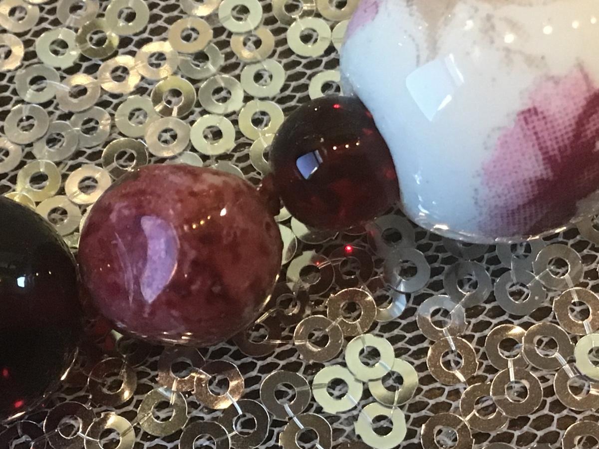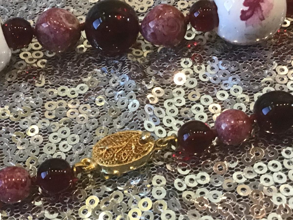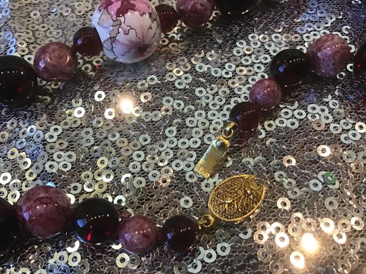 Vintage Knotted Red Purple Garnet Color With Porcelain Flower Bead Necklace 26”