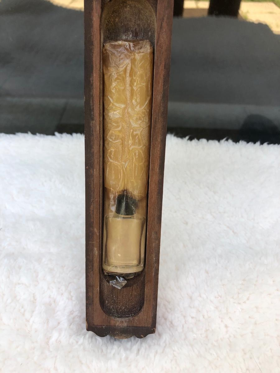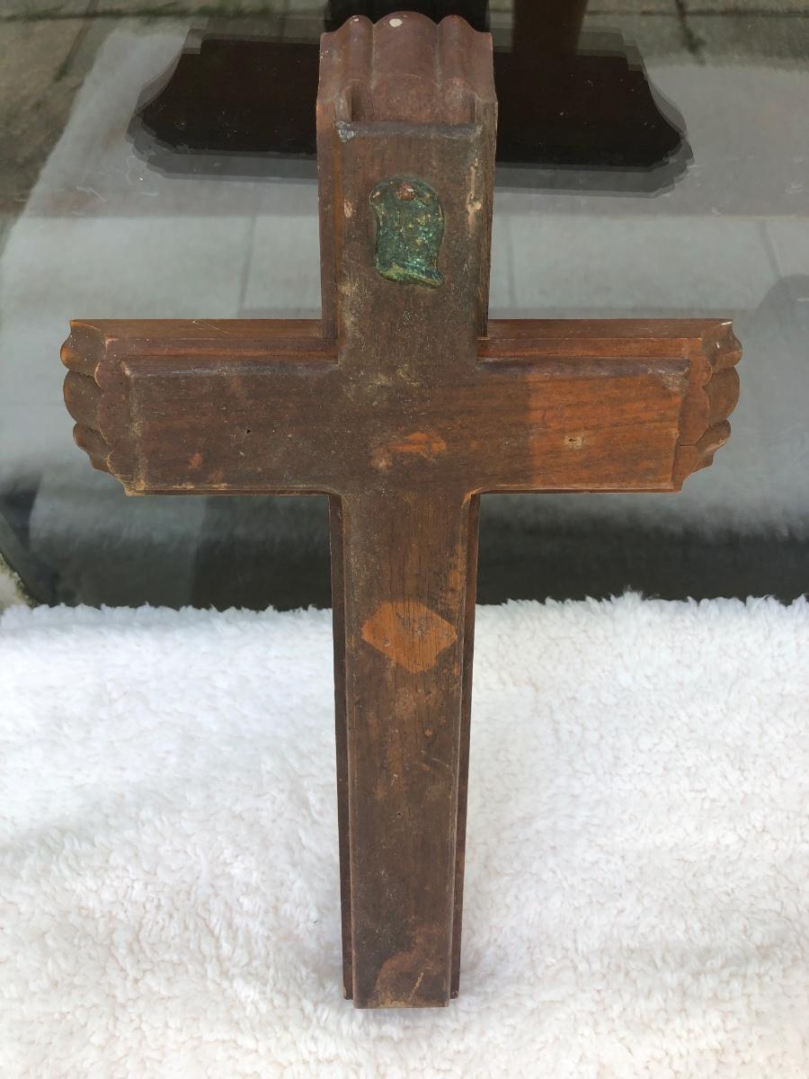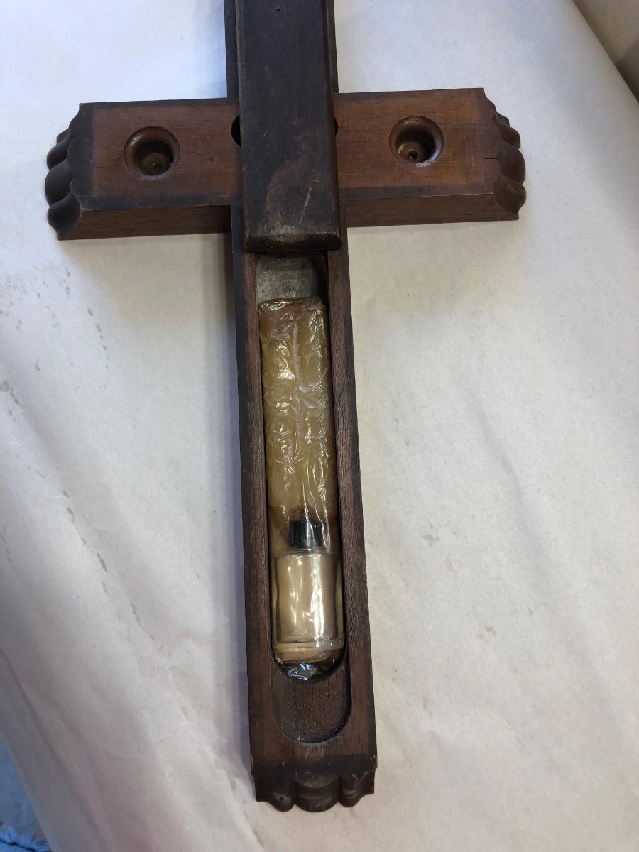 Old wood last rites sick call cross. Front slides open with unopened holy water, 2 candles and “what to do in case of serious illness” instructions. Small wax hanging religious decor.