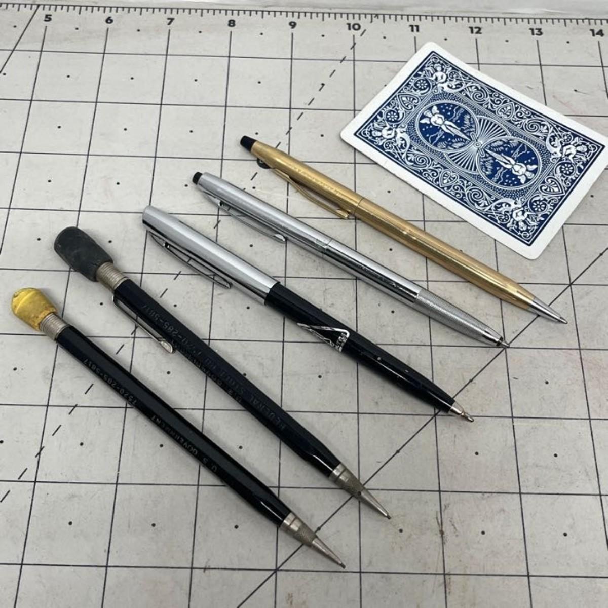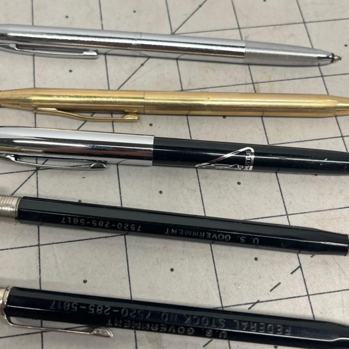 Assorted classic metal pens including U.S. Government issue and retro branded ballpoint designs.
