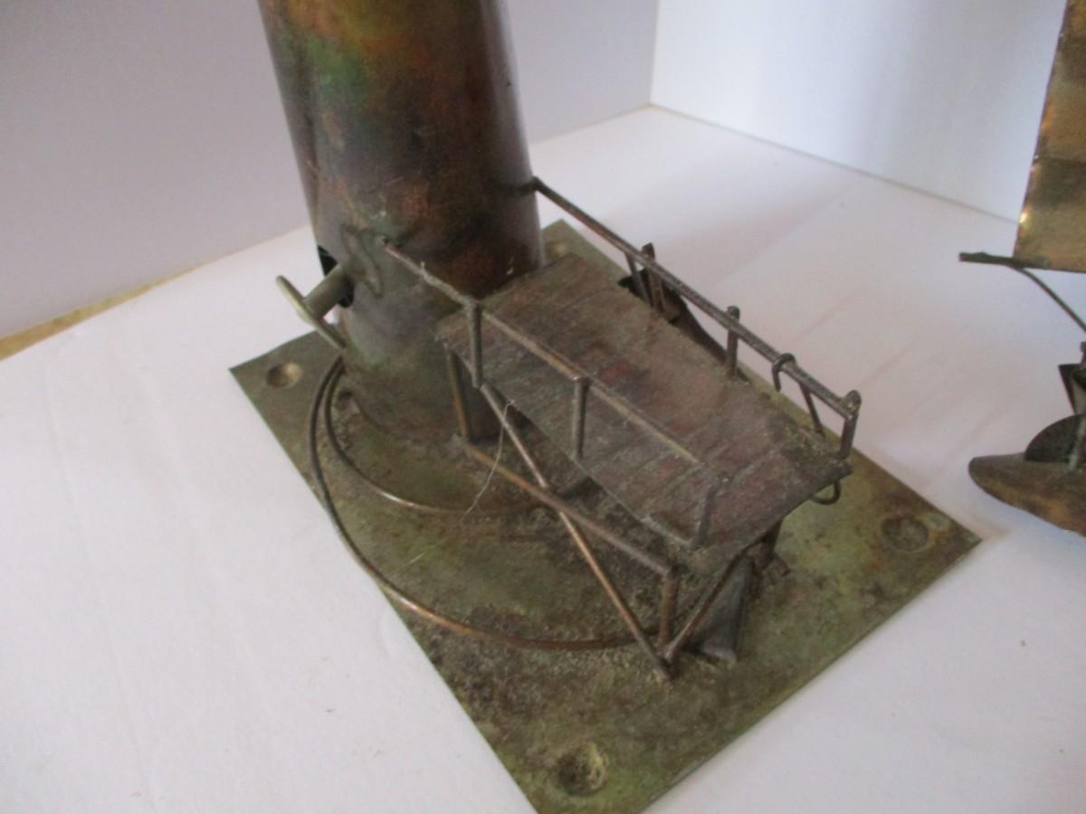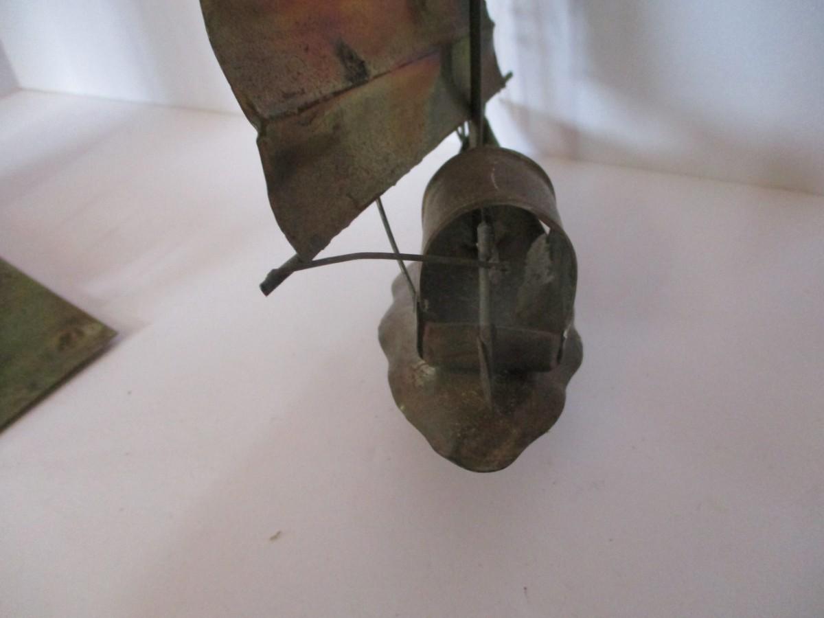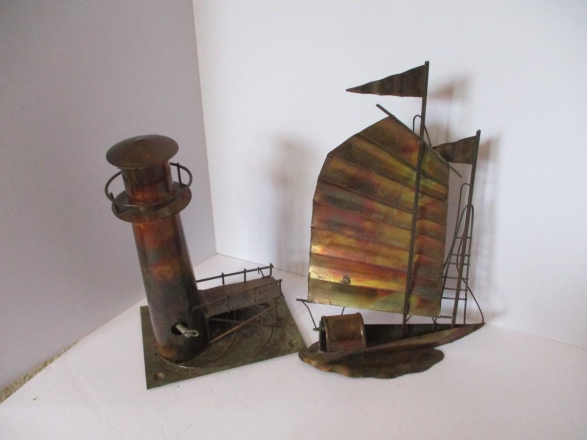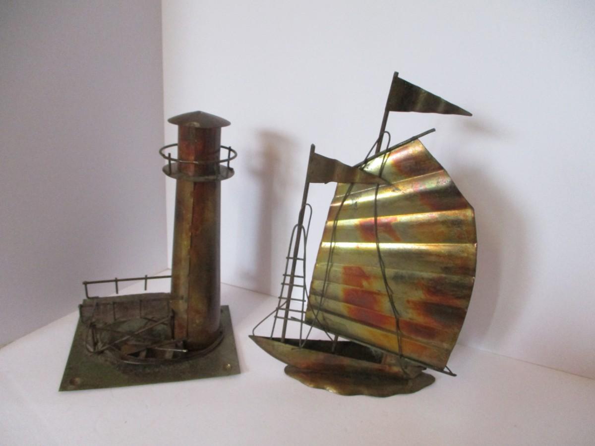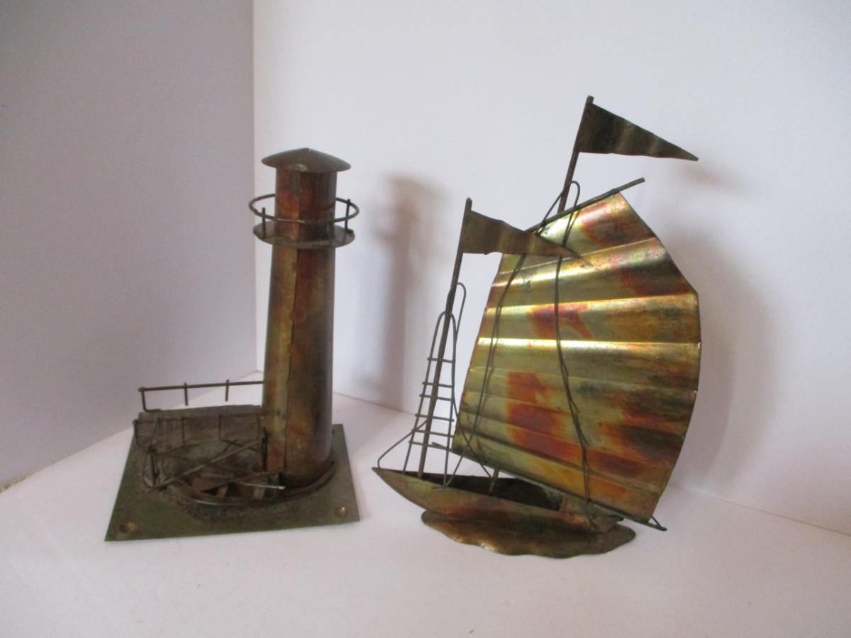 Vintage Metal Brass Sailing Ship & Lighthouse Sculptures