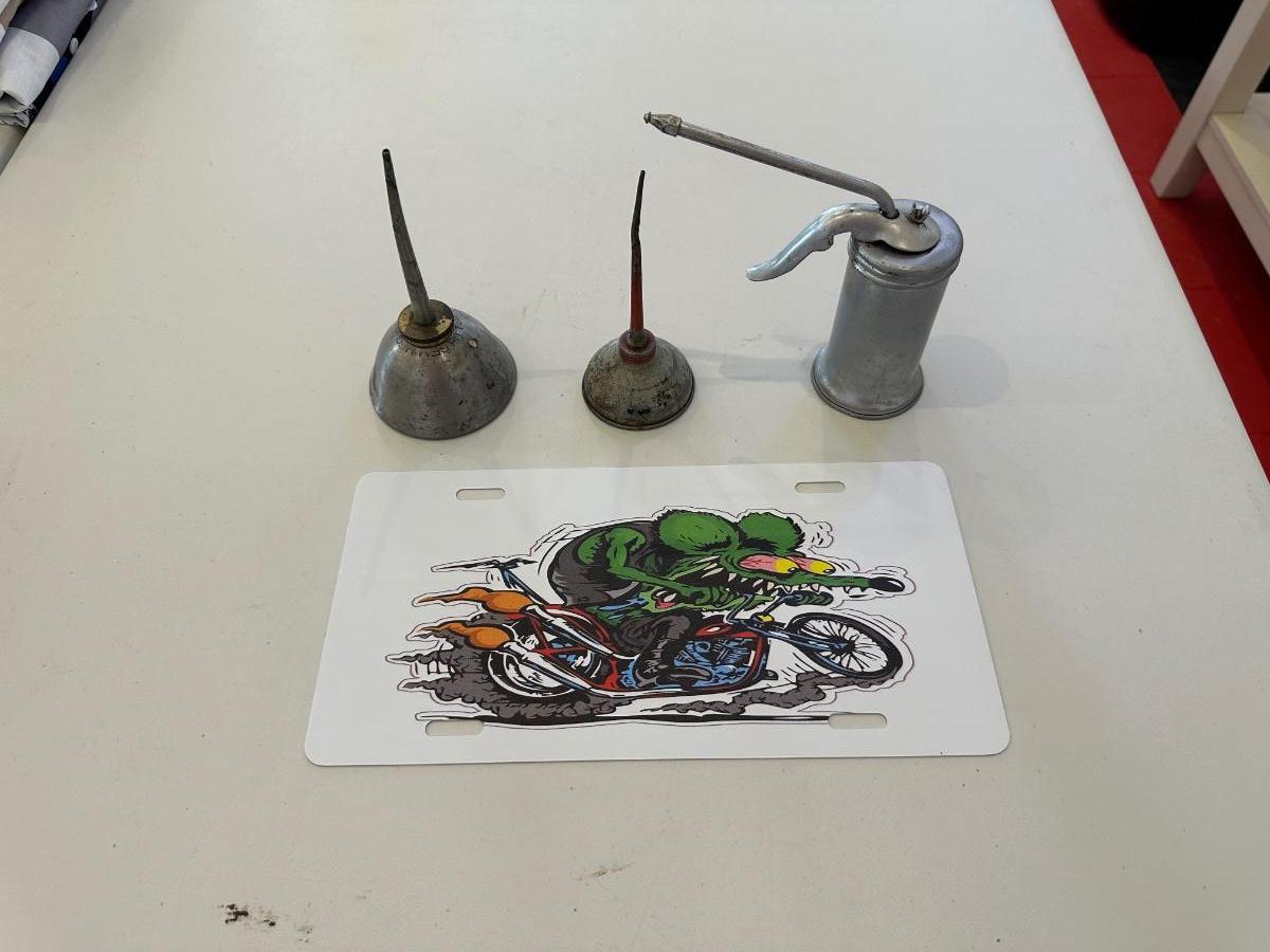 VINTAGE OIL CANS AND RAT FINK LICENSE PLATE