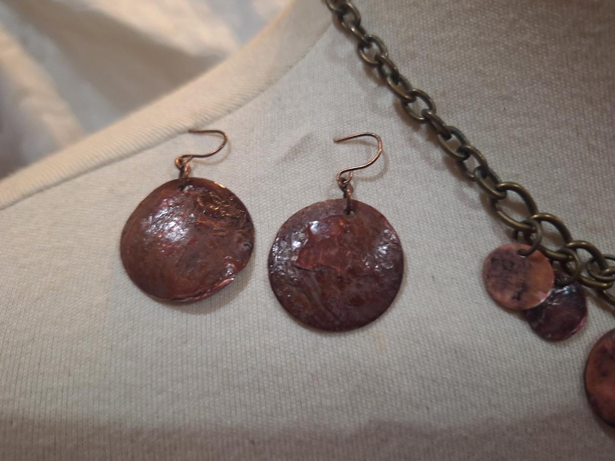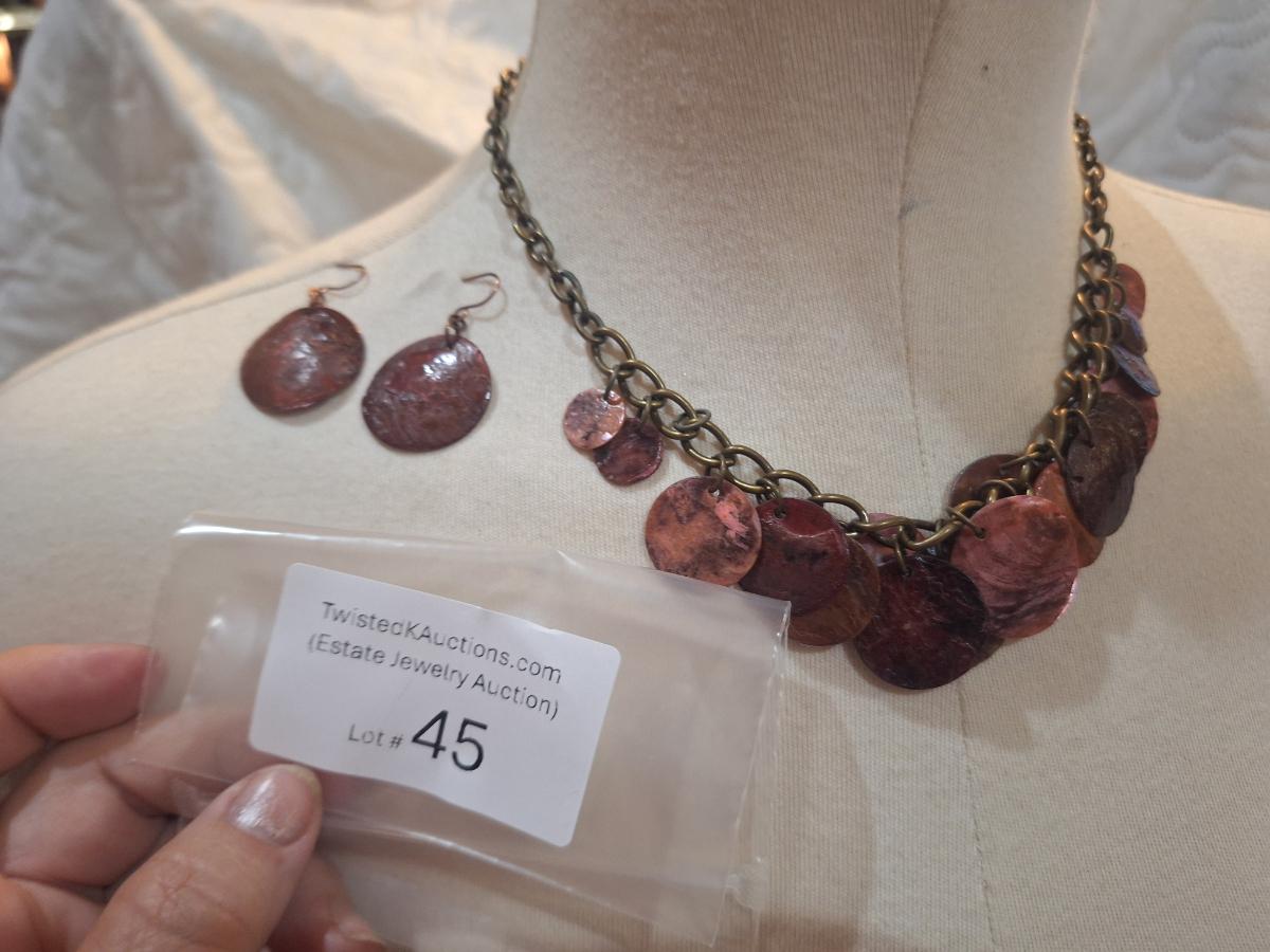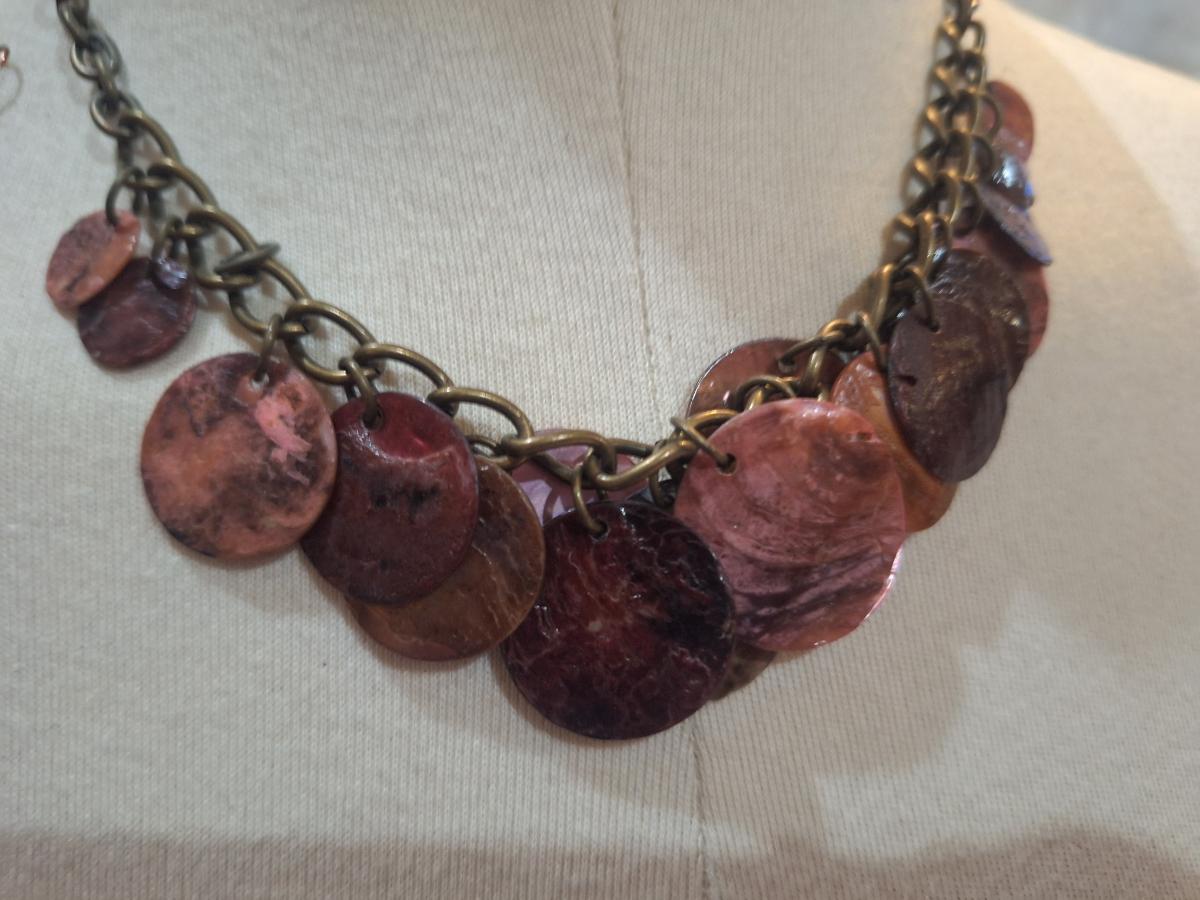 vintage pink Capiz shell coin disc collar statement necklace with matching earrings.