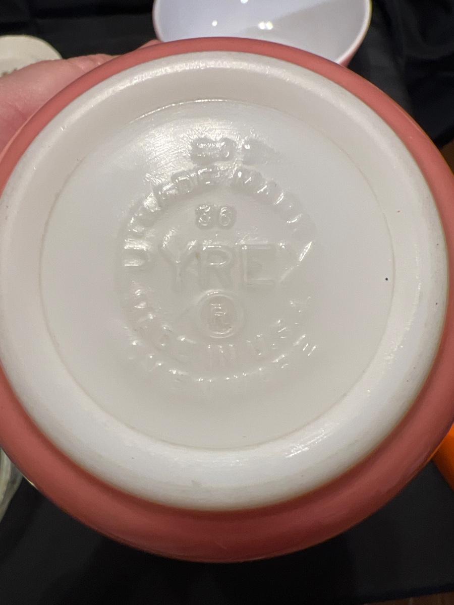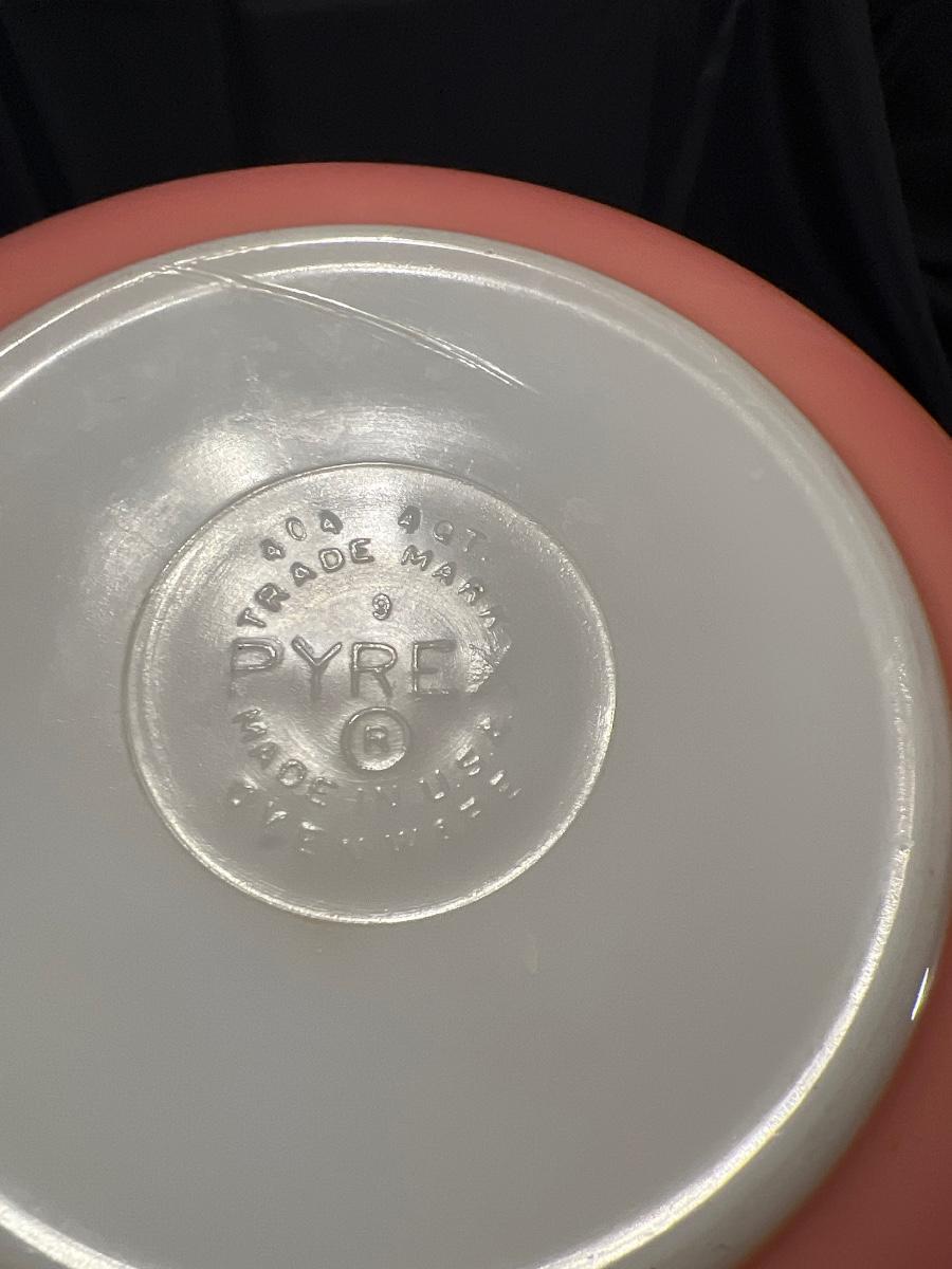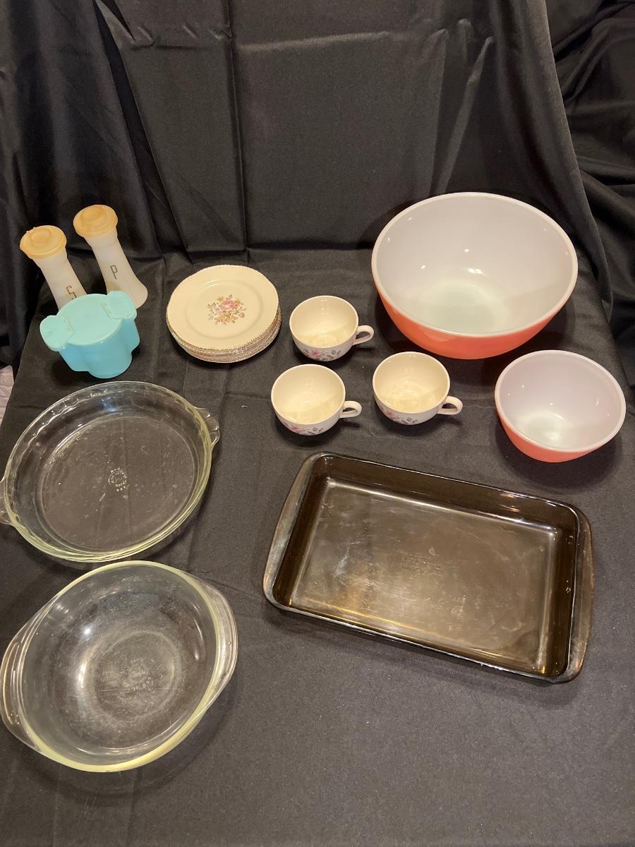 Vintage pink bowls, pie plate, bowl, casserole dish, 3 of the plates have a tiny chip in each, see pictures, the salt shaker is missing its lid.