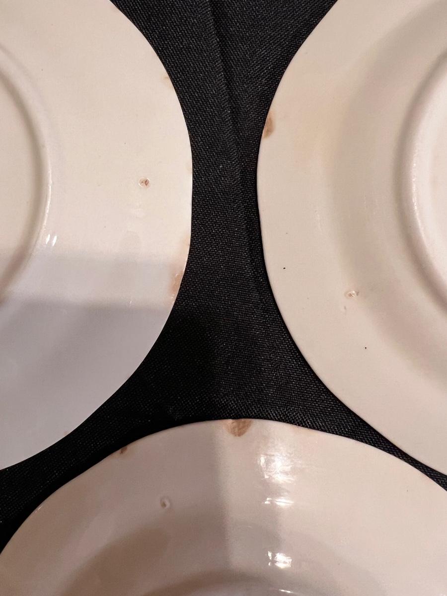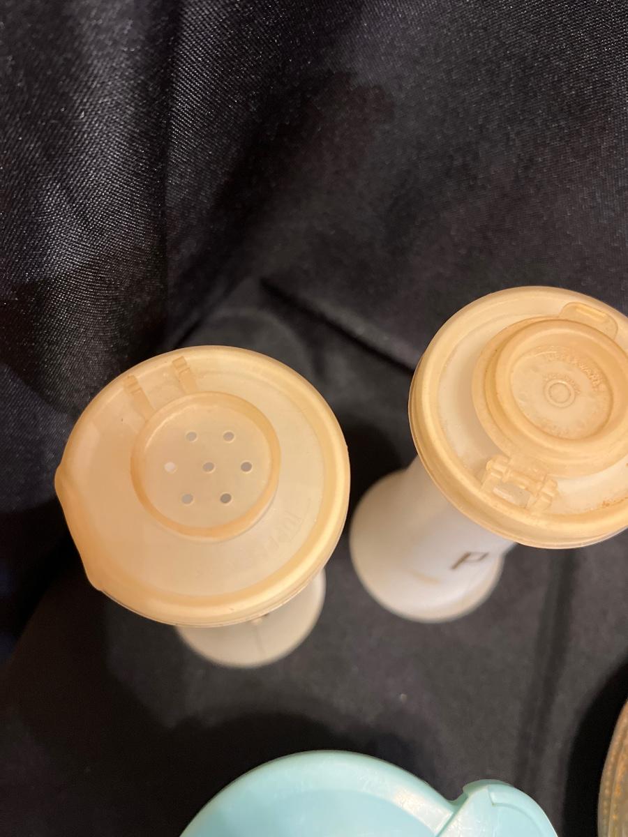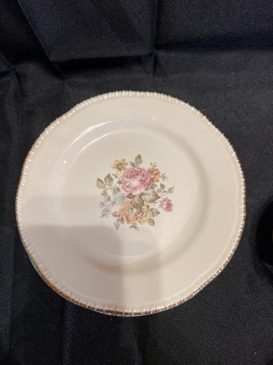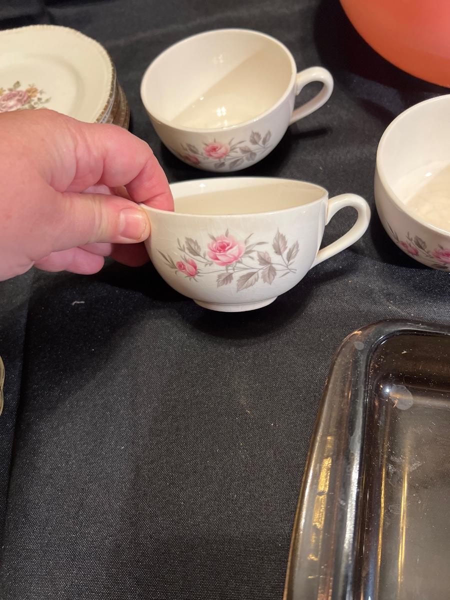 Vintage pink bowls, pie plate, bowl, casserole dish, 3 of the plates have a tiny chip in each, see pictures, the salt shaker is missing its lid.