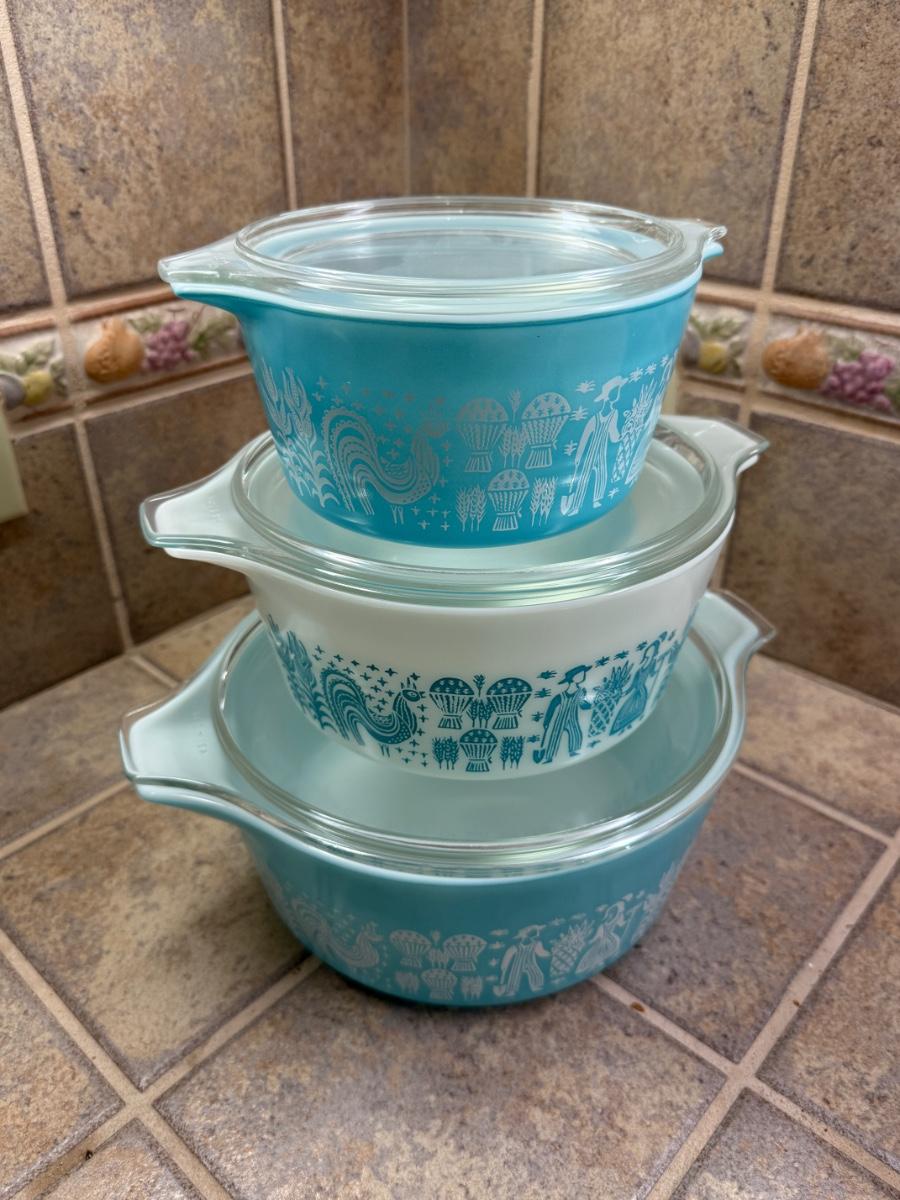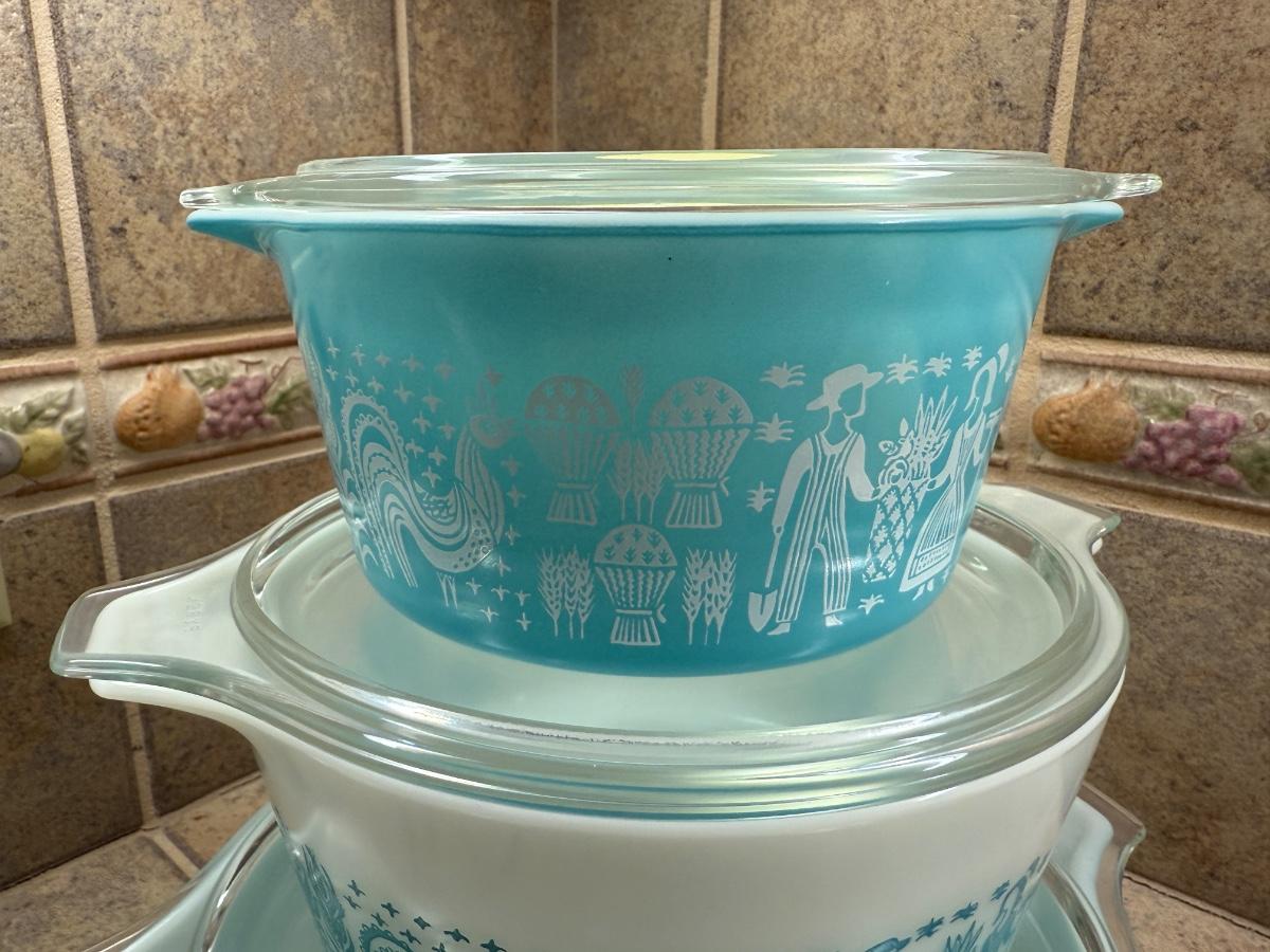 Vintage Pyrex Casserole/baking dishes w/lids US Made Pilgrim pattern