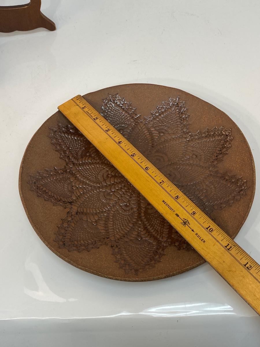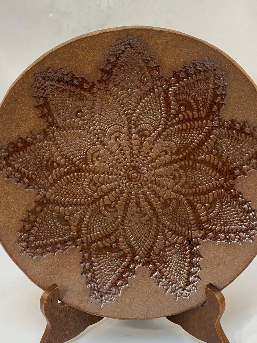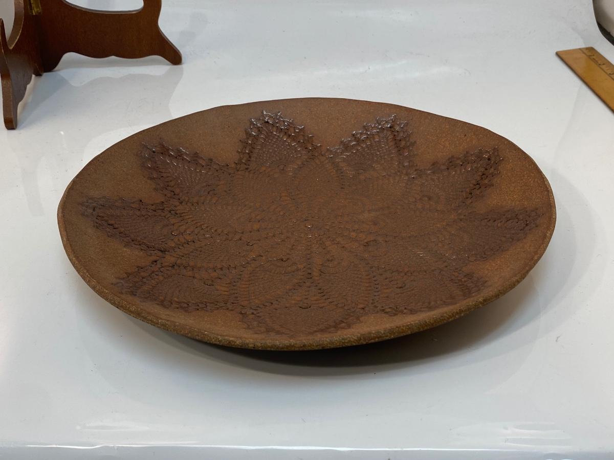 Vintage Retro Mandala Flower Stamped Stoneware Brown Clay Pottery Plate Medallion Console Dish