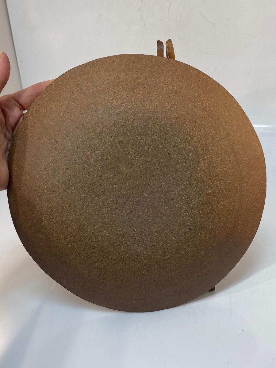 Vintage Retro Mandala Flower Stamped Stoneware Brown Clay Pottery Plate Medallion Console Dish. Beautifully crafted, natural clay with a glazed mandala flower design. Unsigned. In good condition, no chips or damage. About 11" diameter.