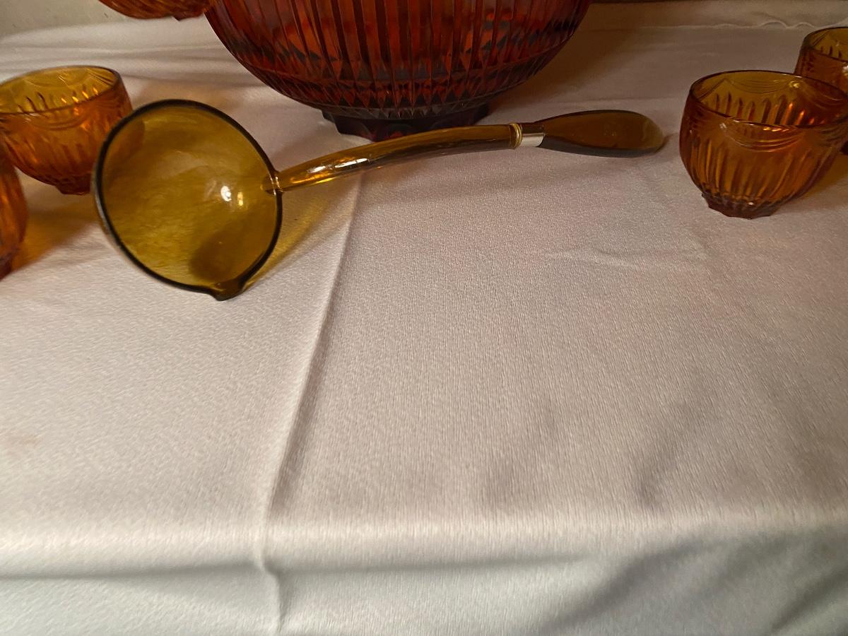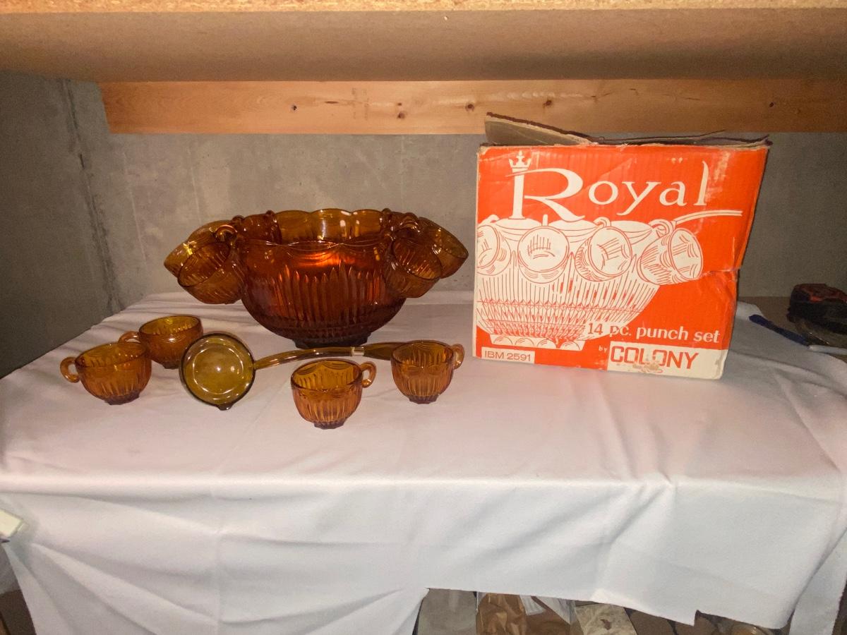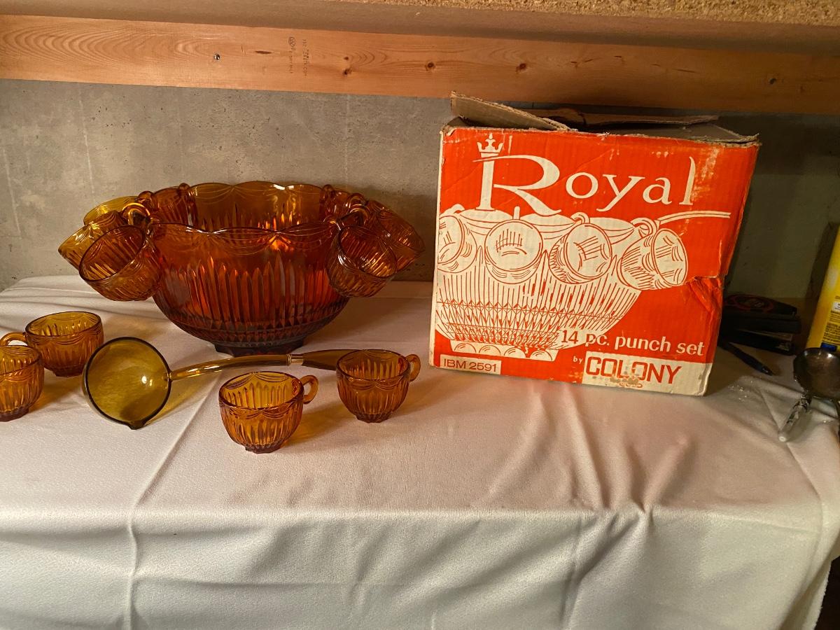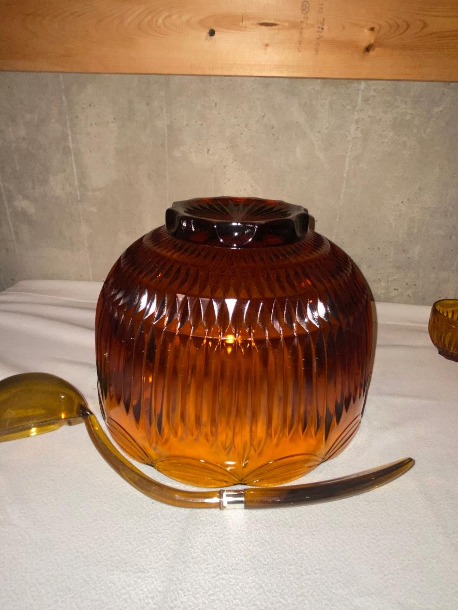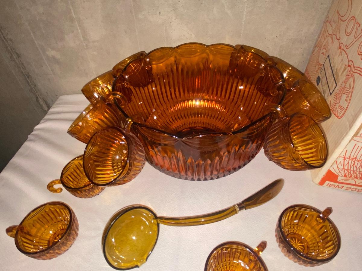 VINTAGE ROYAL AMBER GLASS PUNCH BOWL, CUPS, AND LADLE