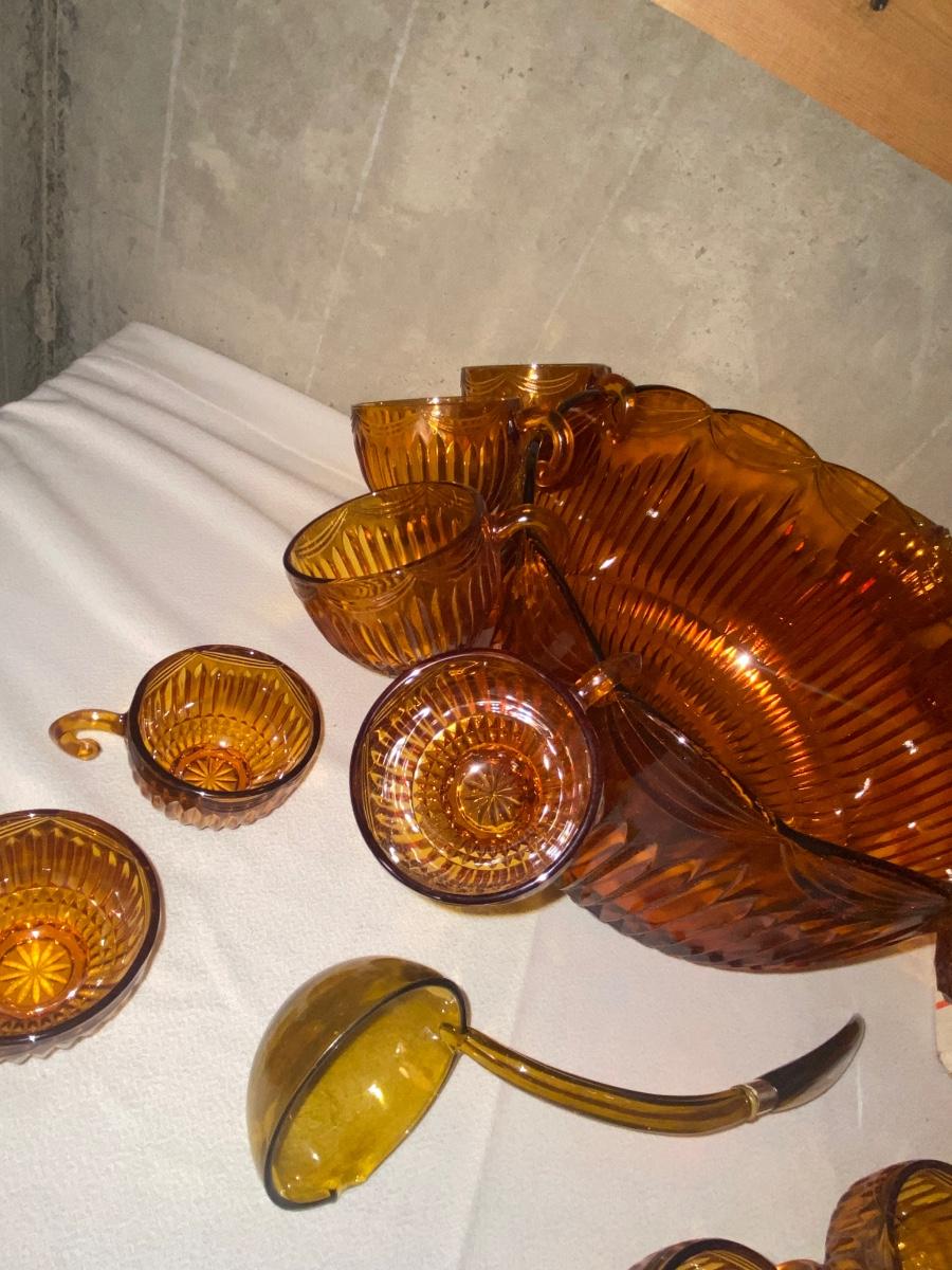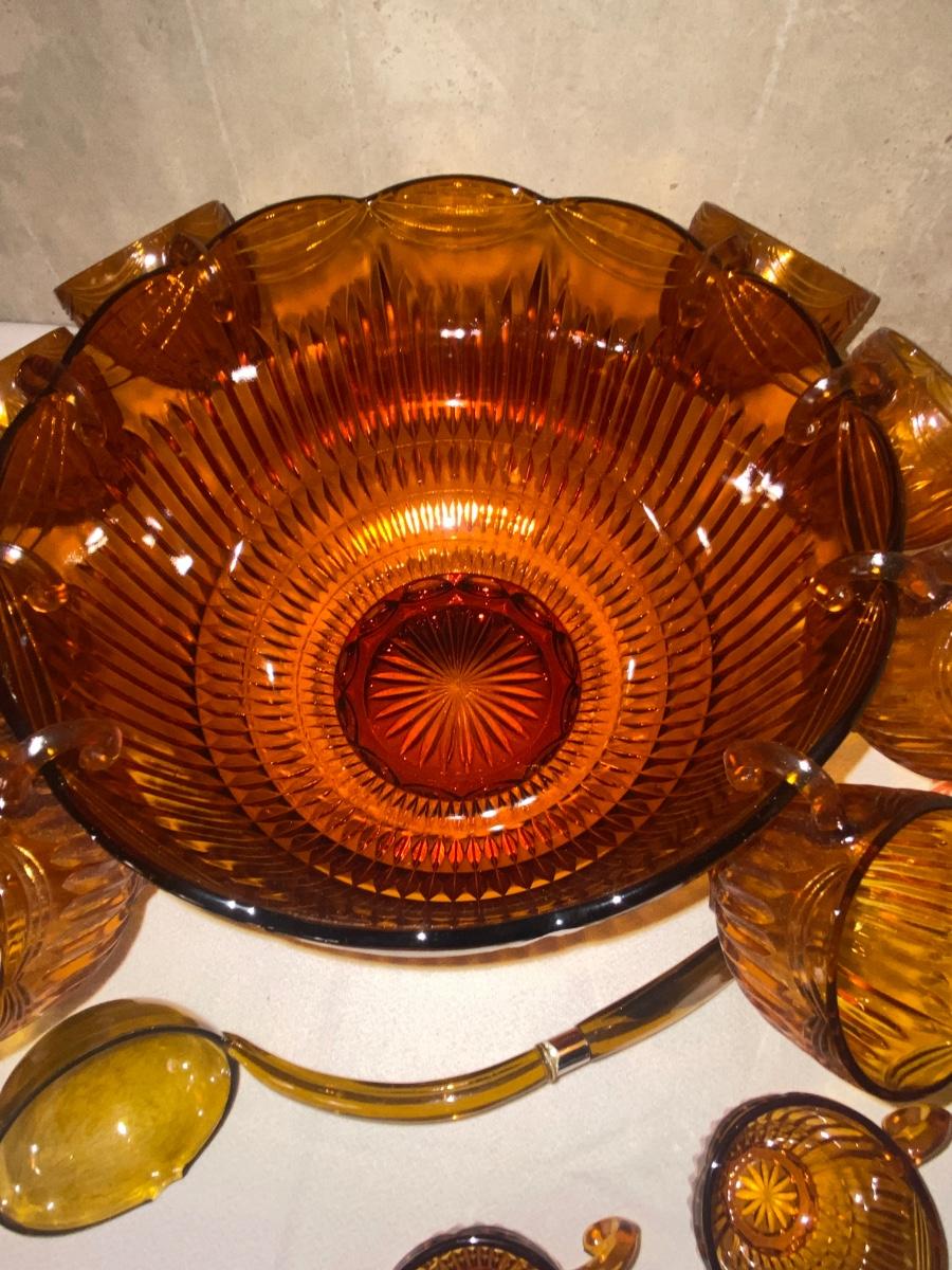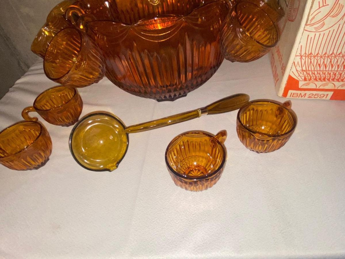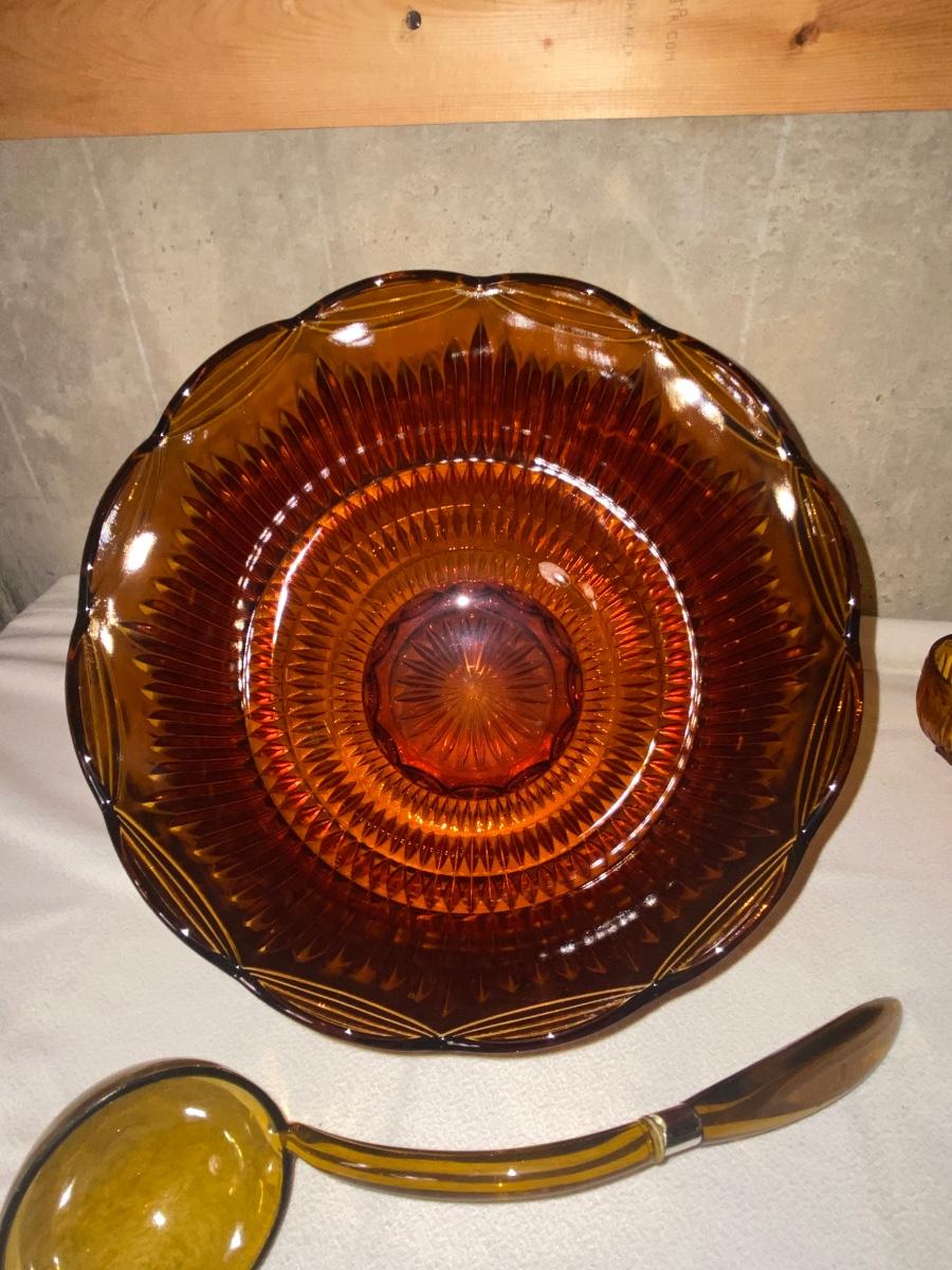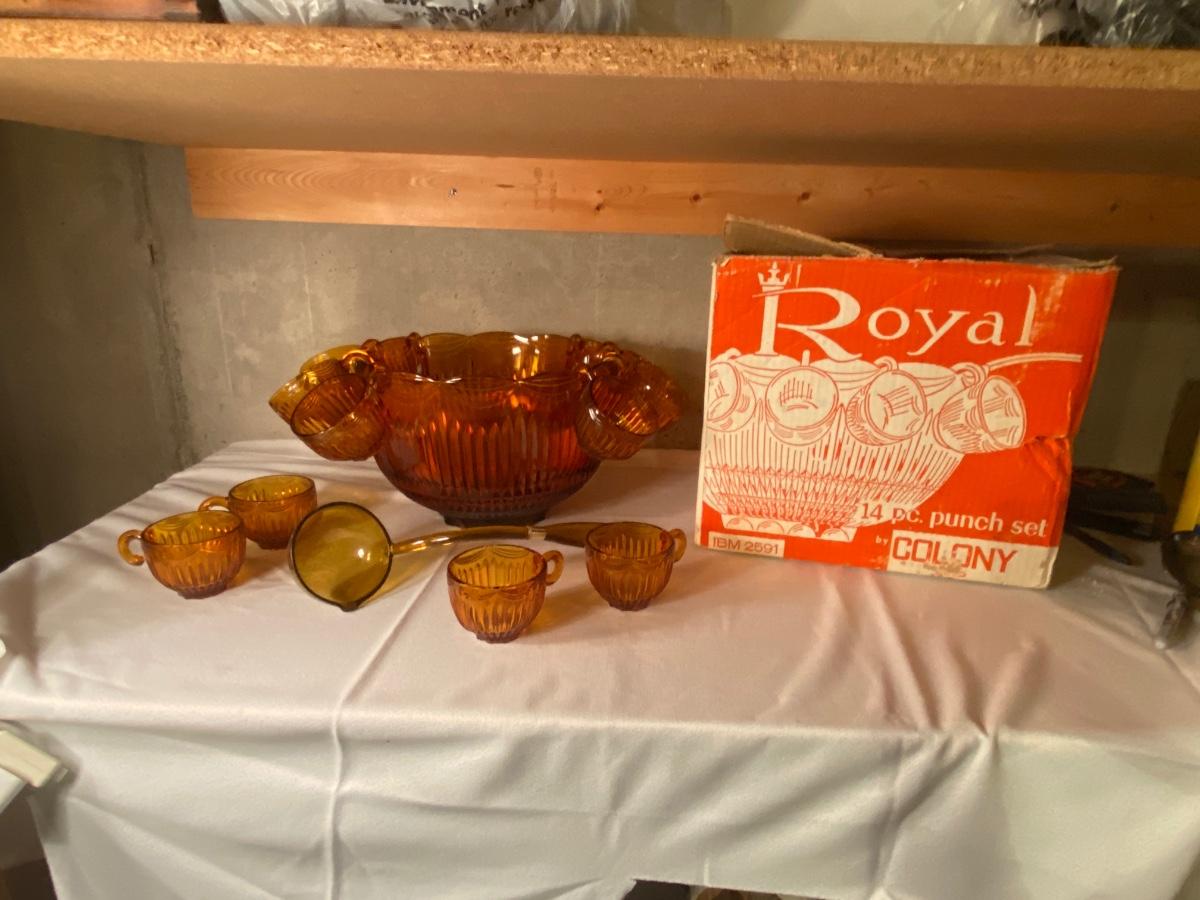 VINTAGE ROYAL AMBER GLASS PUNCH BOWL, CUPS, AND LADLE