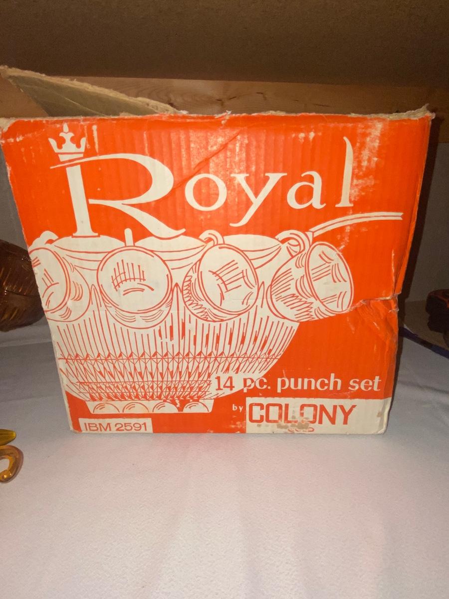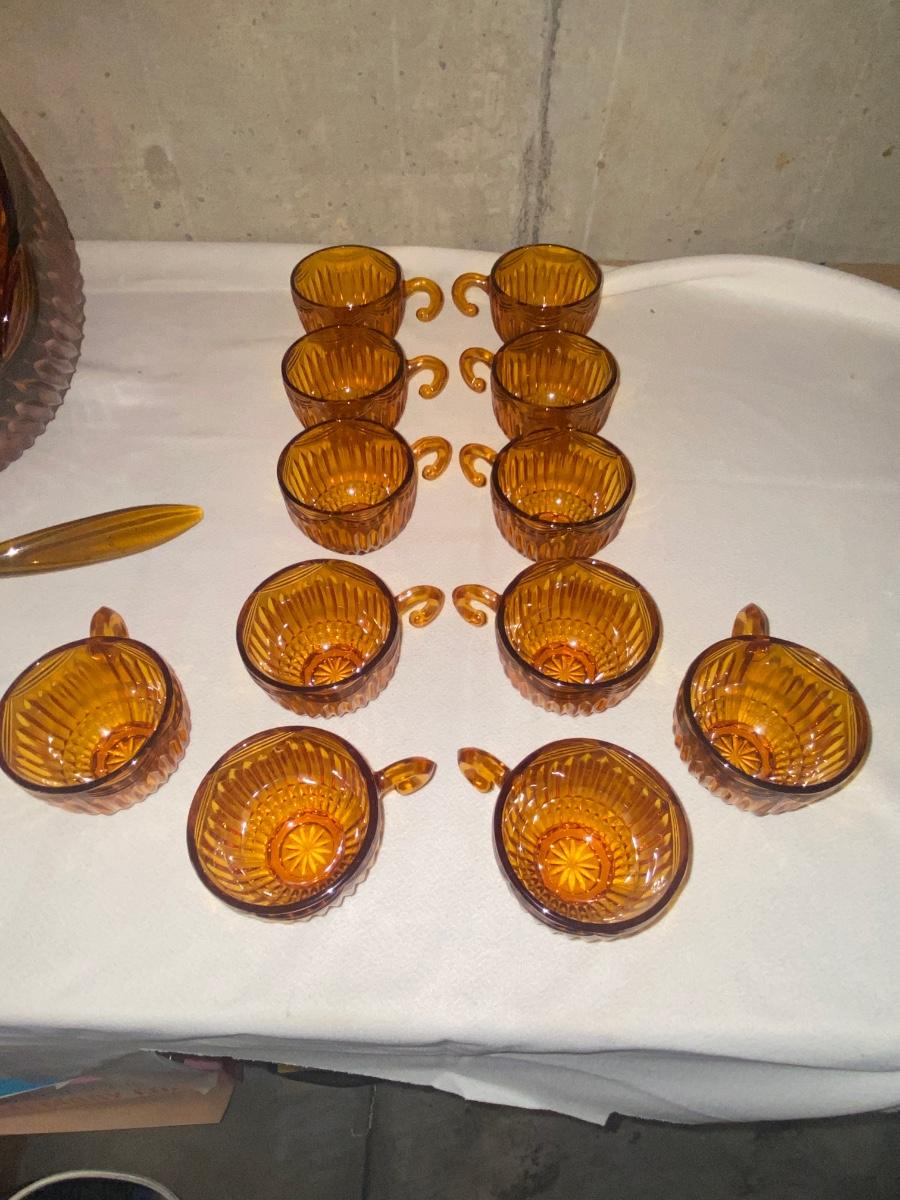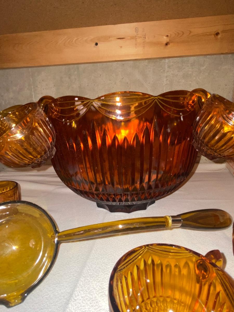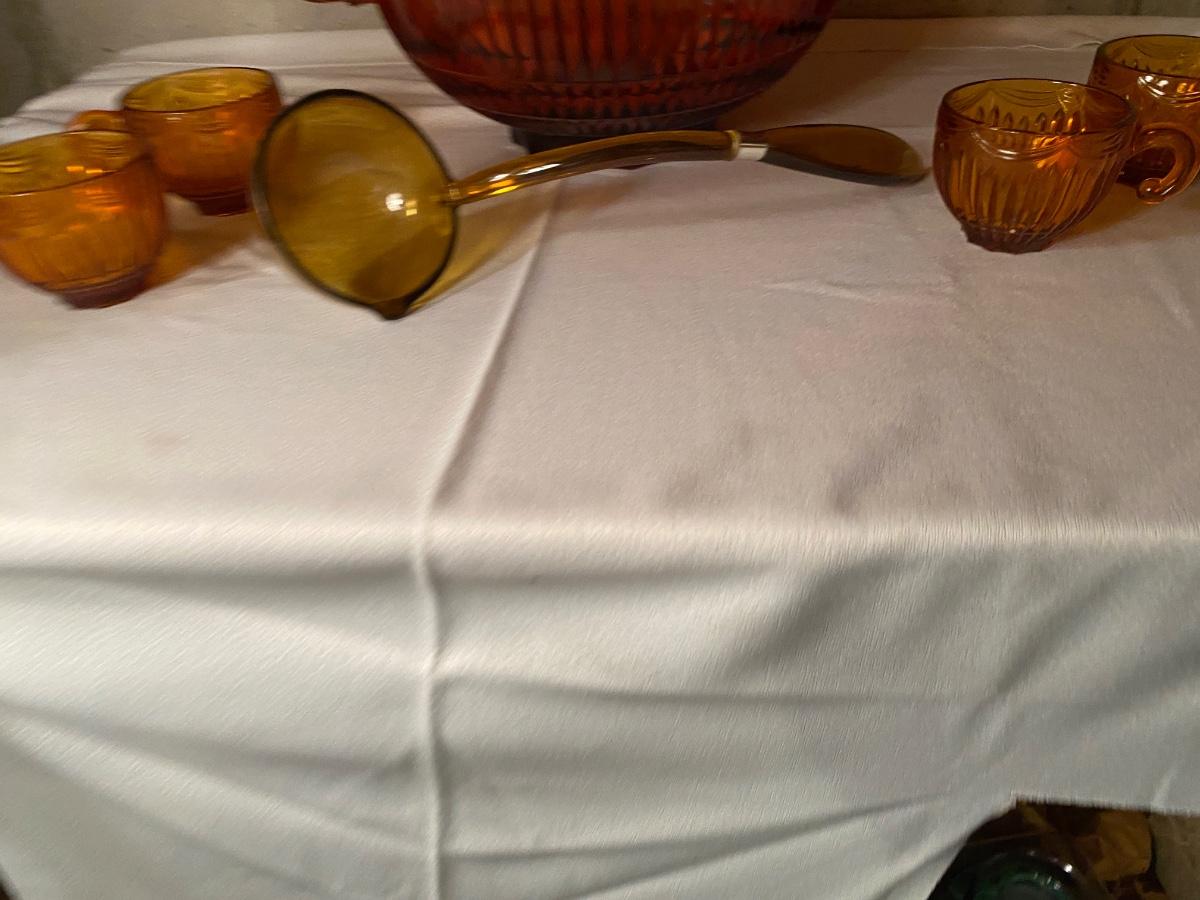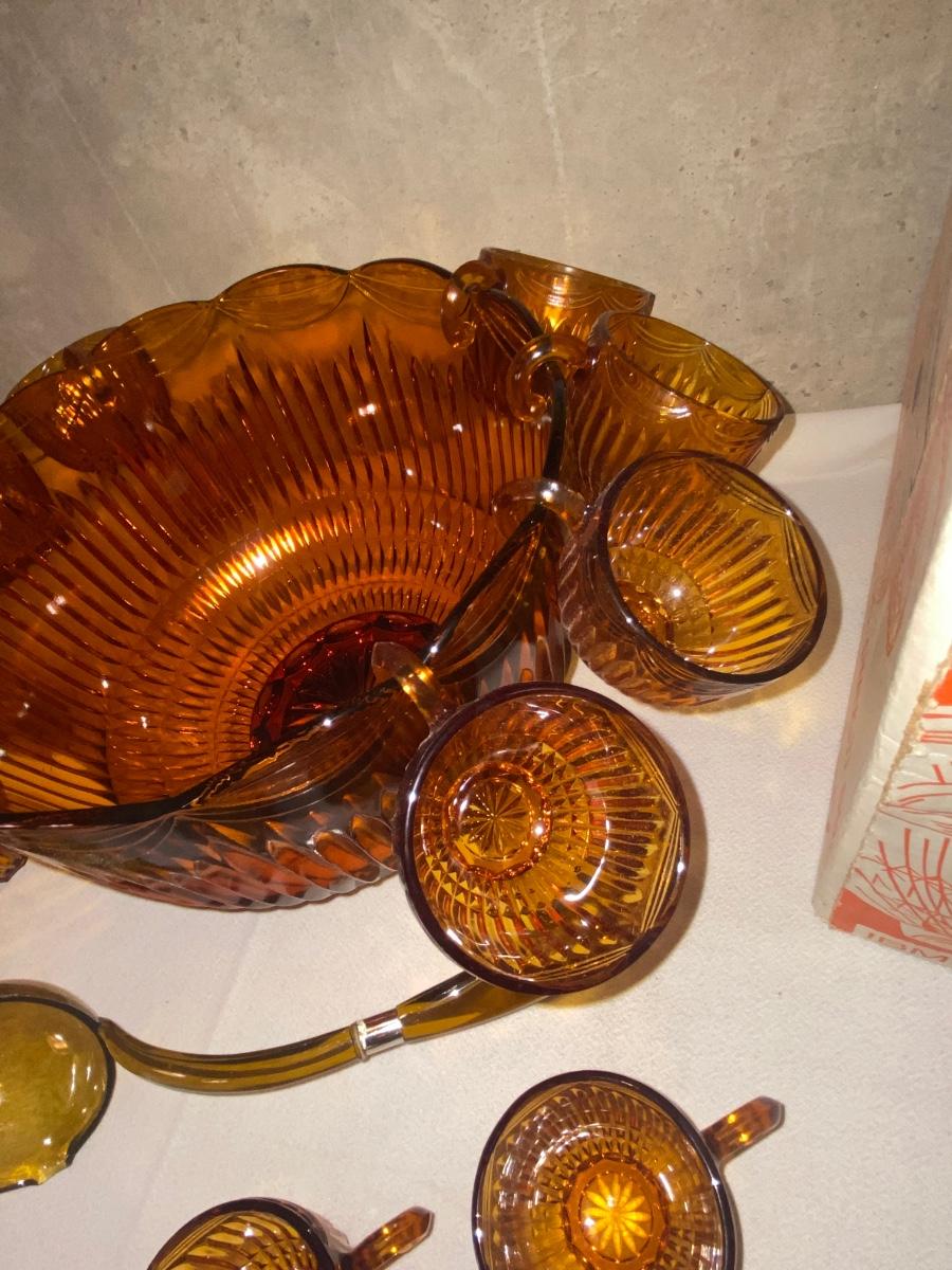 VINTAGE ROYAL AMBER GLASS PUNCH BOWL, CUPS, AND LADLE