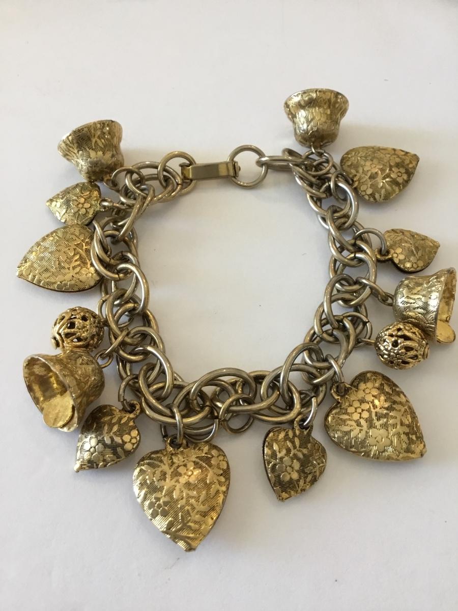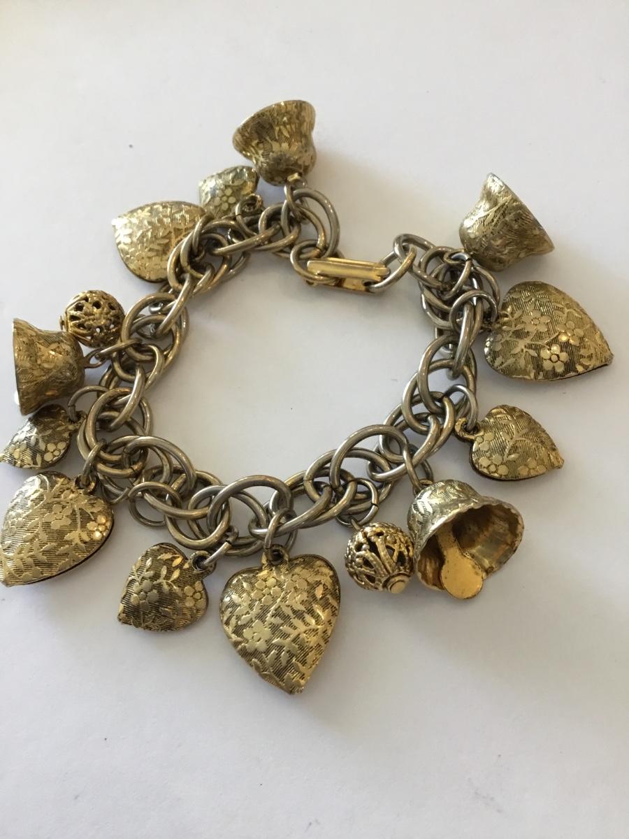 Vintage, silver and gold, toned heart, and bell charm bracelet