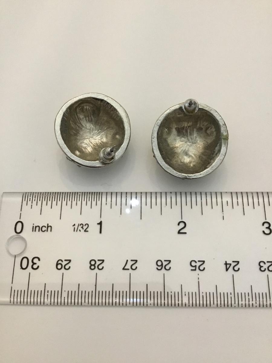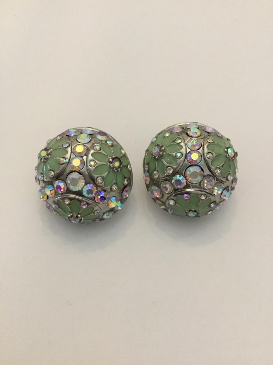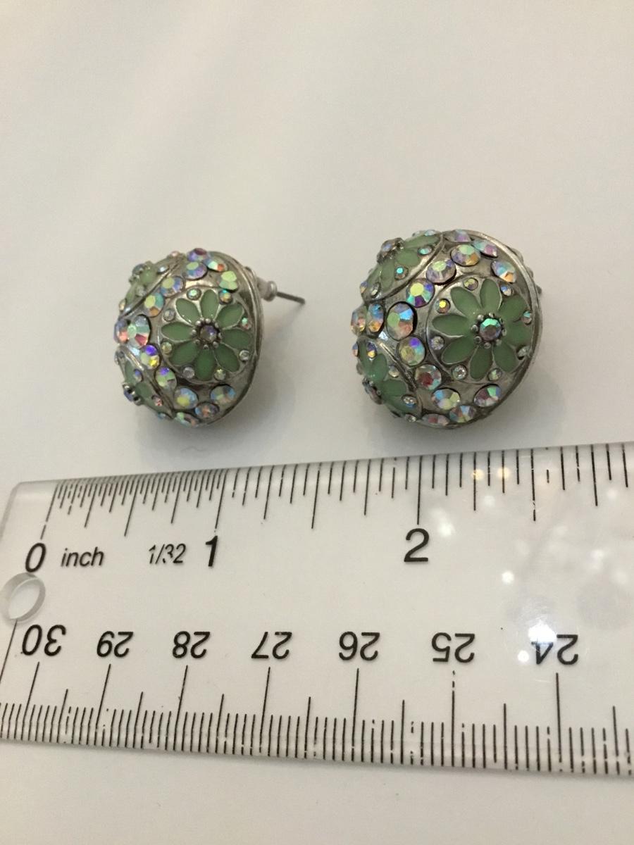 Vintage, silver toned dome, crystal rhinestone, mint green enamel flower, statement earrings