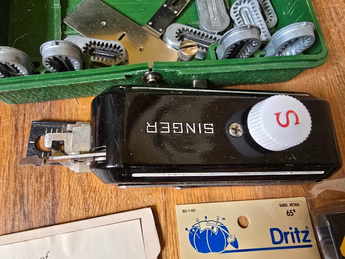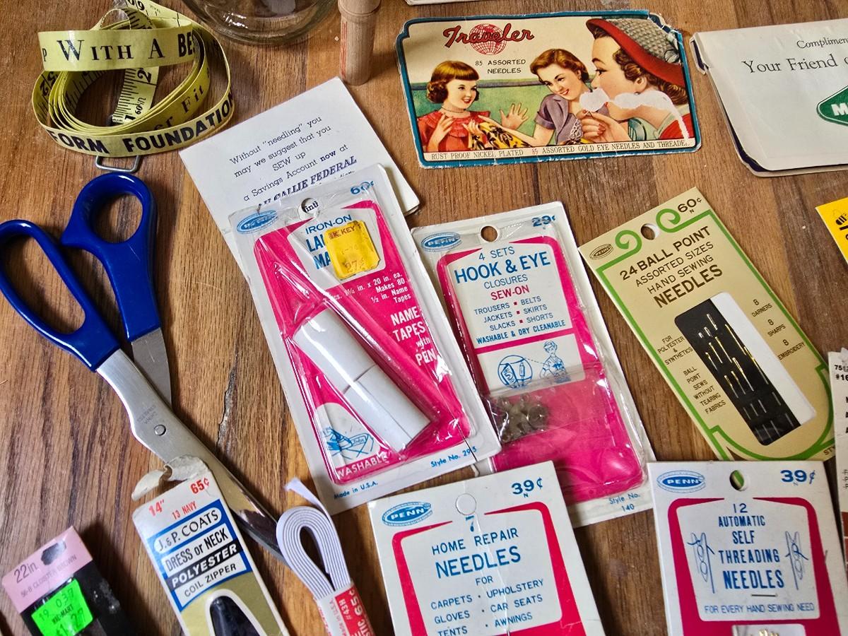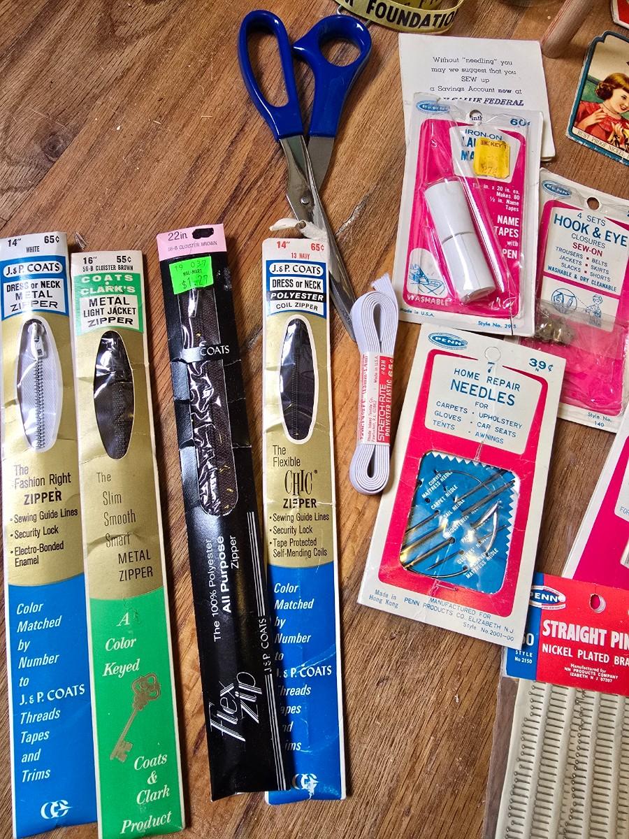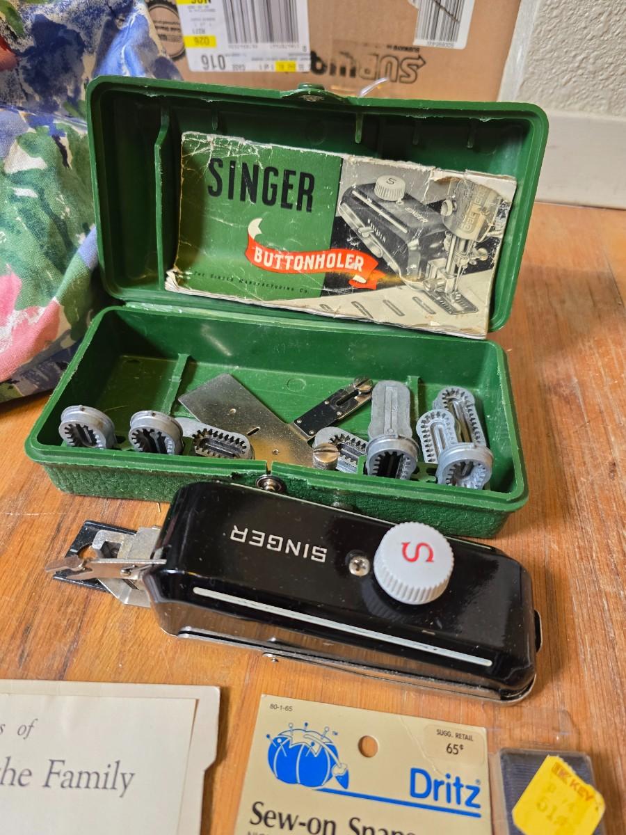 New old stock sewing notions - old needles with neat graphics -zippers - buttons- Vintage 1948 Singer Buttonholer and more