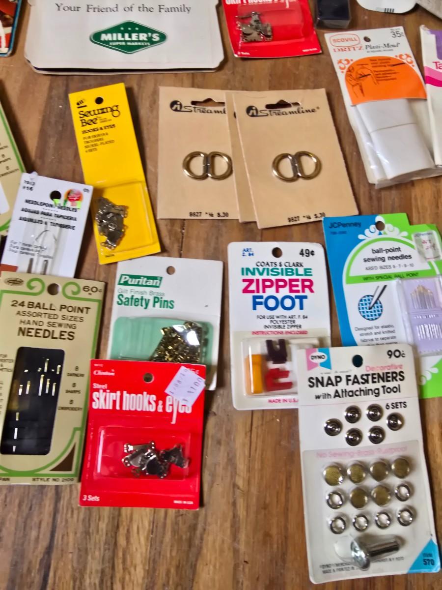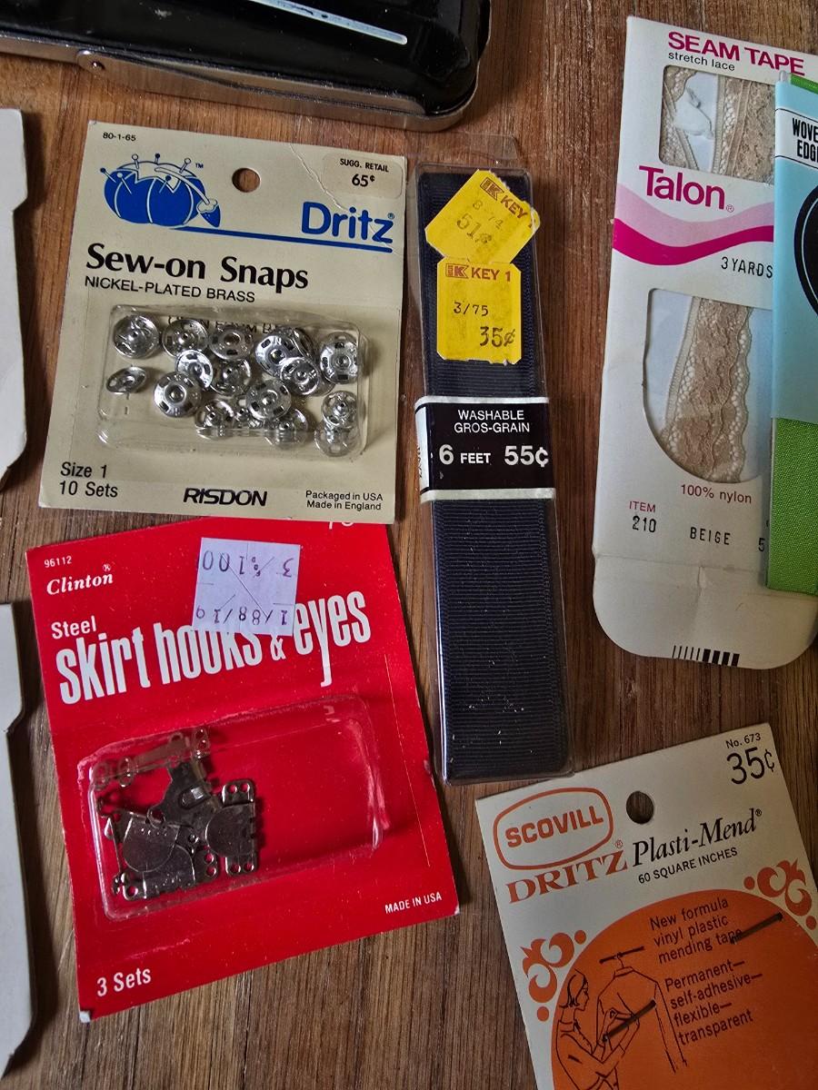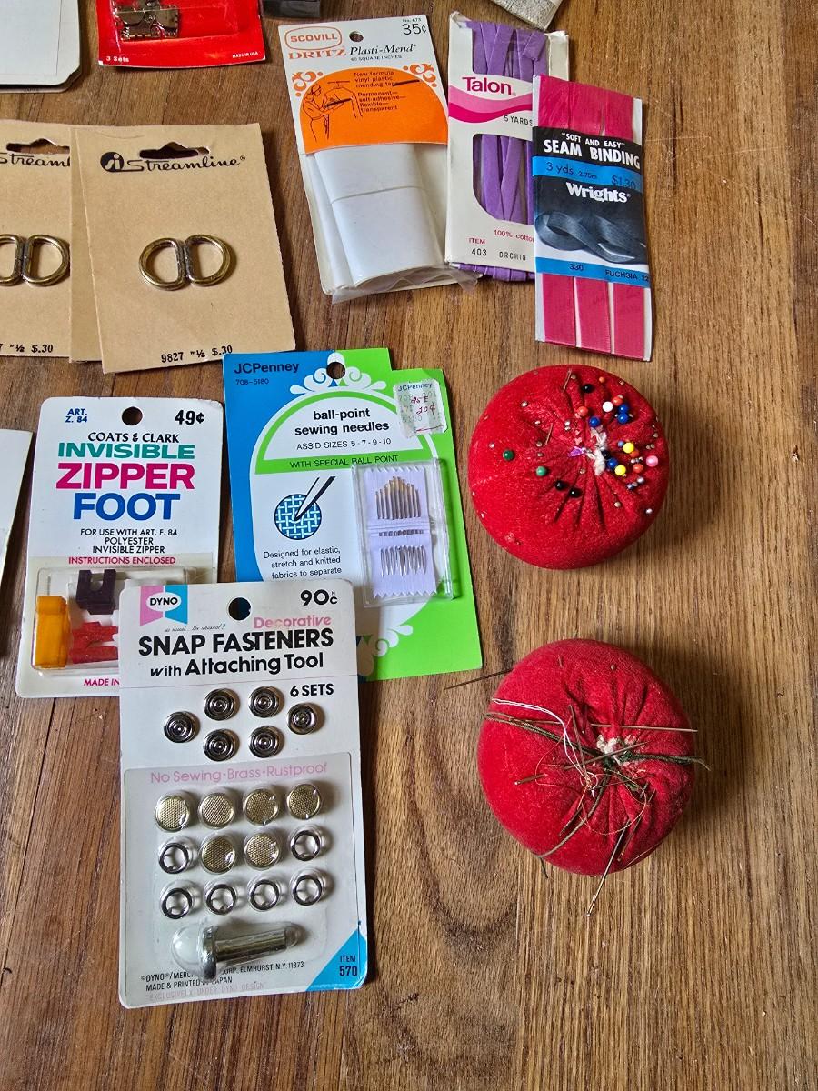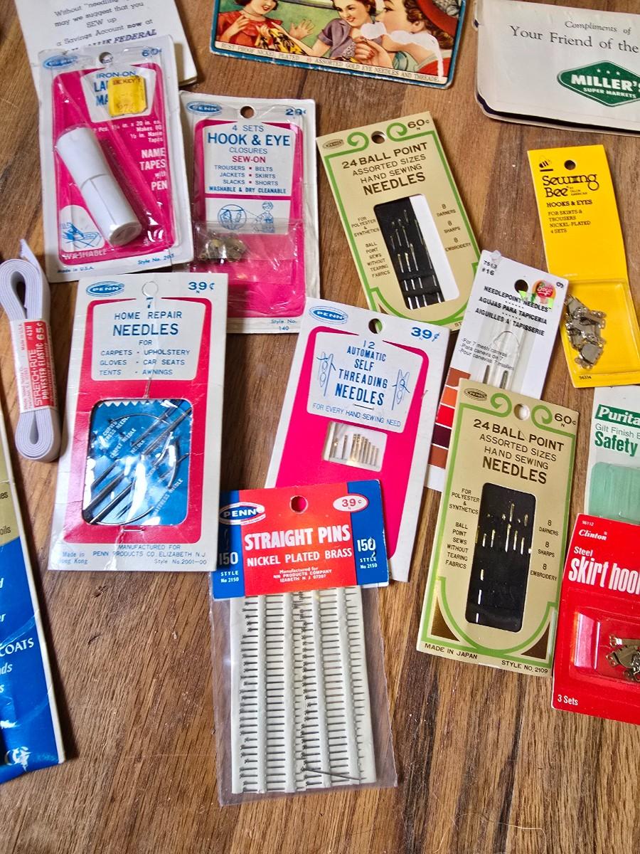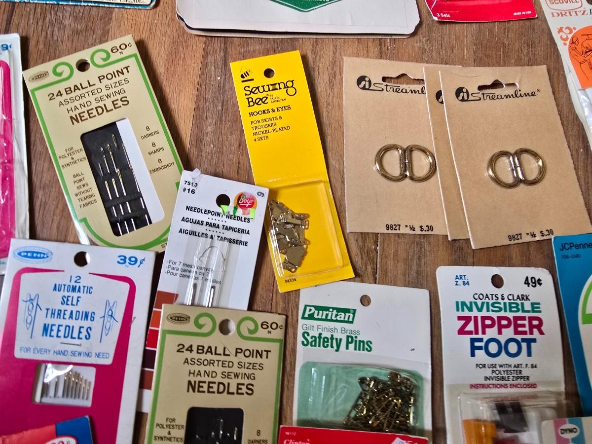 New old stock sewing notions - old needles with neat graphics -zippers - buttons- Vintage 1948 Singer Buttonholer and more