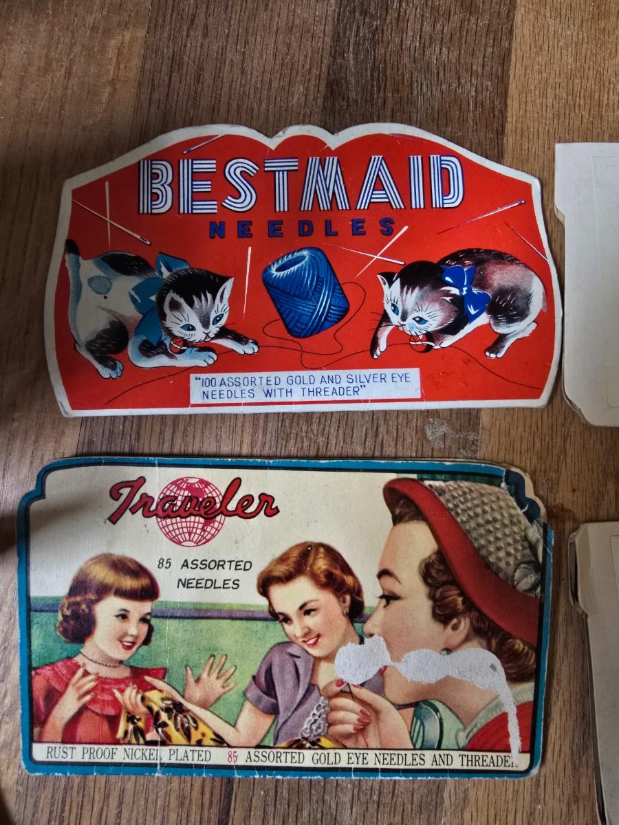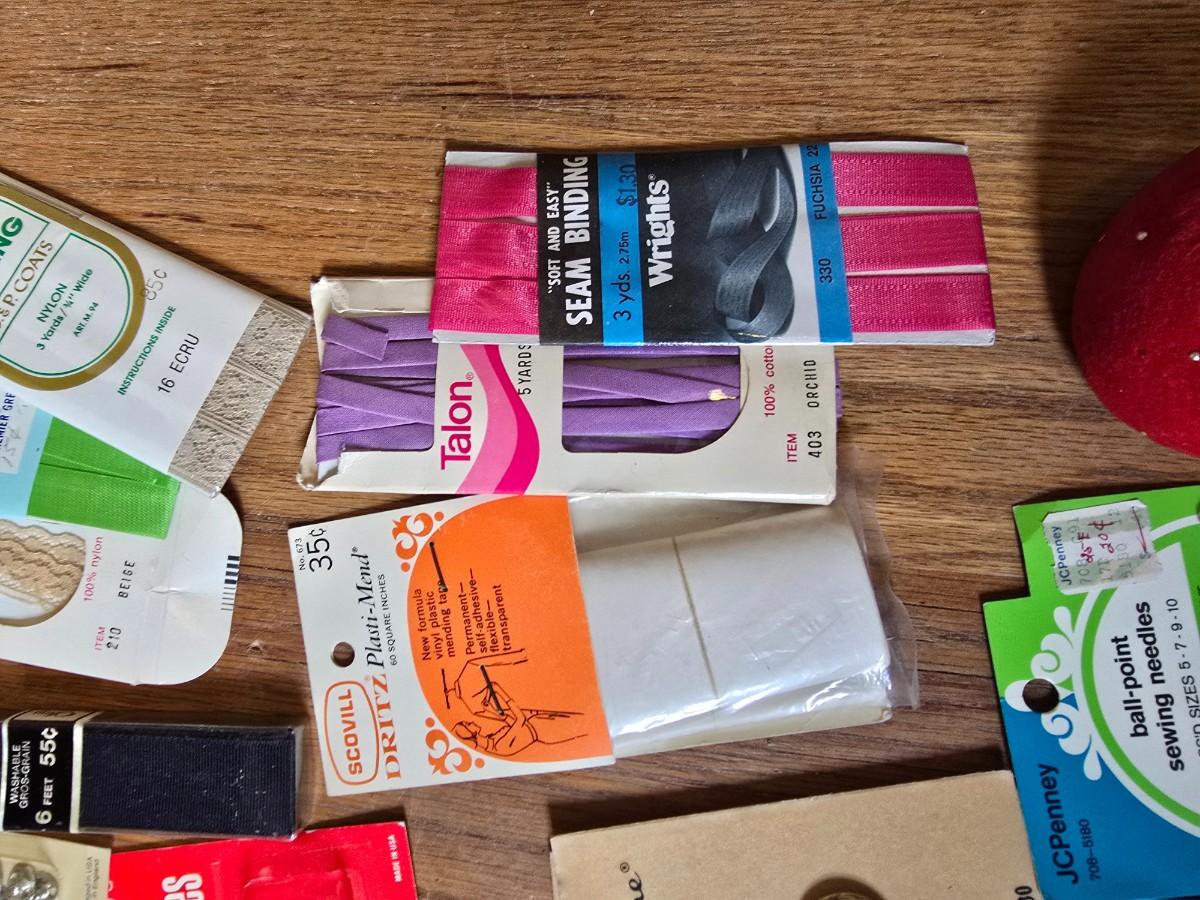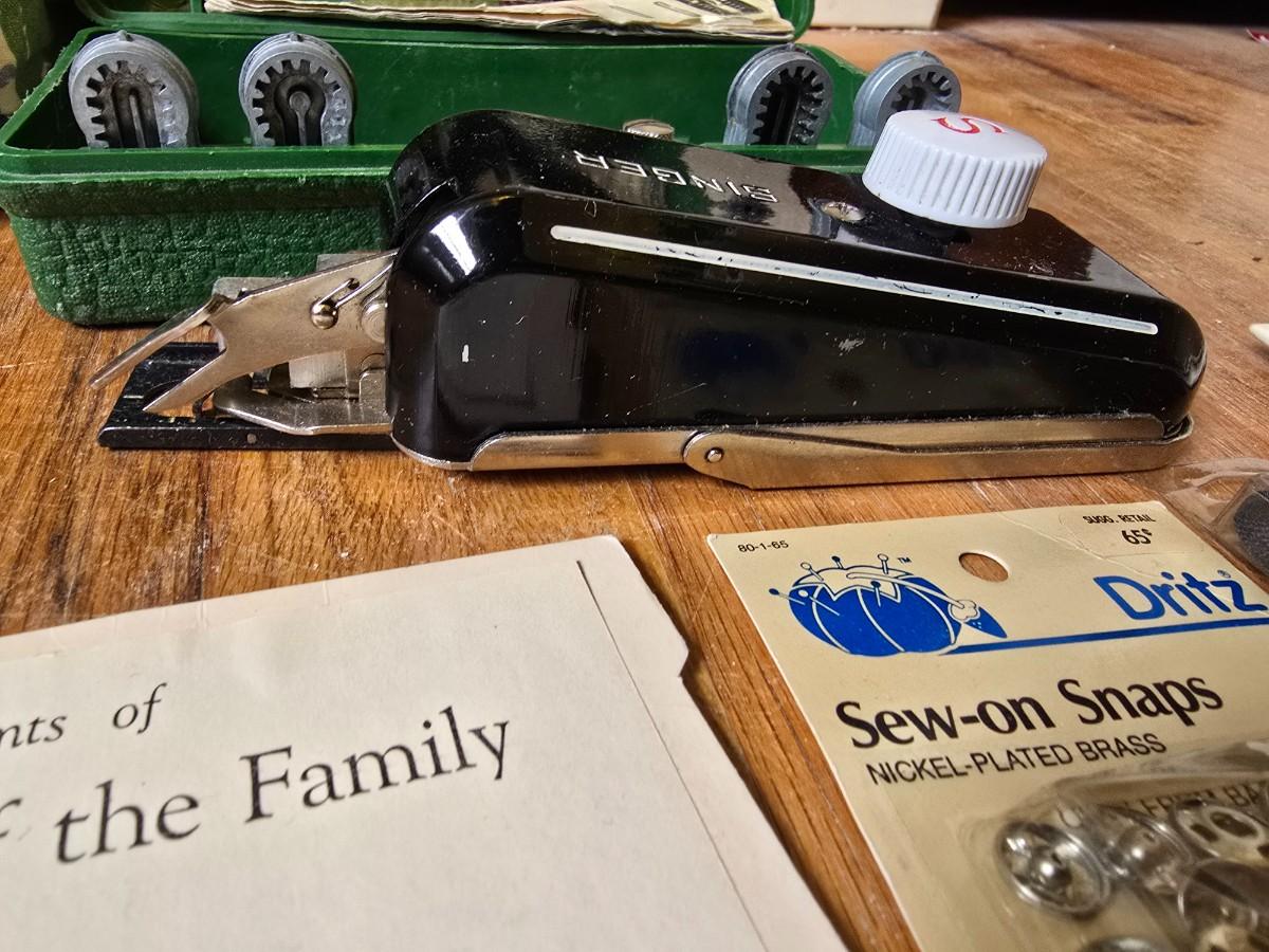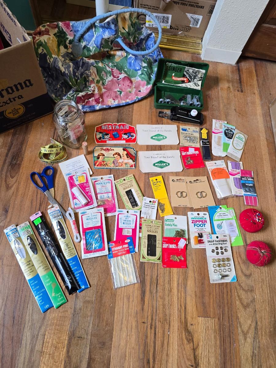 New old stock sewing notions - old needles with neat graphics -zippers - buttons- Vintage 1948 Singer Buttonholer and more