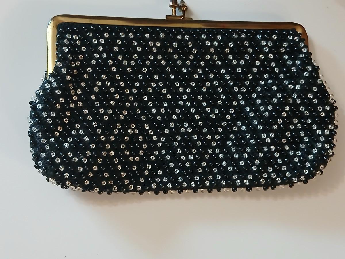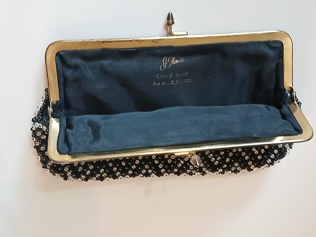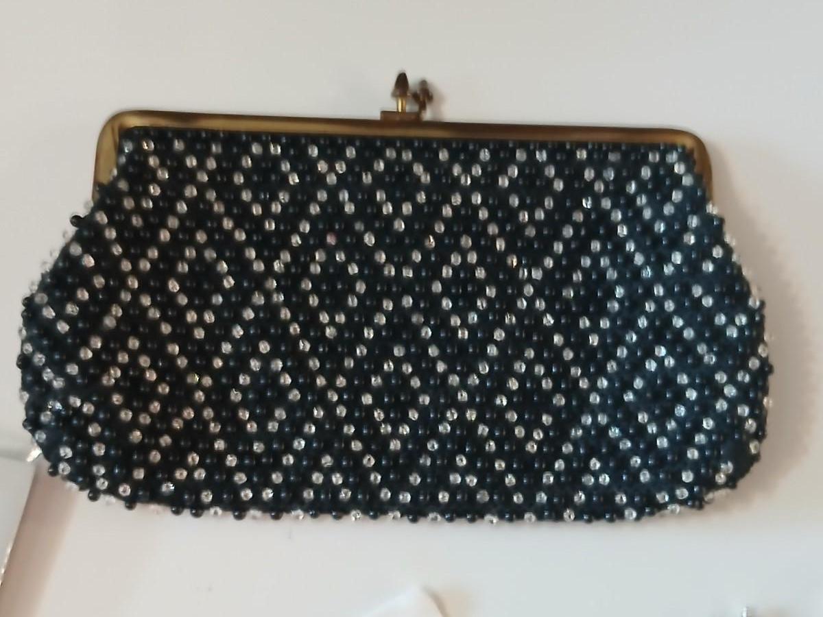 Vintage St. Thomas Black Clutch Evening Beaded purse with brooch pins -rhinestone and tea kettle and an embroidered cloth