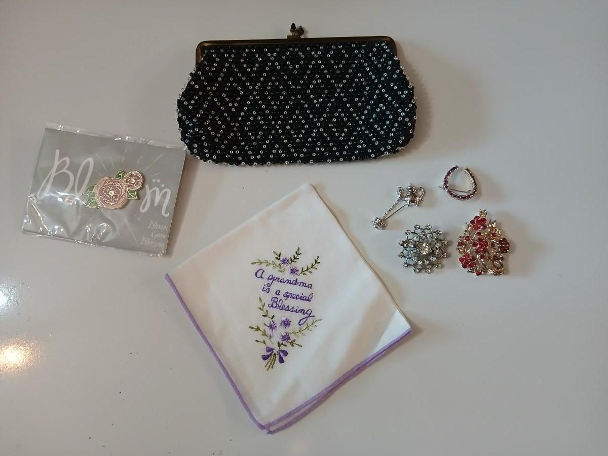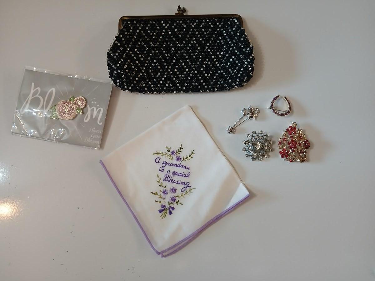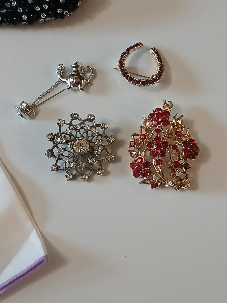 Vintage St. Thomas Black Clutch Evening Beaded purse with brooch pins -rhinestone and tea kettle and an embroidered cloth