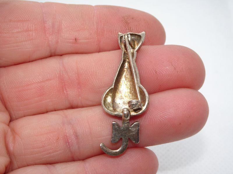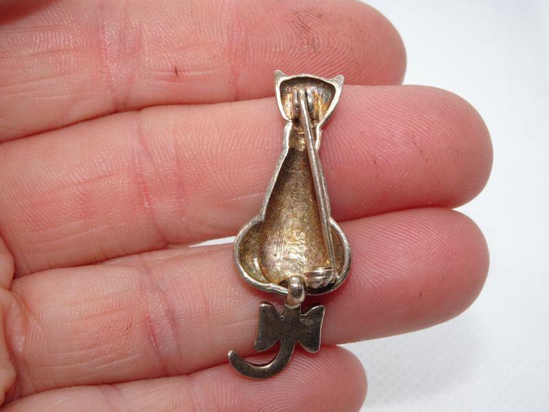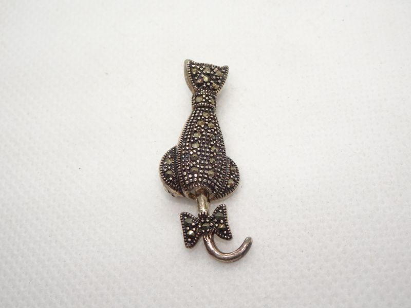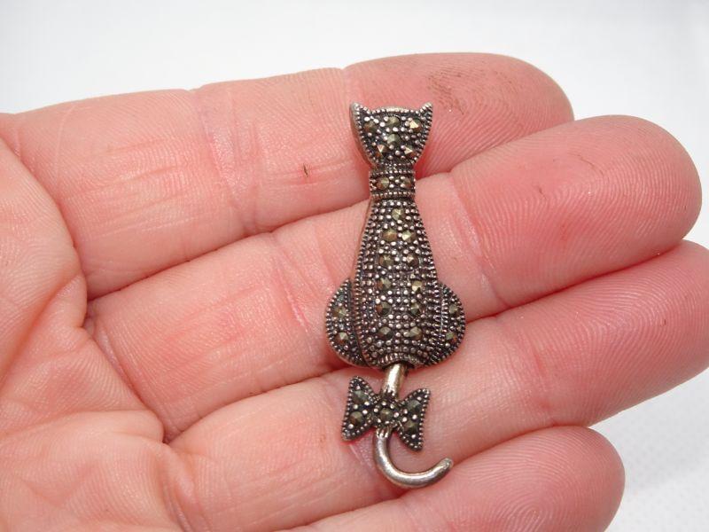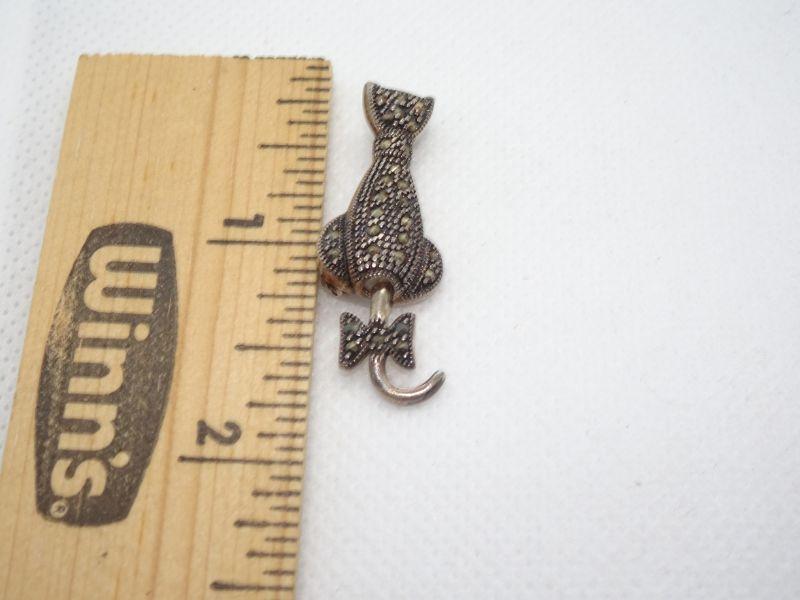Vintage Sterling Silver Marcasite Figural Cat Novelty Dangle Brooch Pin