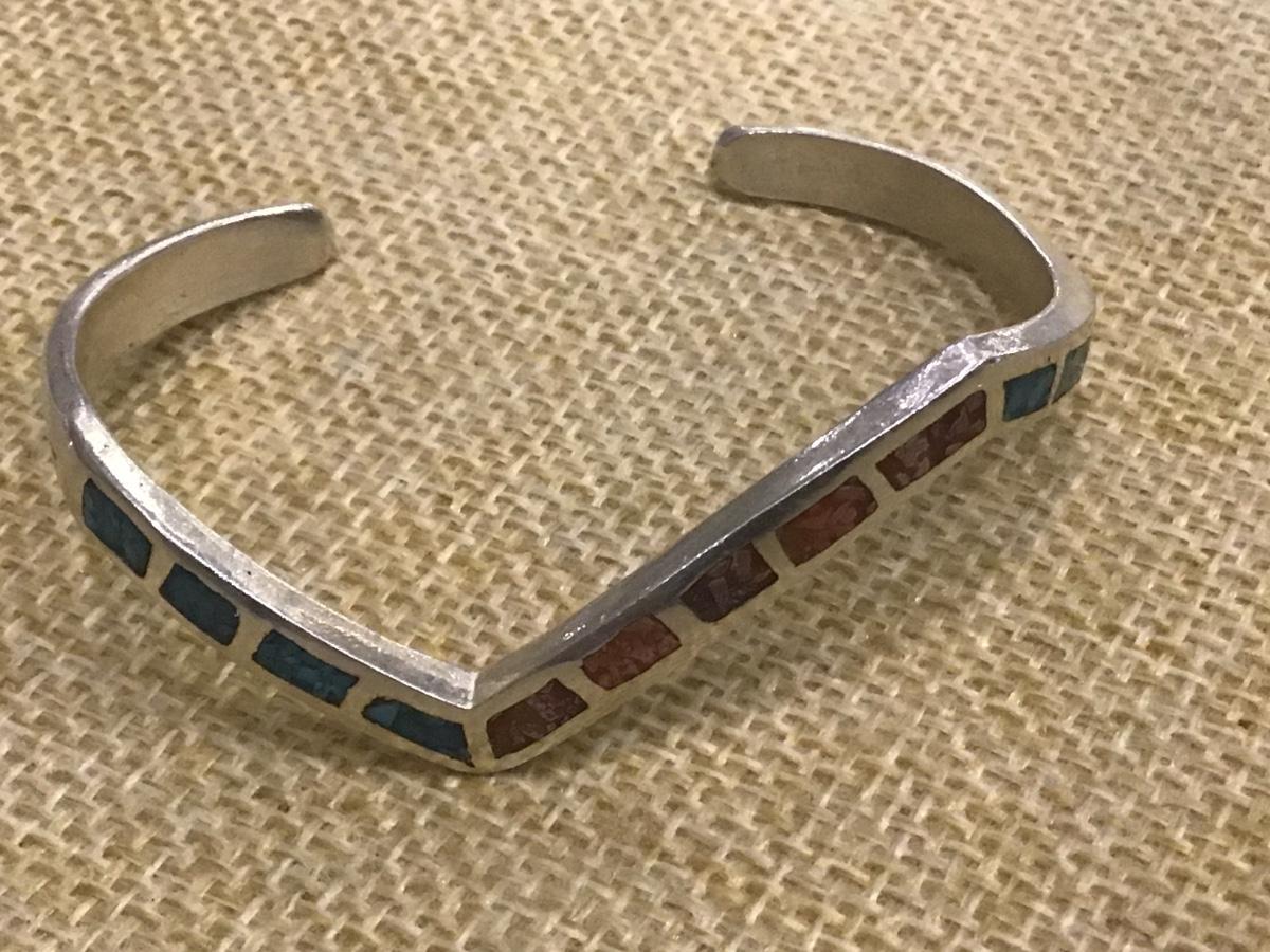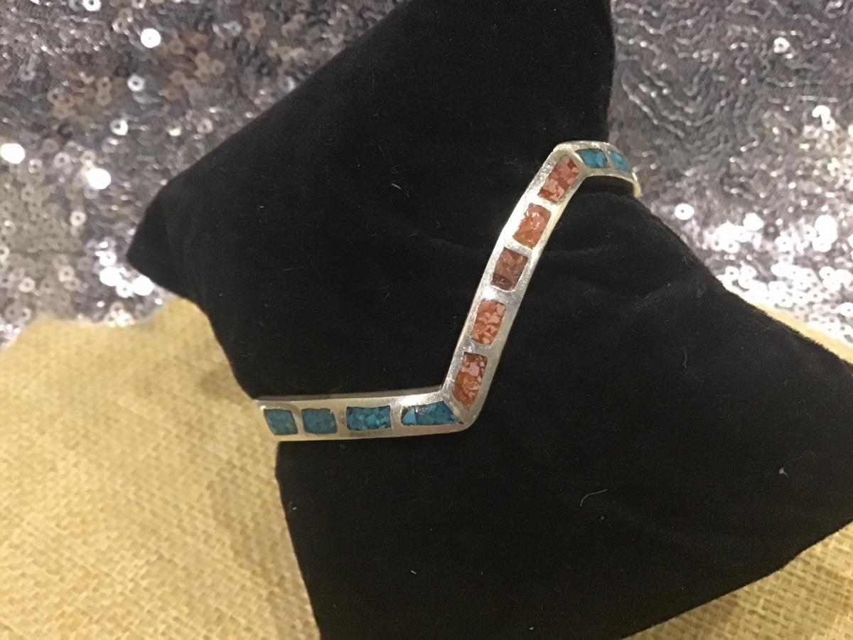 Vintage Sterling Silver W Coral And Turquoise Stone Cuff Bracelet 925