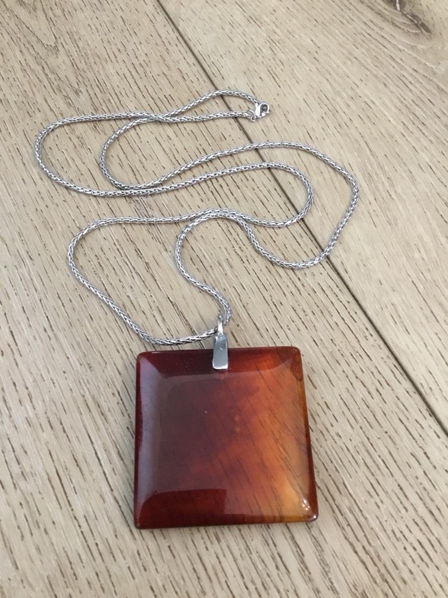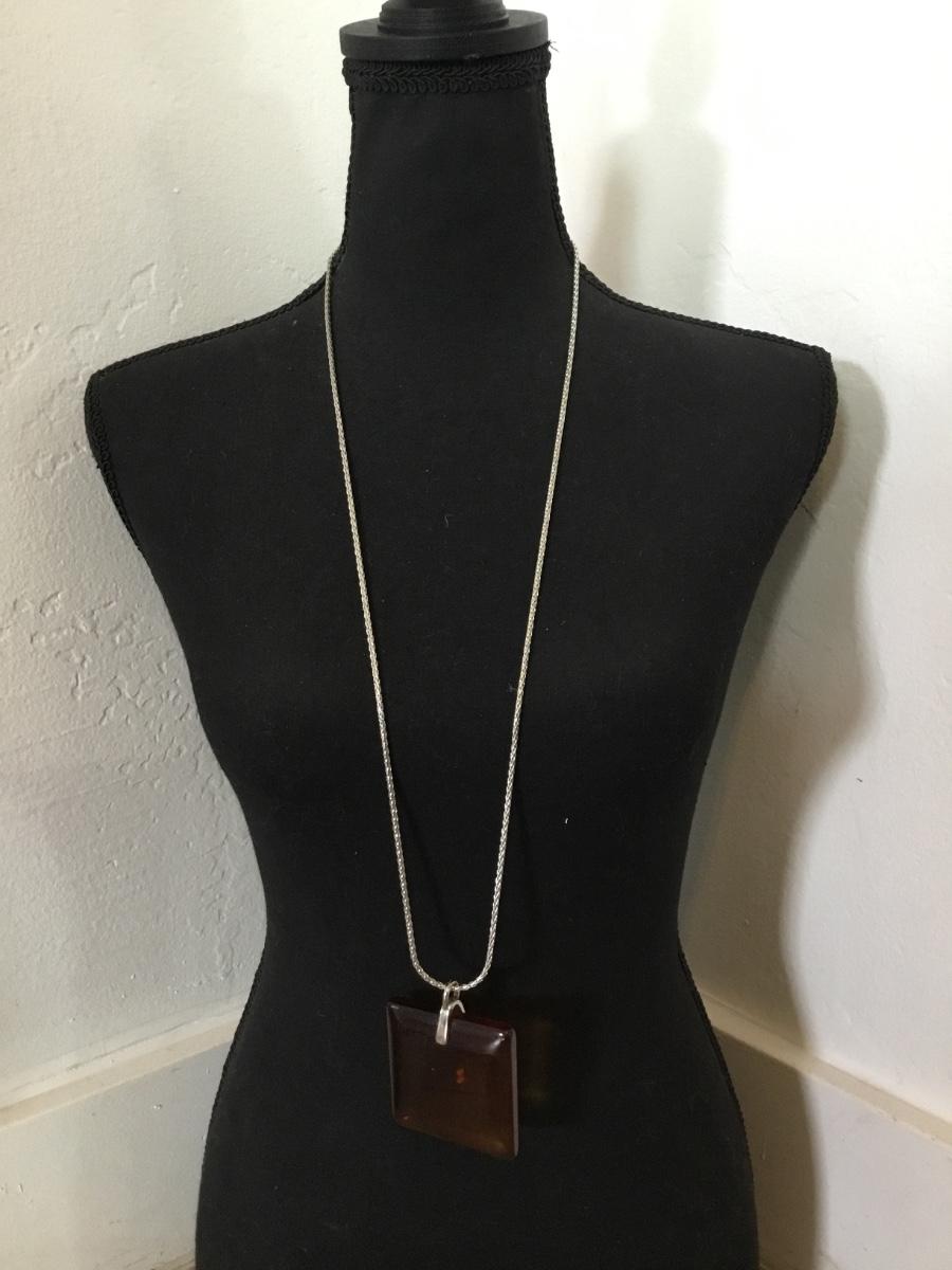 Vintage thick, silver tone, cable, chain necklace, vintage square amber Lucite type Square pendant
