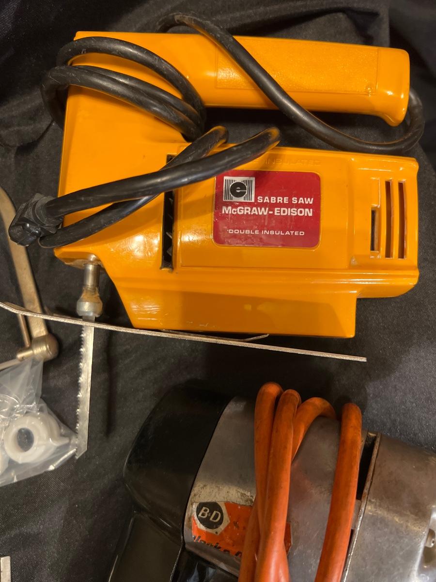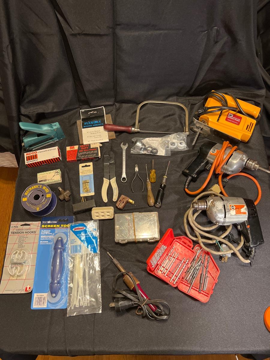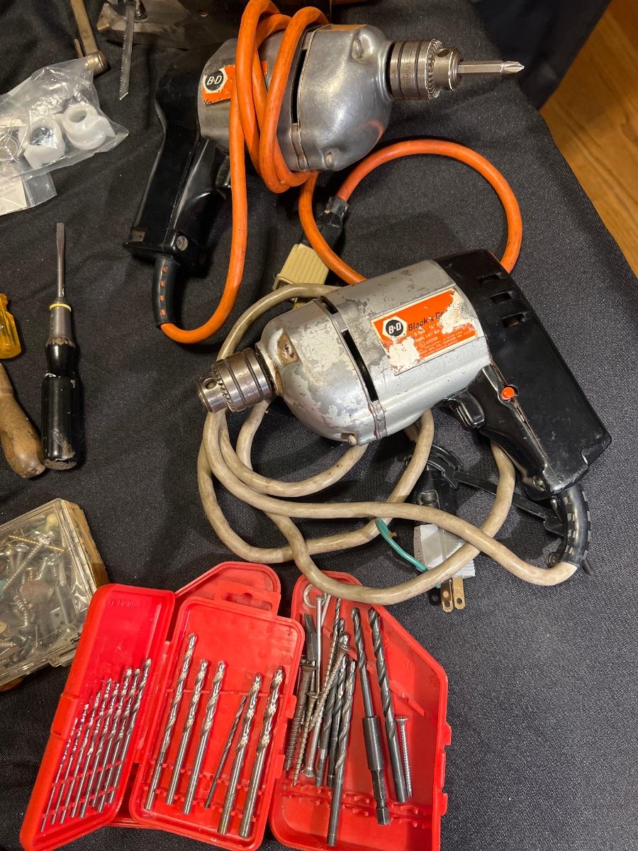 Tested and working 2 Black and Decker drills, a McGraw Edison Sabre Saw working, staple gun, a solder gun in working condition, drill bit sets, misc screws, nails etc“🦆 Vintage screwdrivers , handheld saw“🦆