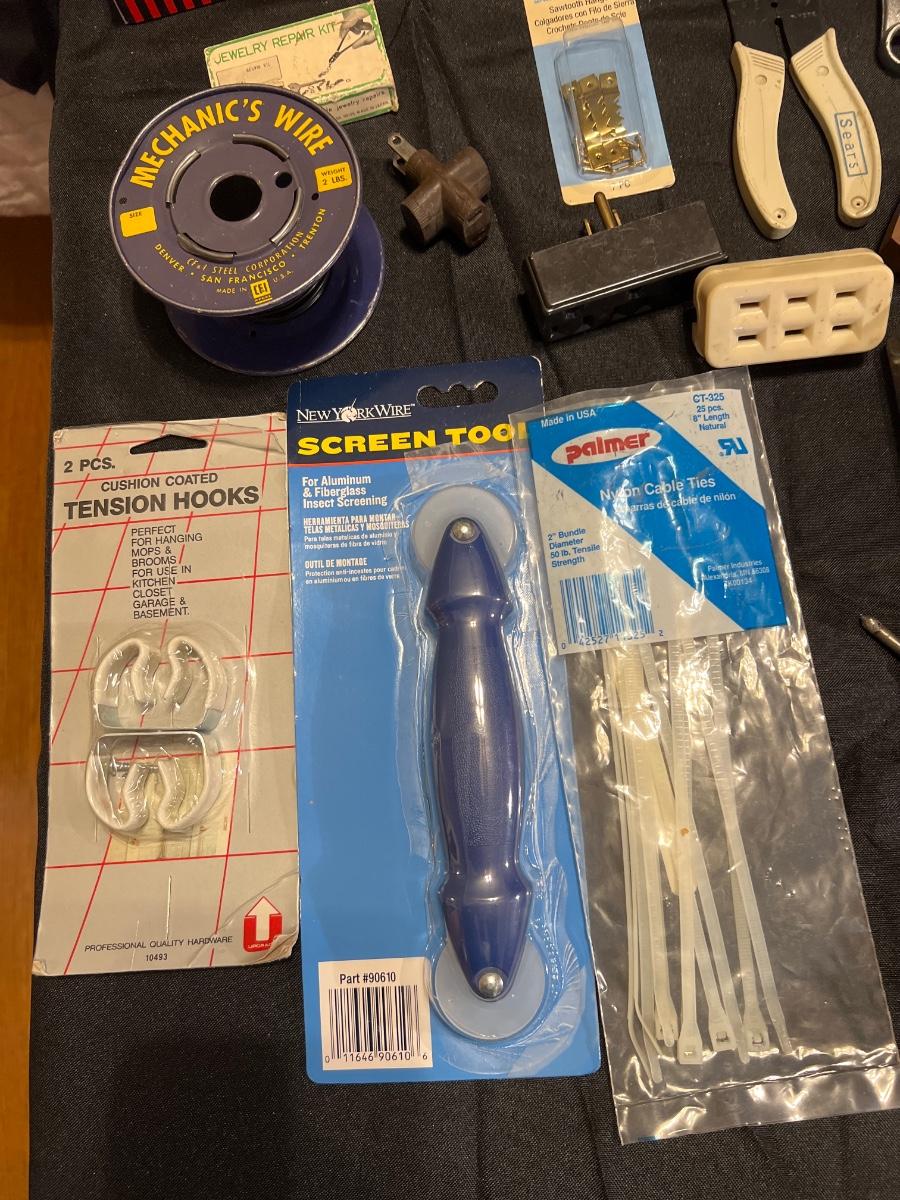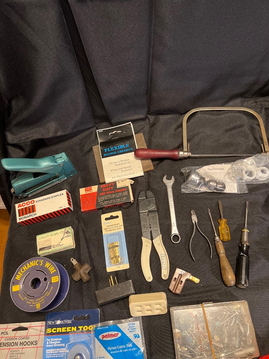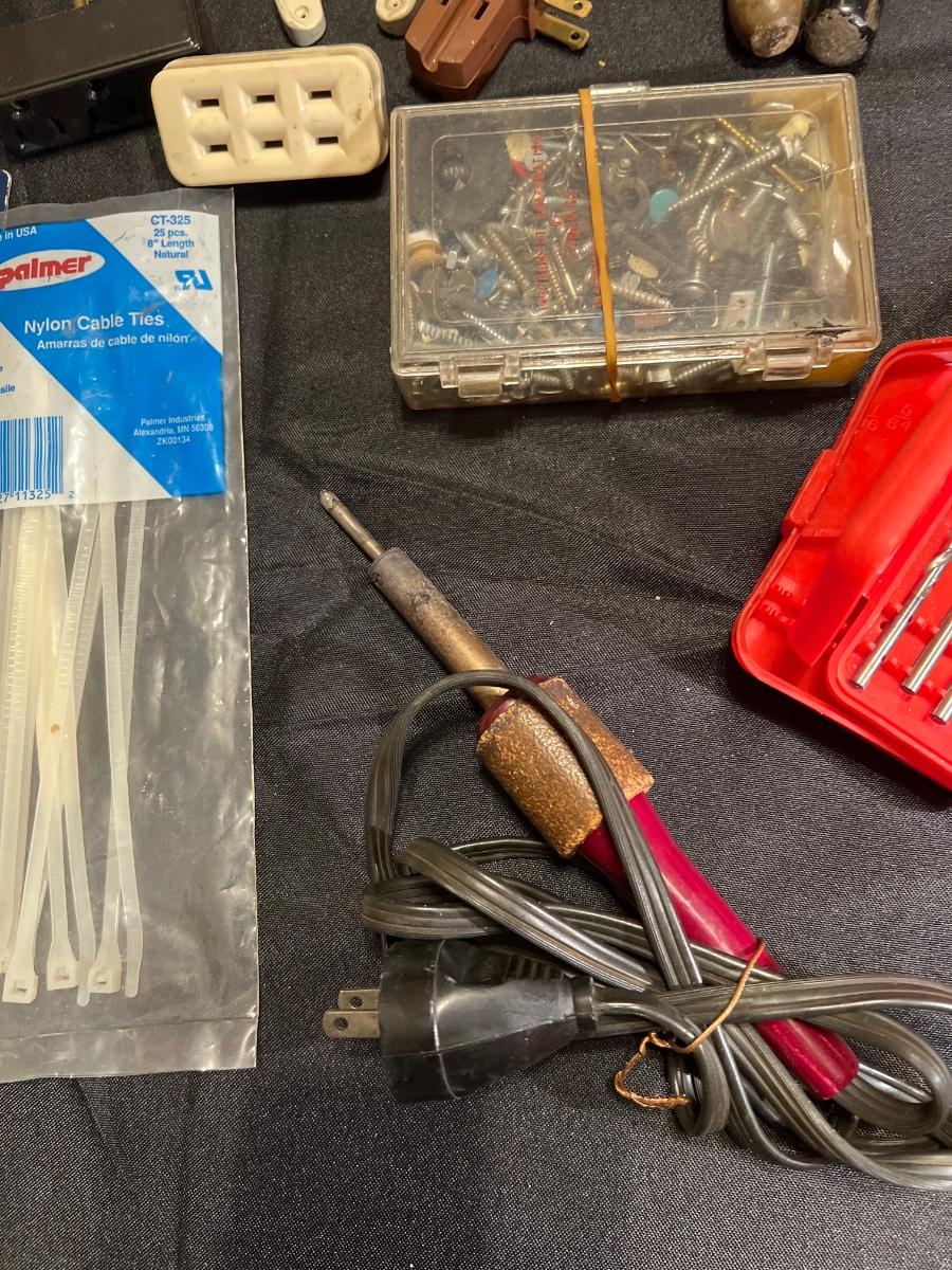 Tested and working 2 Black and Decker drills, a McGraw Edison Sabre Saw working, staple gun, a solder gun in working condition, drill bit sets, misc screws, nails etc“🦆 Vintage screwdrivers , handheld saw“🦆