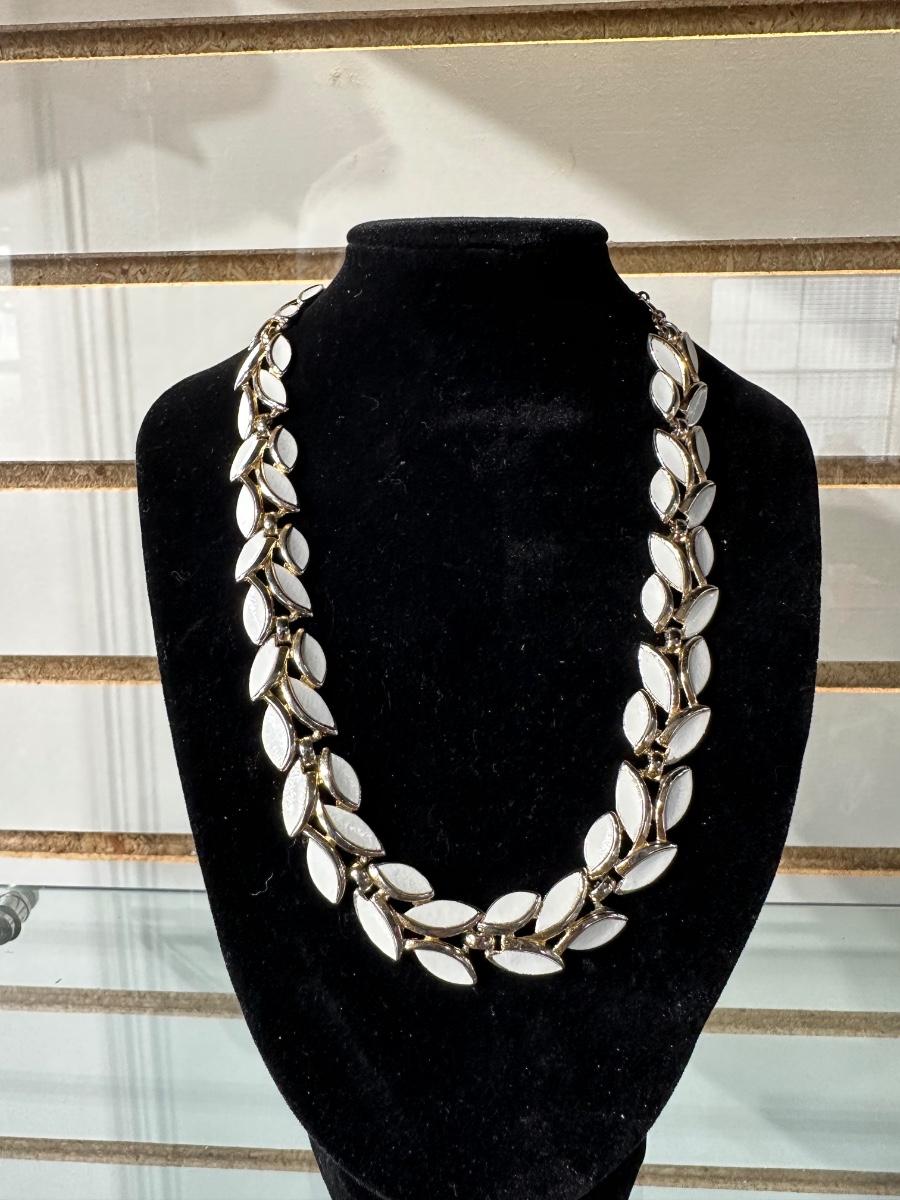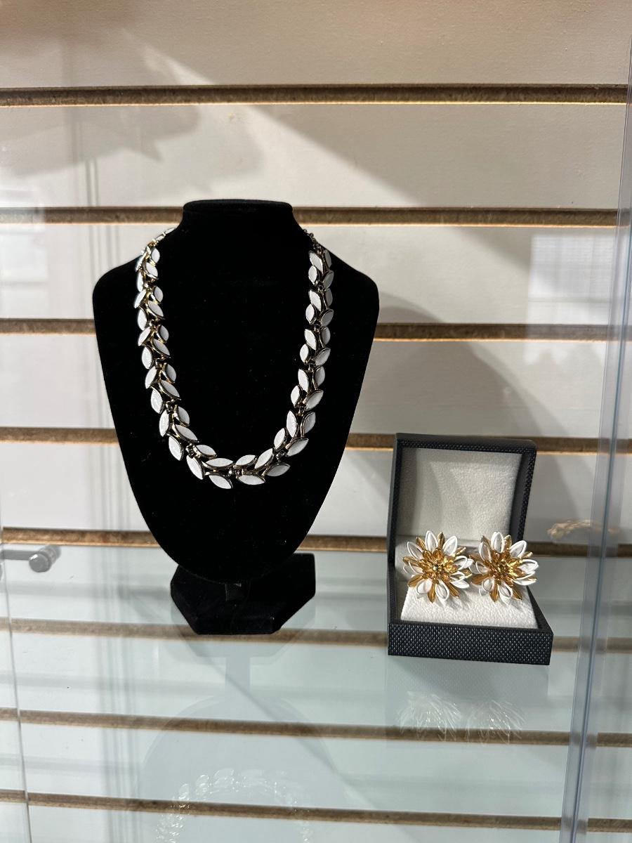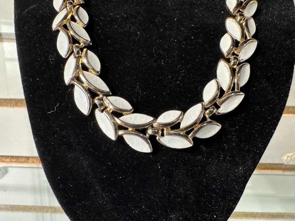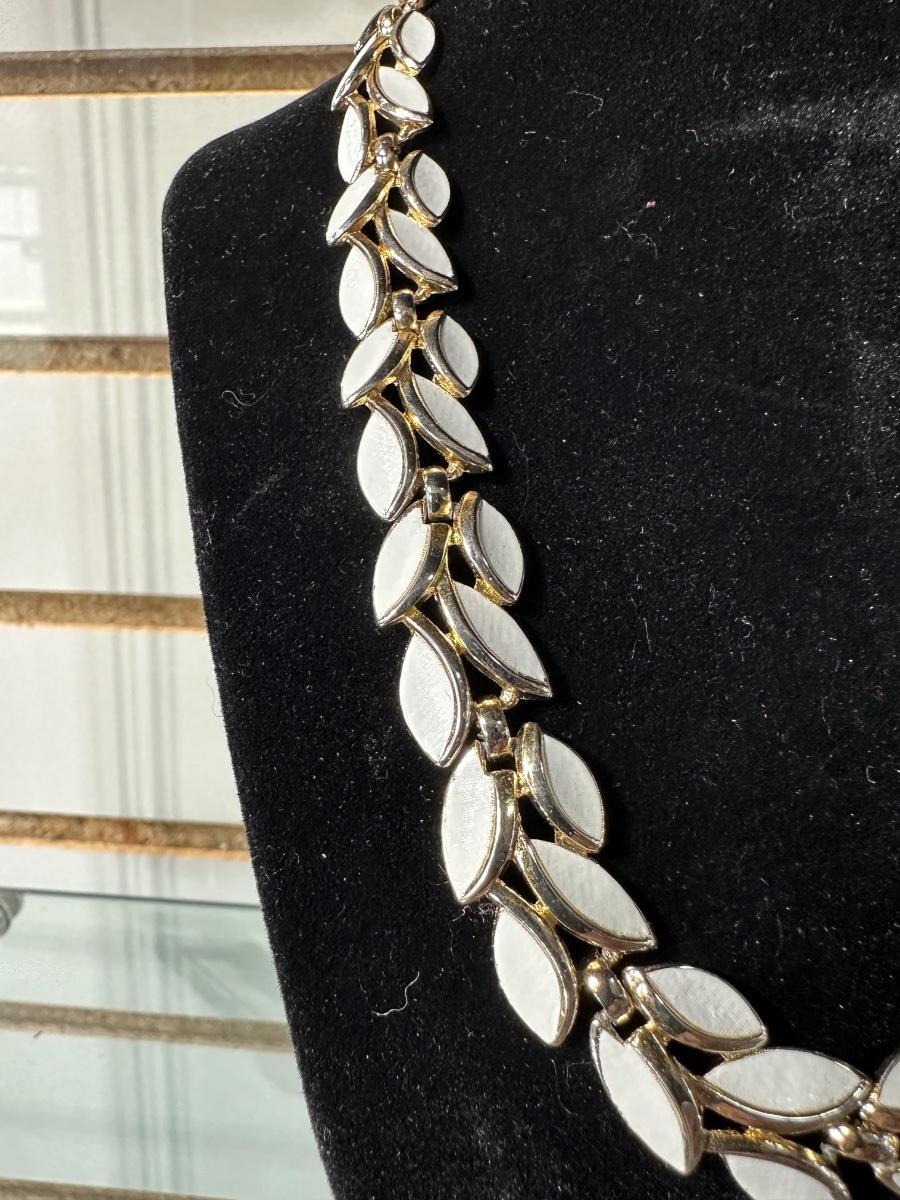 VINTAGE TRIFARI GOLD TONE WHITE ENAMEL LEAF LINK ADJUSTABLE CHOCKER NECKLACE AND VINTAGE CLIP-ON WATER LILY EARRINGS