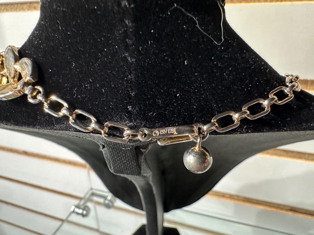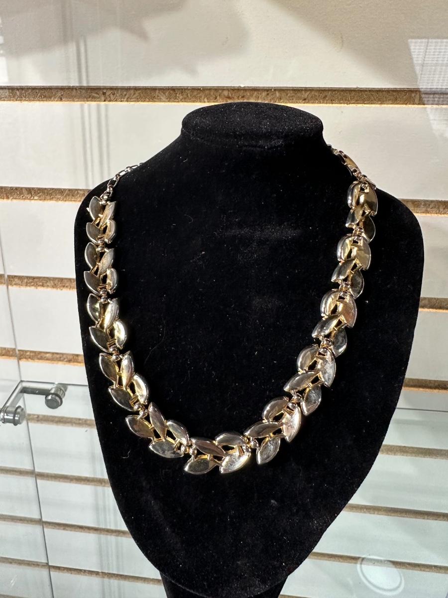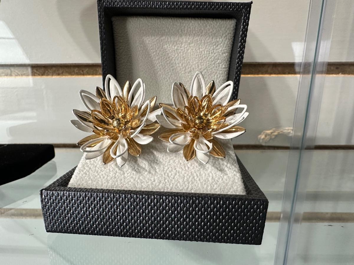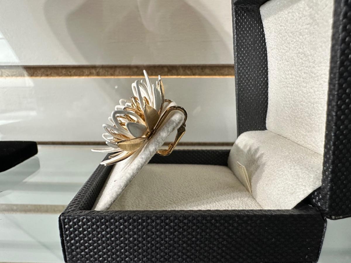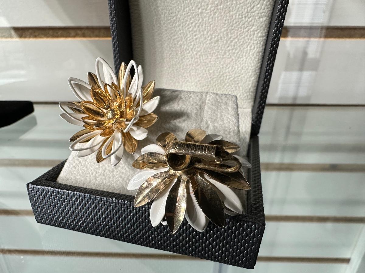 VINTAGE TRIFARI GOLD TONE WHITE ENAMEL LEAF LINK ADJUSTABLE CHOCKER NECKLACE AND VINTAGE CLIP-ON WATER LILY EARRINGS