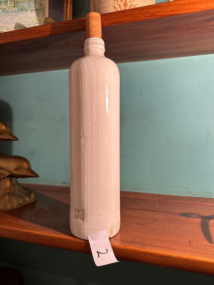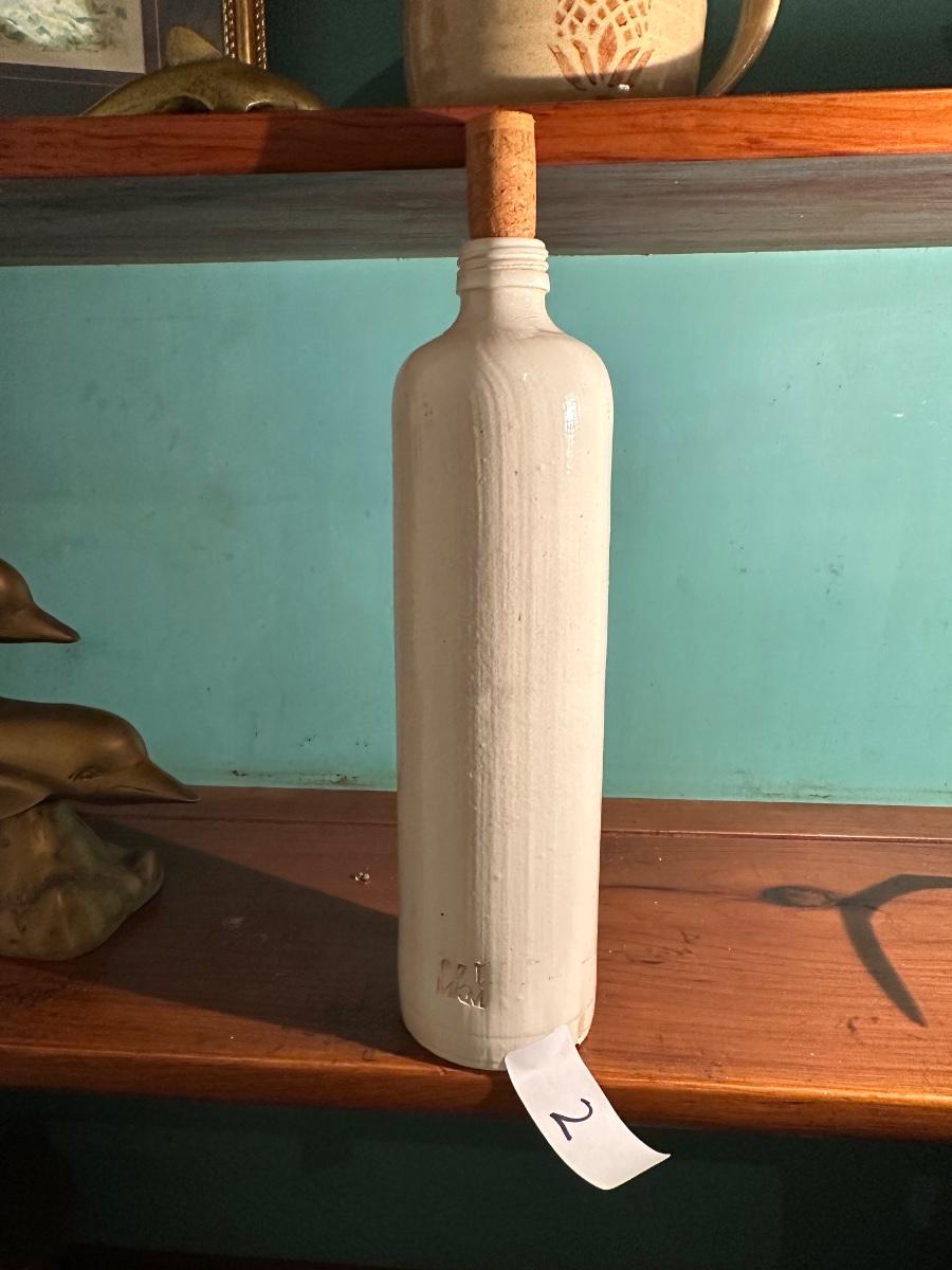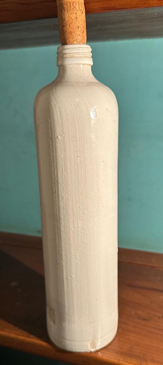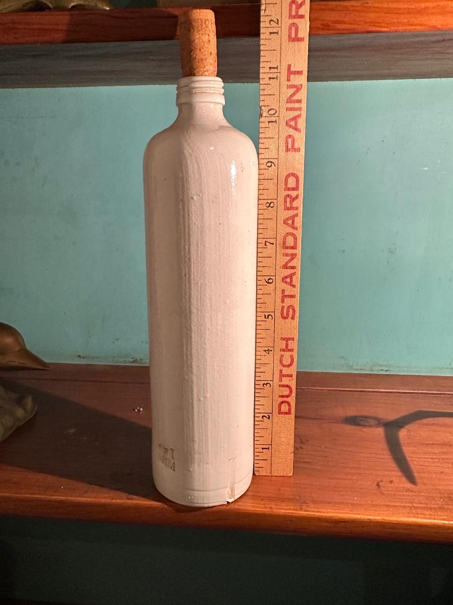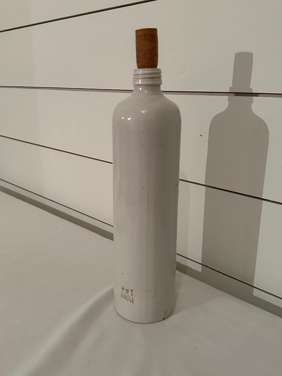 VINTAGE WHITE STONEWARE JUG-BOTTLE WITH CORK EMPTY 11" TALL, MARKED"MKM" 0.7L