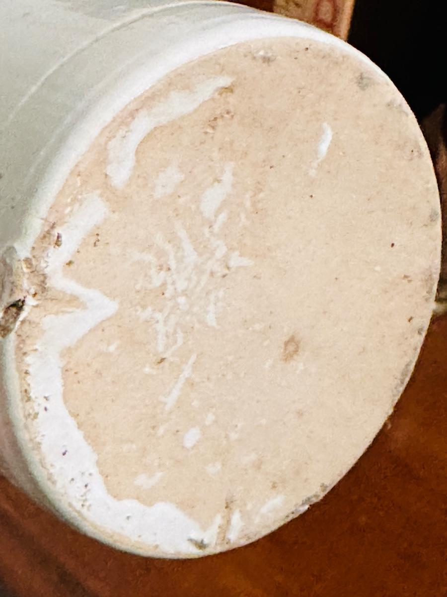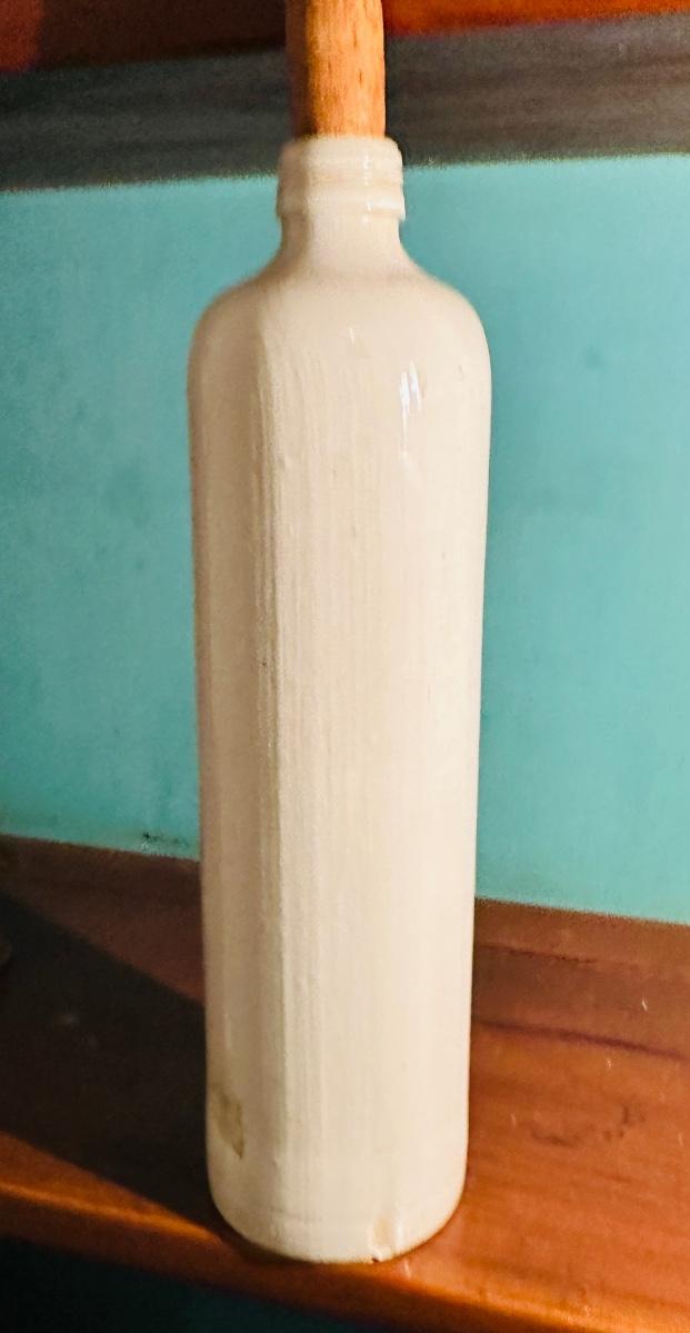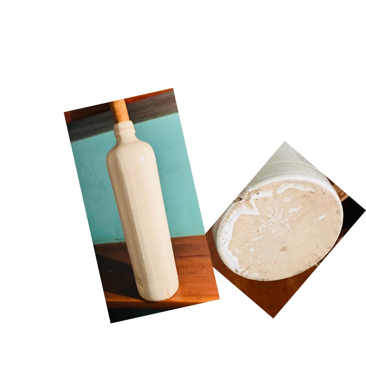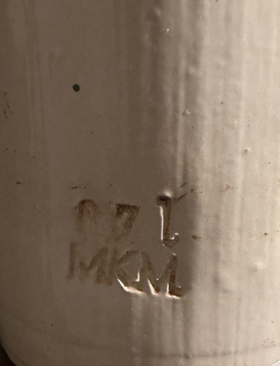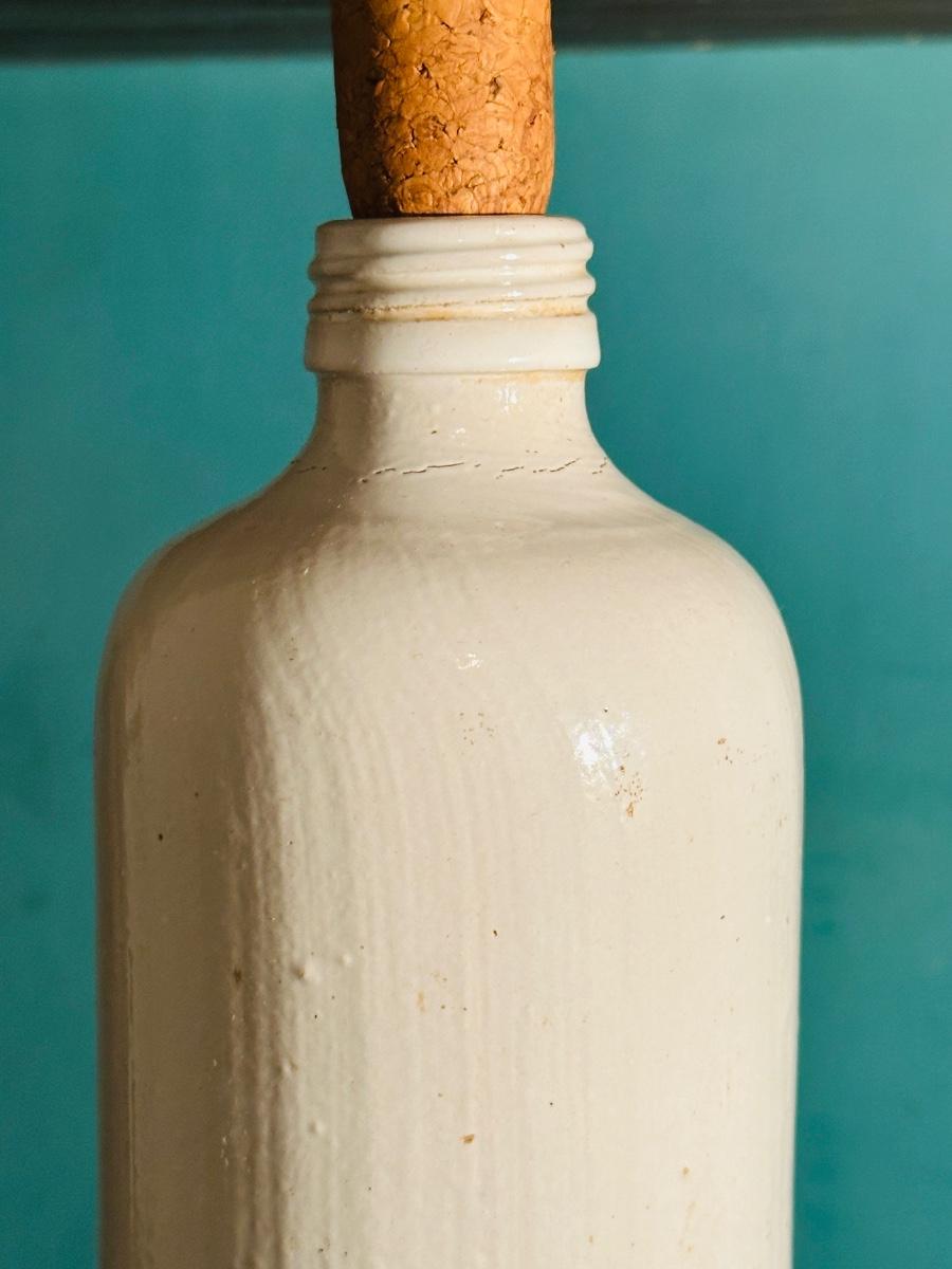 VINTAGE WHITE STONEWARE JUG-BOTTLE WITH CORK EMPTY 11" TALL, MARKED"MKM" 0.7L