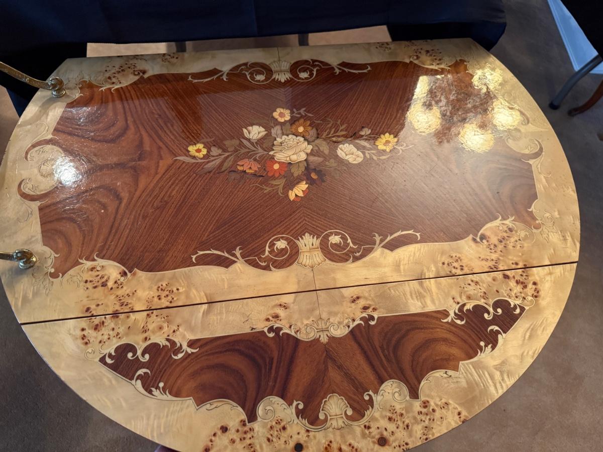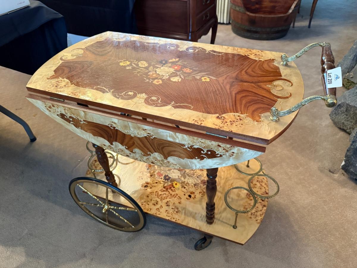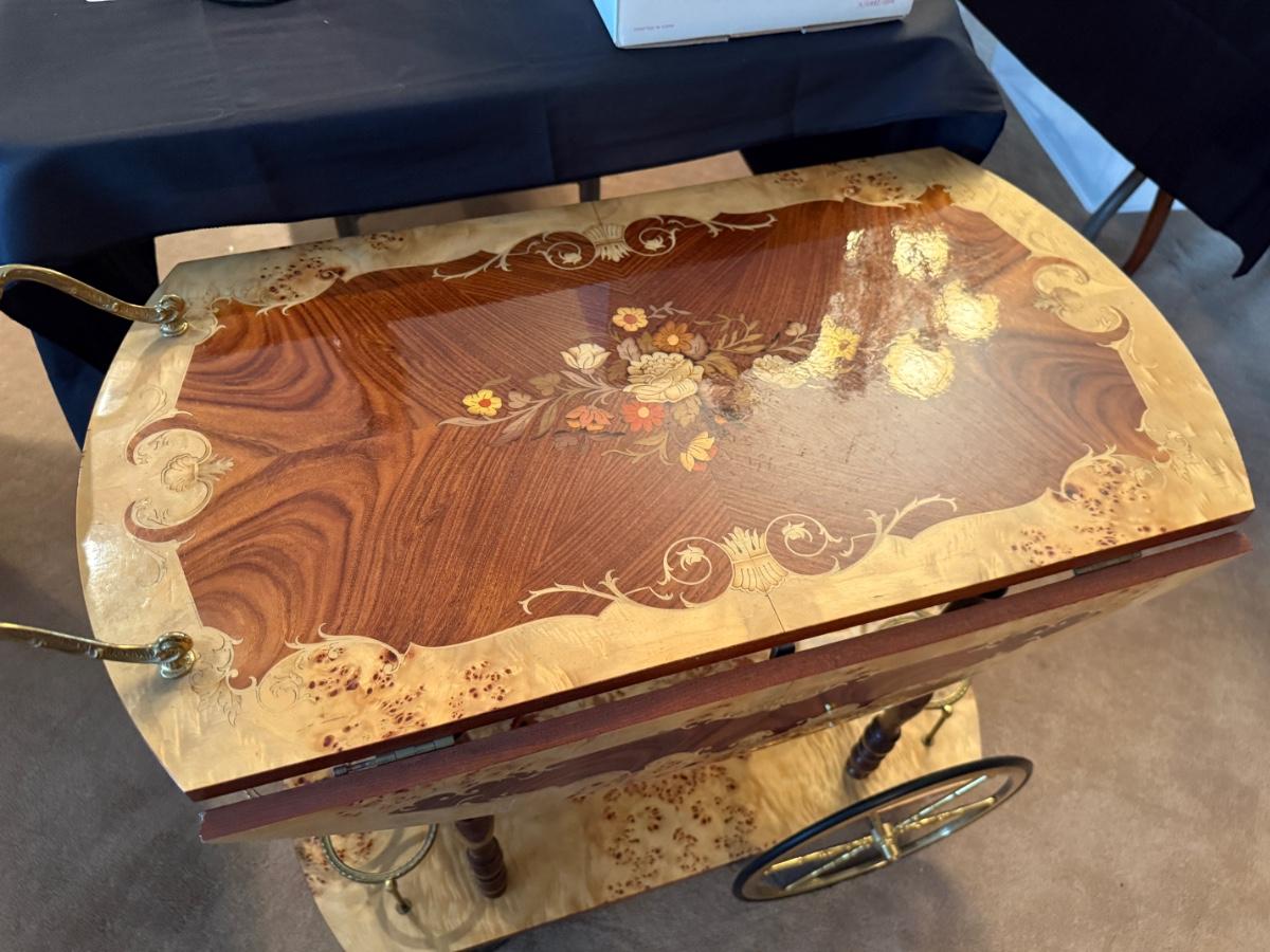 Vintage wood inlaid rolling teacart w/drop sides believe made in Italy