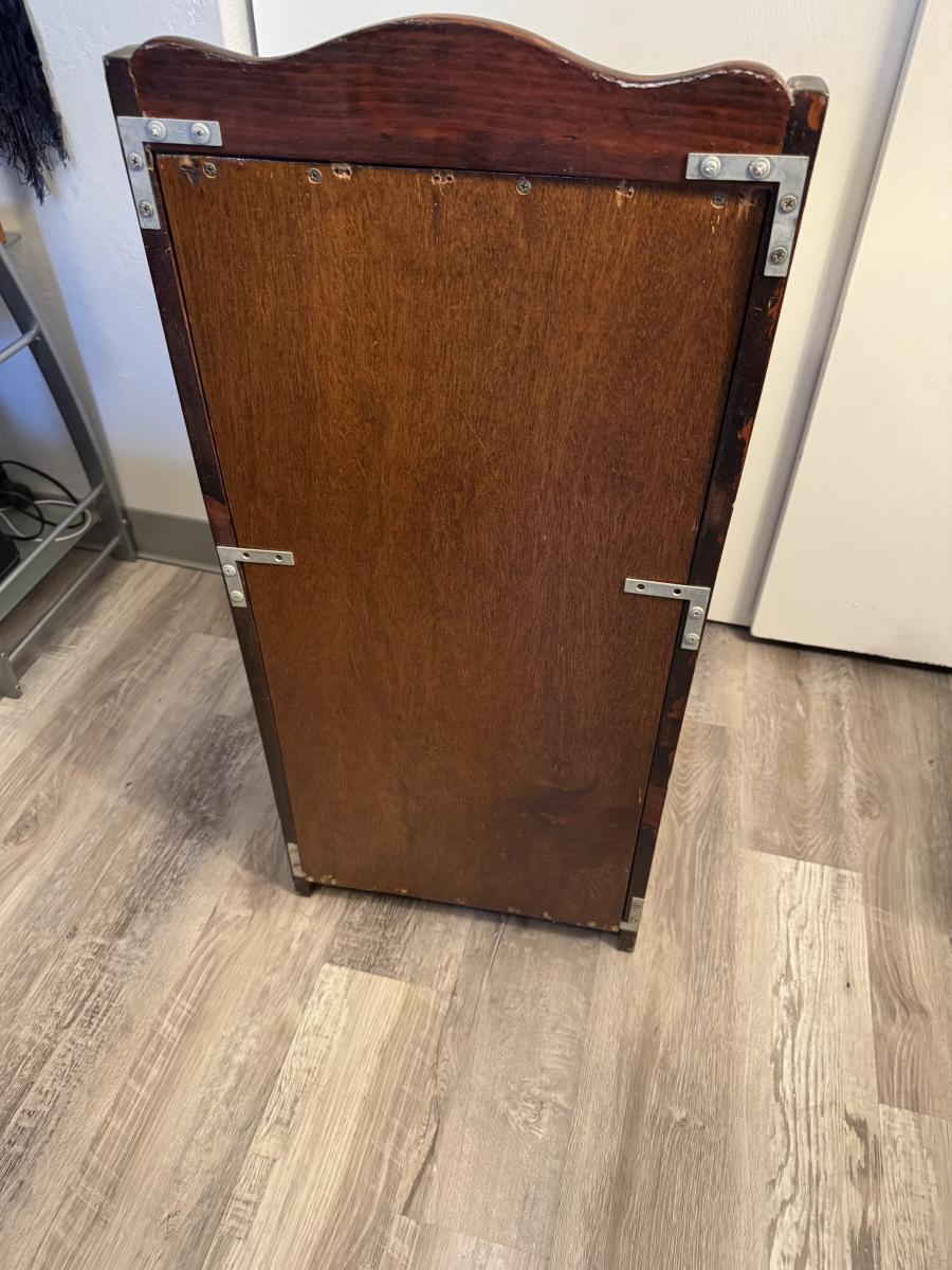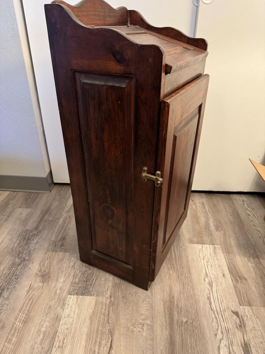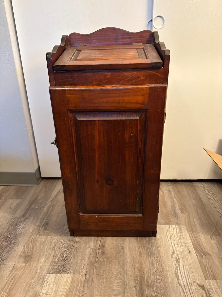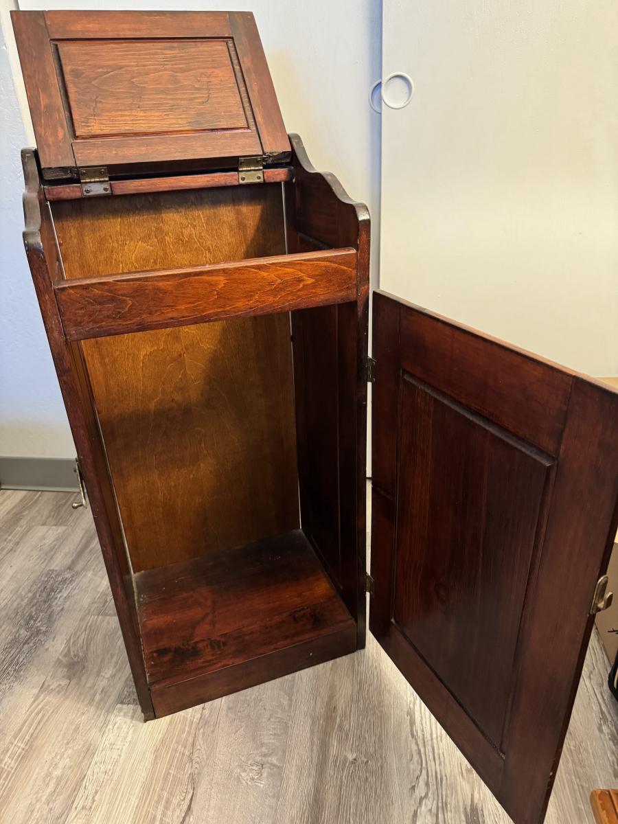 Charming vintage wooden trash bin cabinet with a hinged flip-top lid and front door access. Rich wood finish with paneled detailing adds a rustic touch. Functional storage for kitchen, pantry, or laundry room use, while doubling as a decorative accent piece.