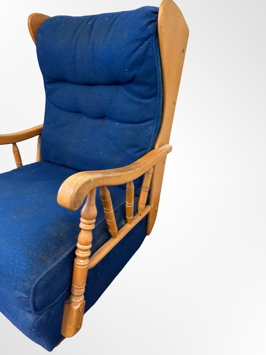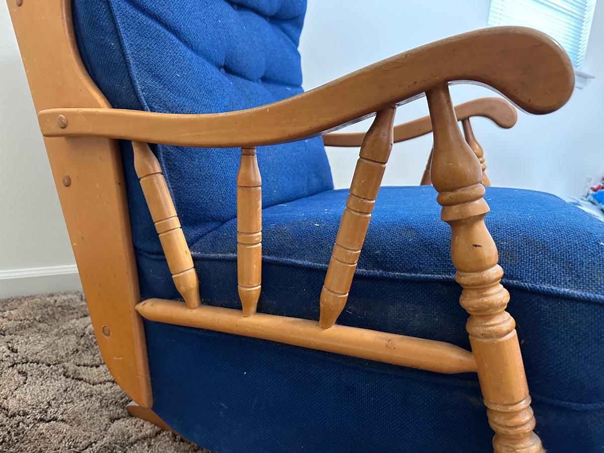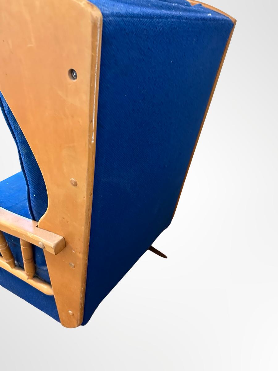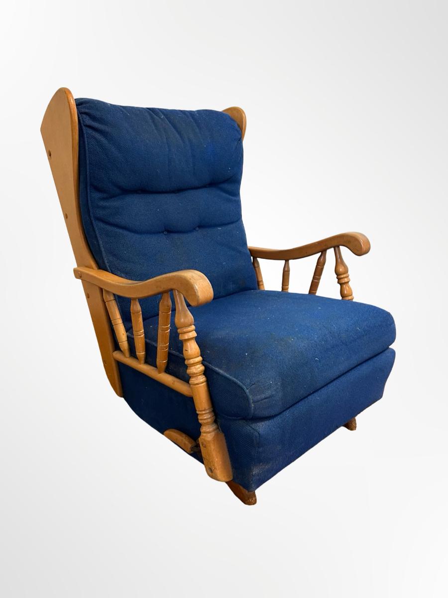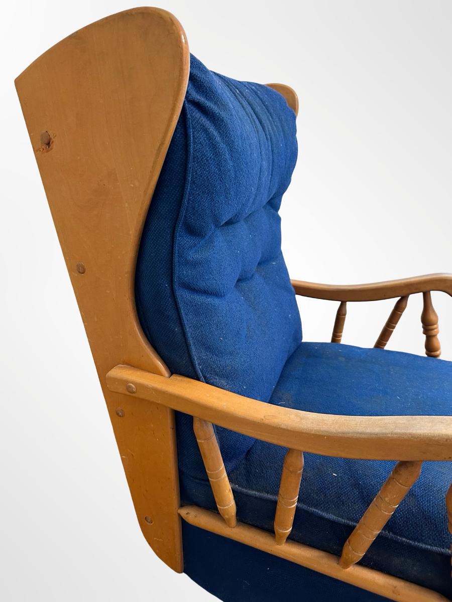 Vintage Wooden Glider Rocking Chair with Blue Upholstery