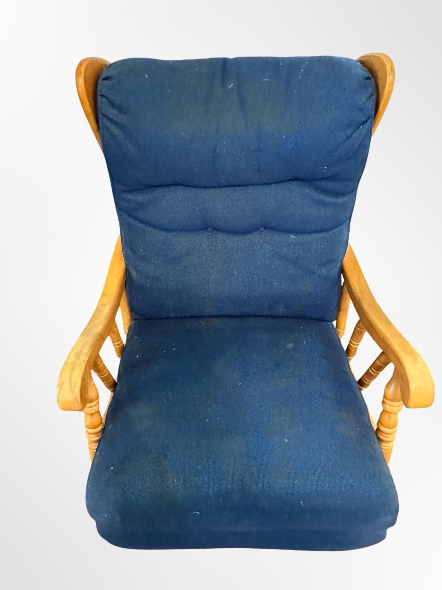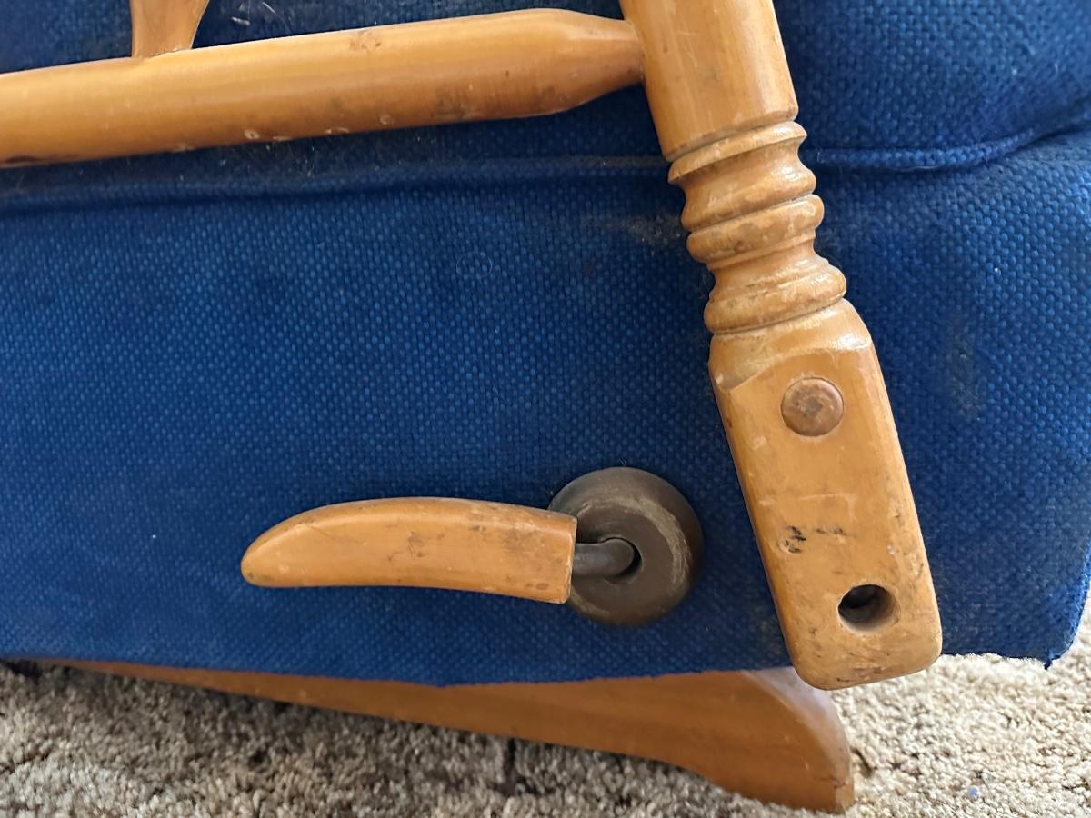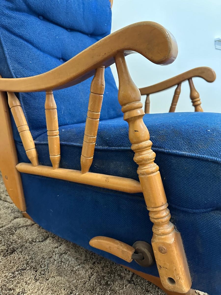 Vintage wooden glider rocking chair with blue upholstered cushions and turned spindle arms. Features a side lever that locks the chair from gliding. Upholstery shows wear and light fading consistent with age and use.