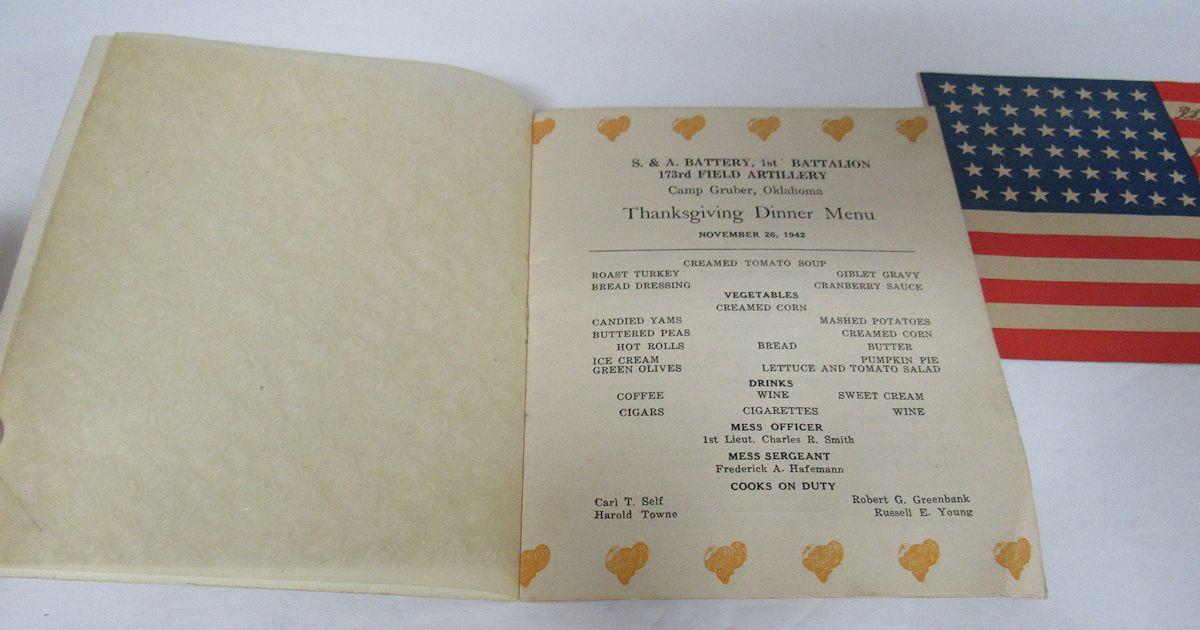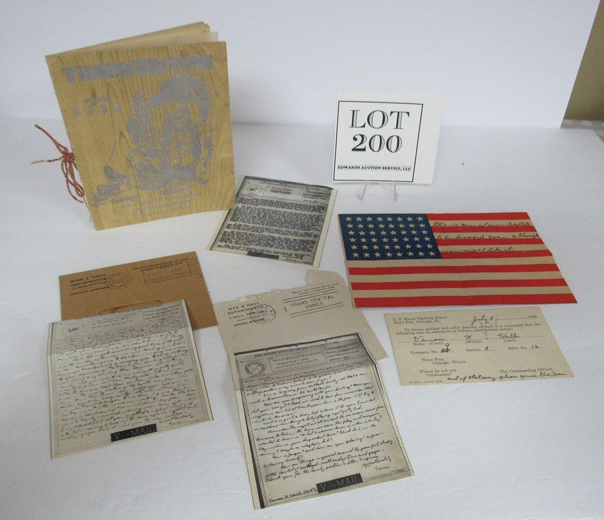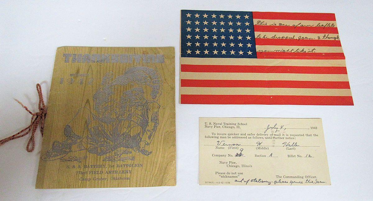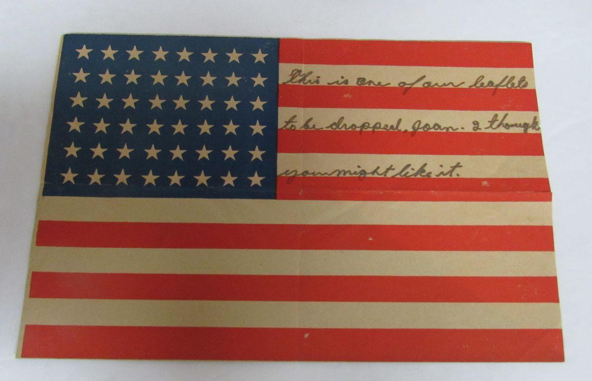 Official Menu, and other items. The flag was a leaflet that "they dropped" during the war, per note on it. Shipping is available at shipping cost plus $5.00 handling fee on up to 8 lots, $10.00 handling fee on 9 or more lots or two boxes.