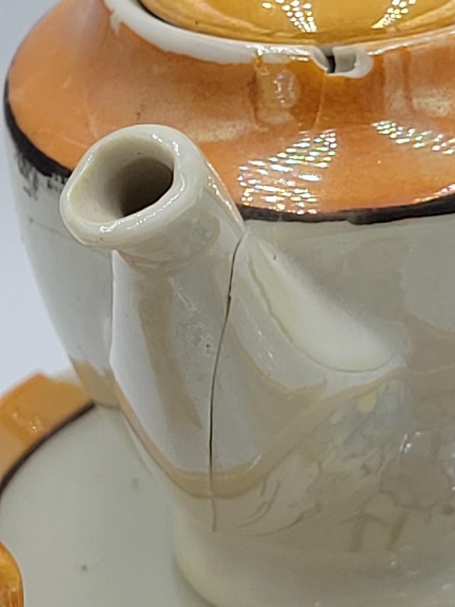 The pot has been broken and mended as seen in the photos. One plate also has a chip missing from it.