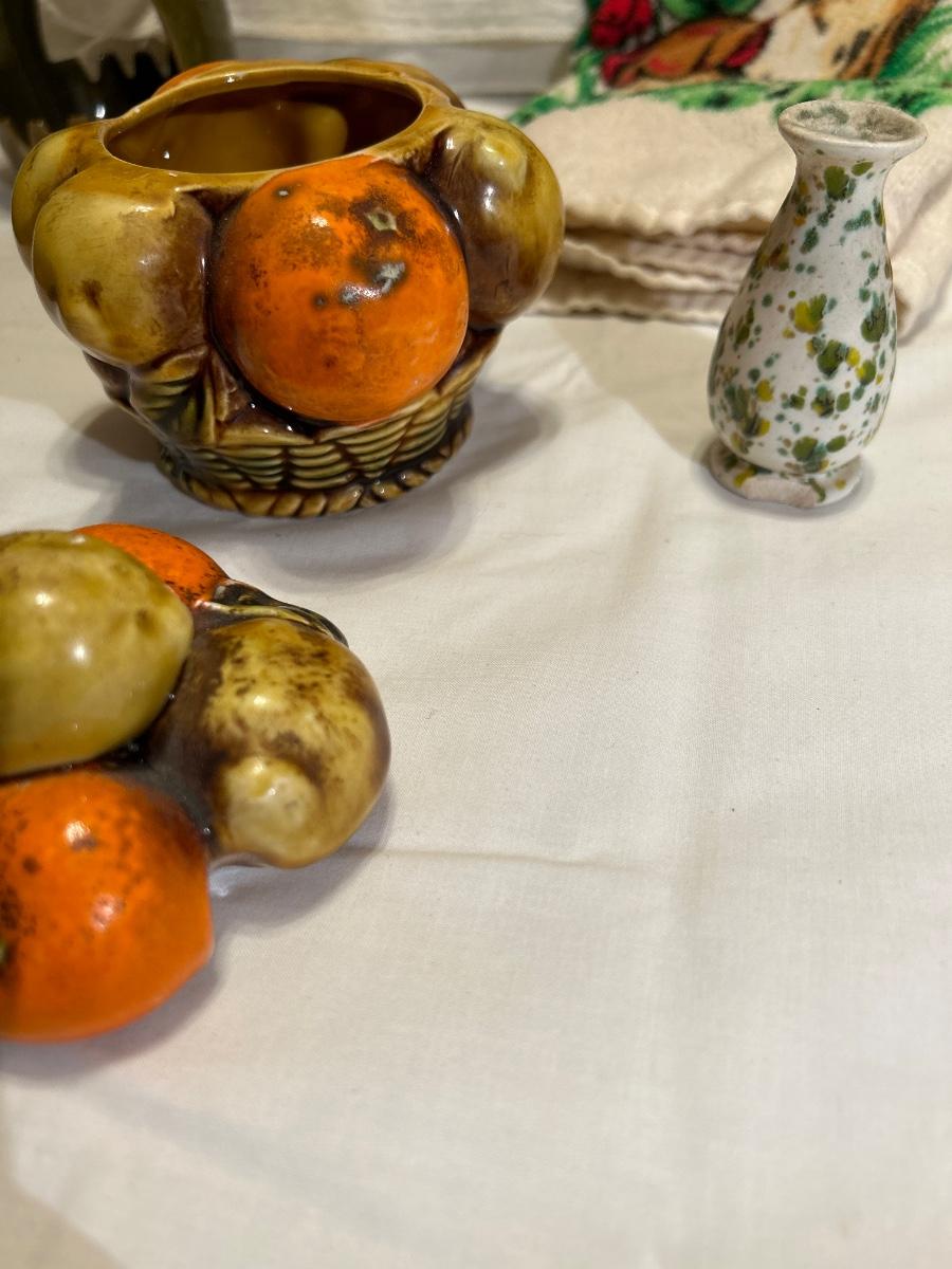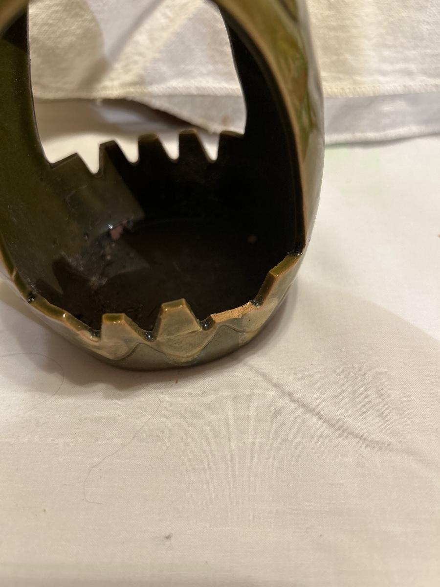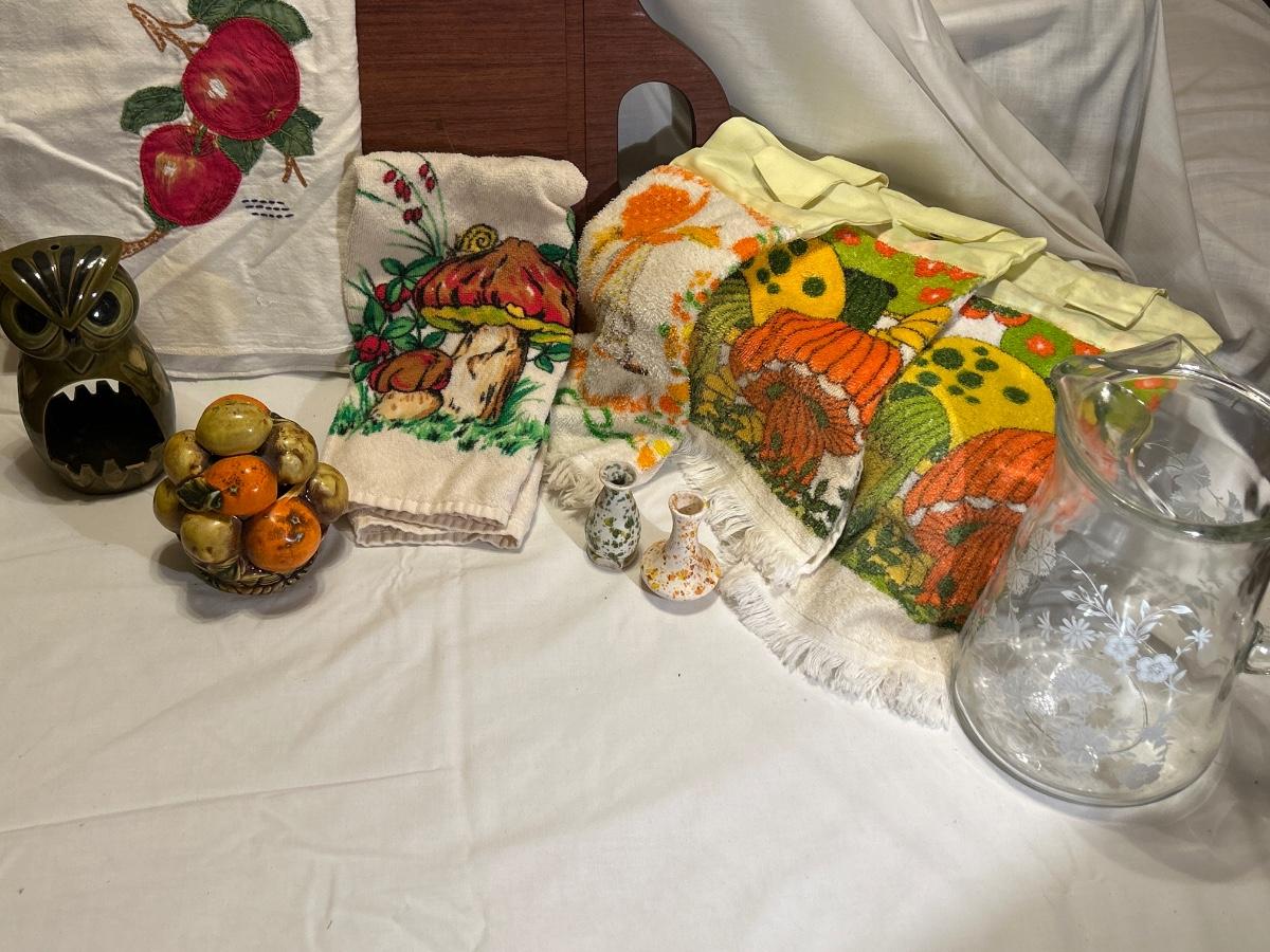 The owl is missing a tooth, and we believe it is an incense holder“🦆made in Japan. There is a chip in the green small vase. 5 towels