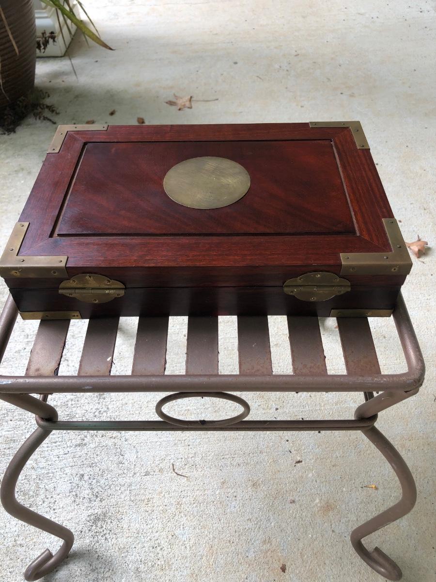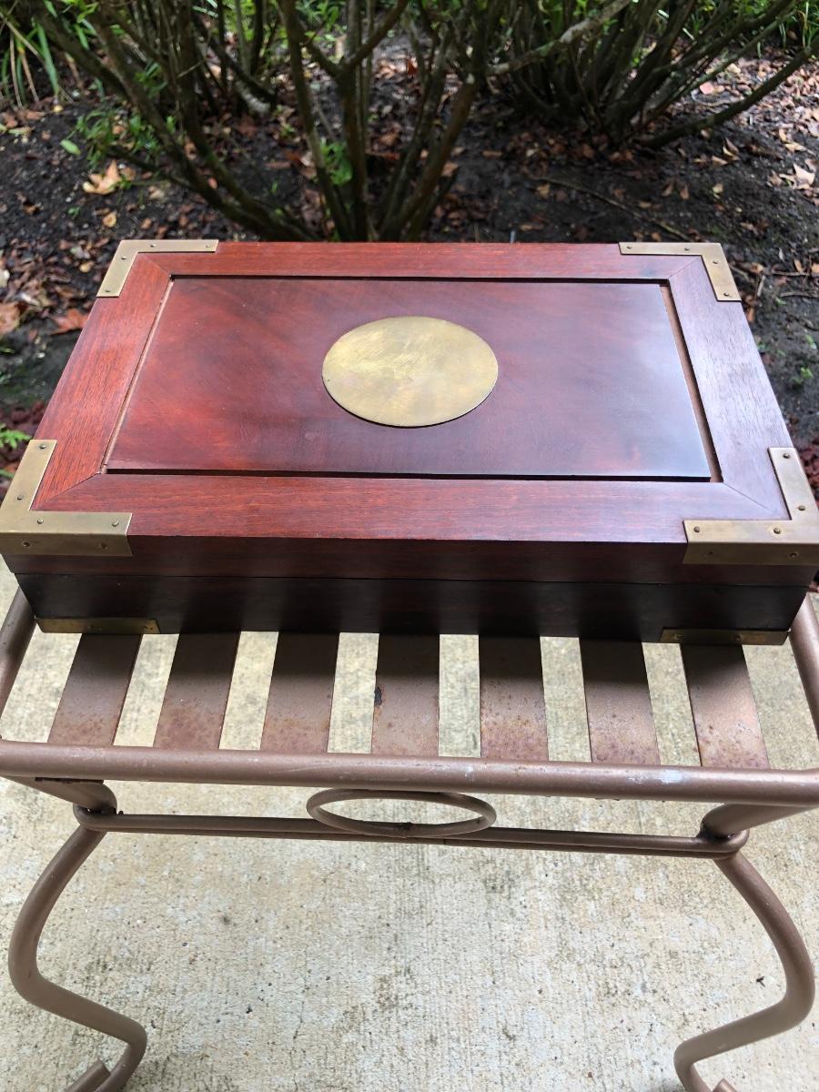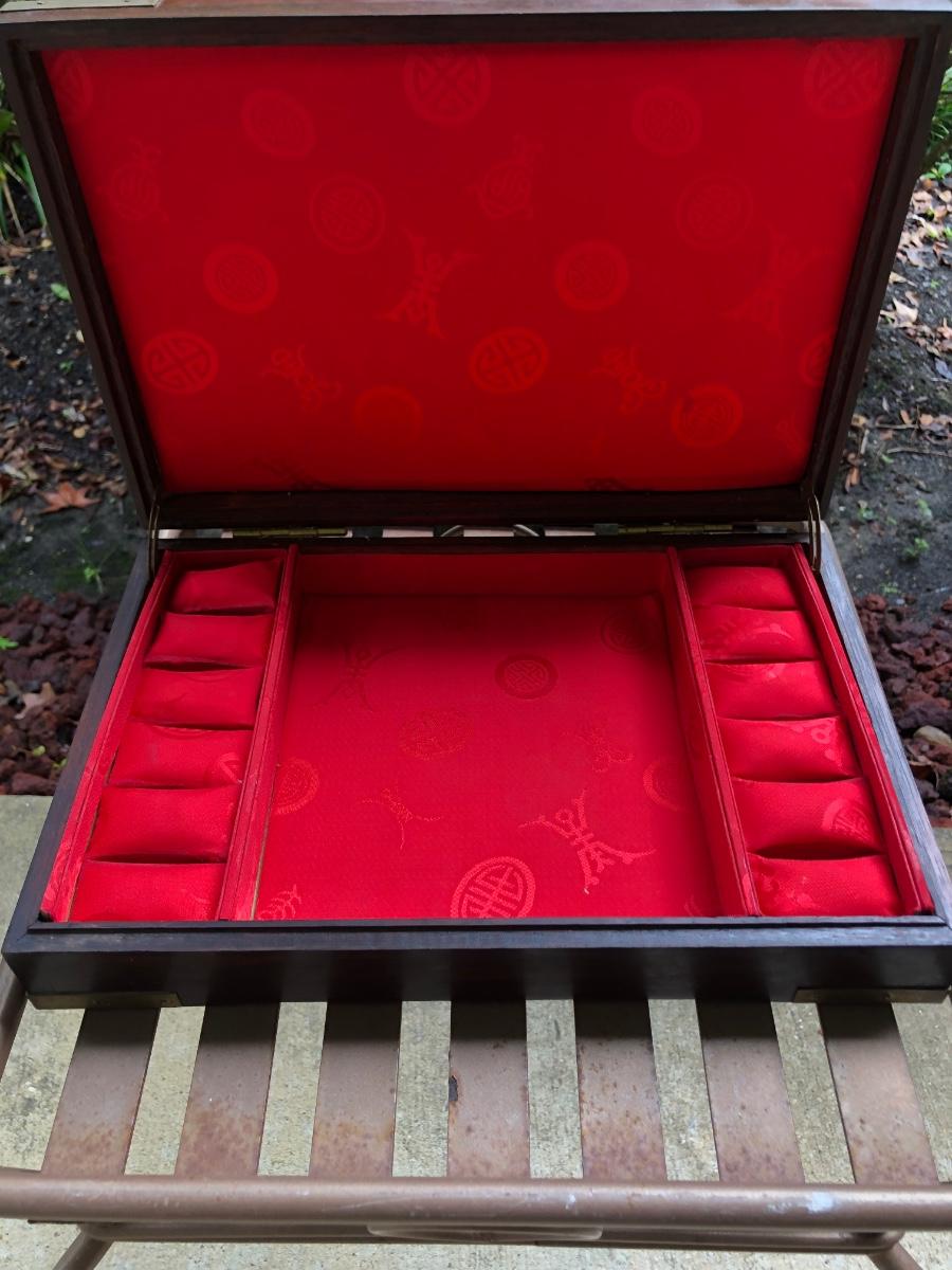 12 wide, 8 deep. Dark wood/red interior/brass edges.