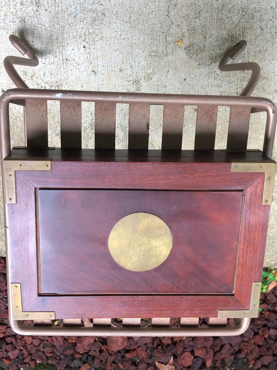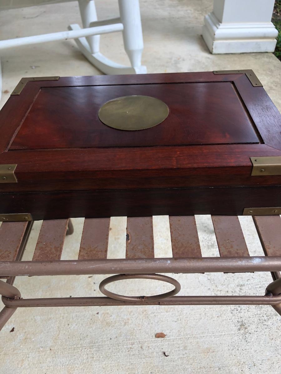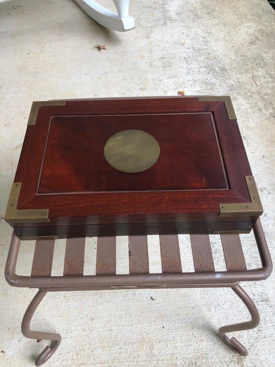 12 wide, 8 deep. Dark wood/red interior/brass edges.