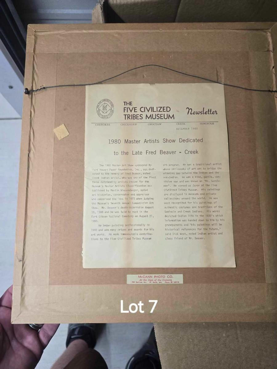 Fred Beaver (1911-1980) was a Creek-Seminole Native American painter. His Muscogee name was Ekalanee, which means "Brown Head." In 1931, he graduated from Eufaula High School where he was an All-State football and basketball player. He attended Bacone College, and in 1935 graduated from Haskell Business College. He worked for the Bureau of Indian Affairs and the Army Air Corps until 1960 when he retired to pursue a career of painting full time.