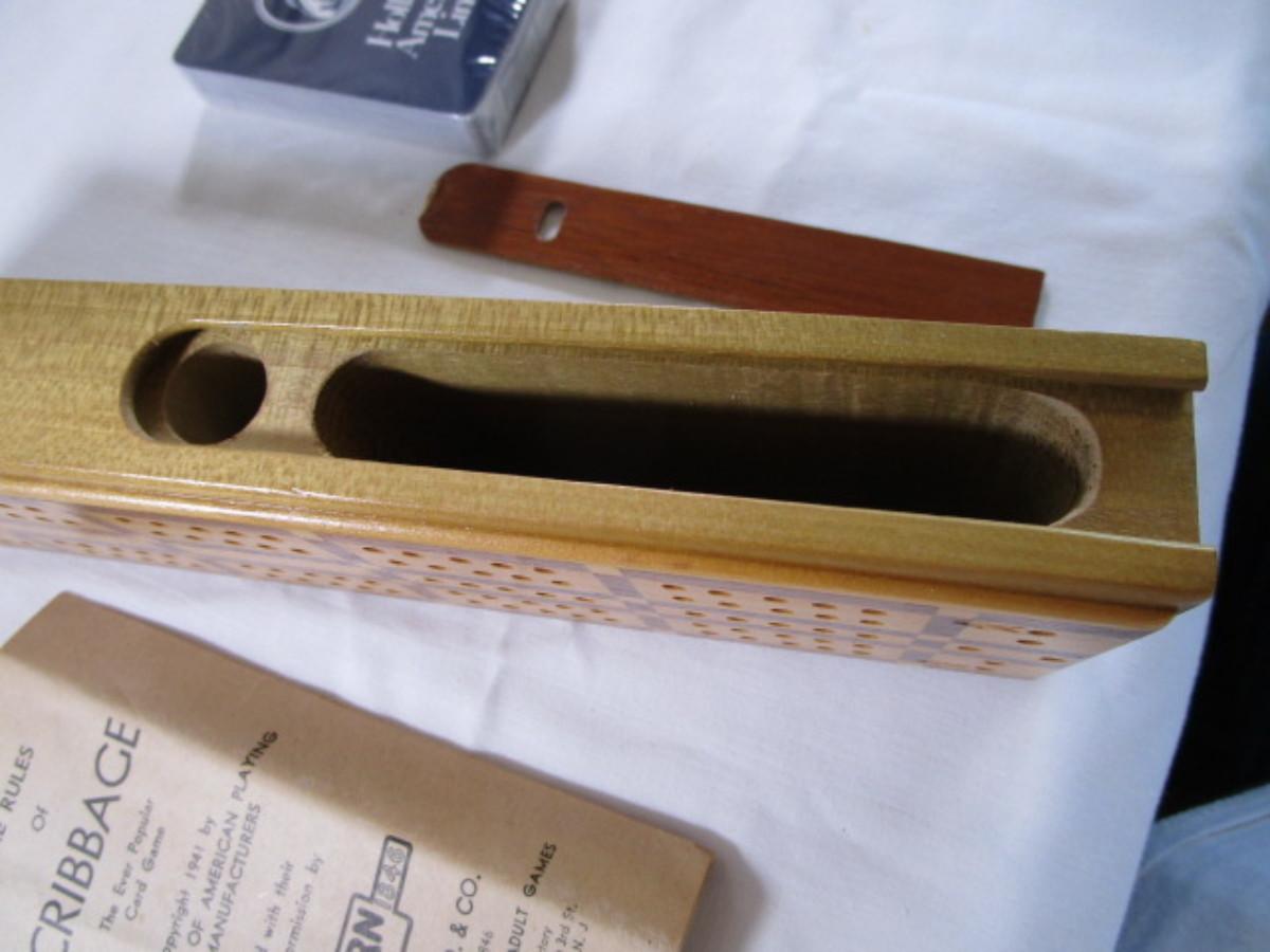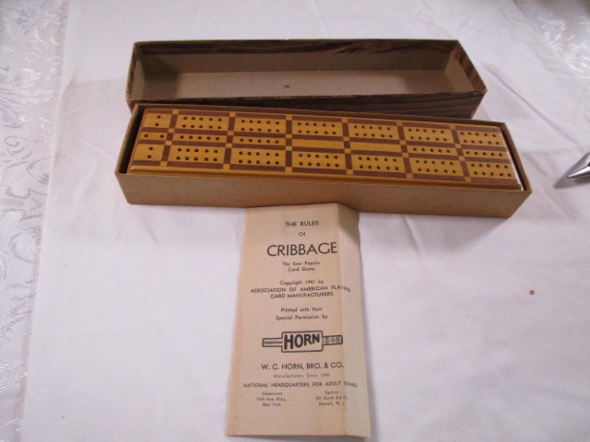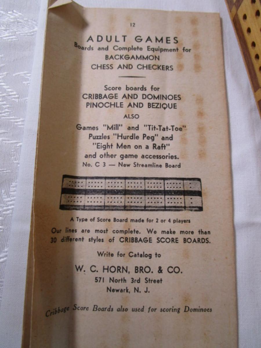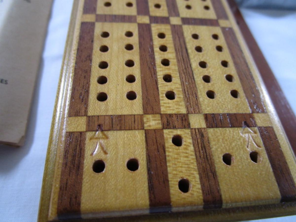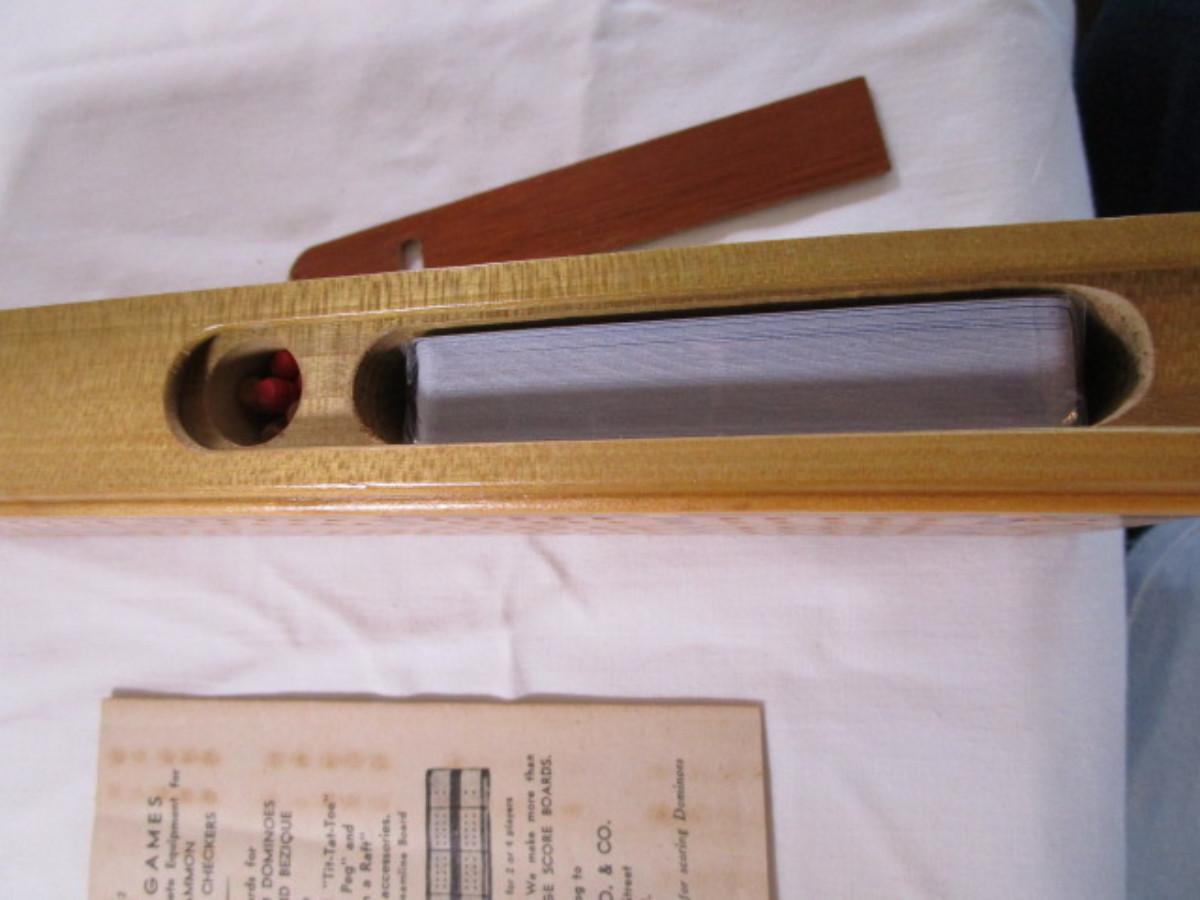 inlaid wood board, markers and deck of cards, instructions dated 1941