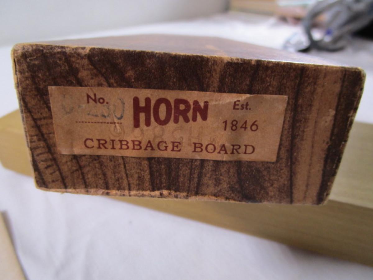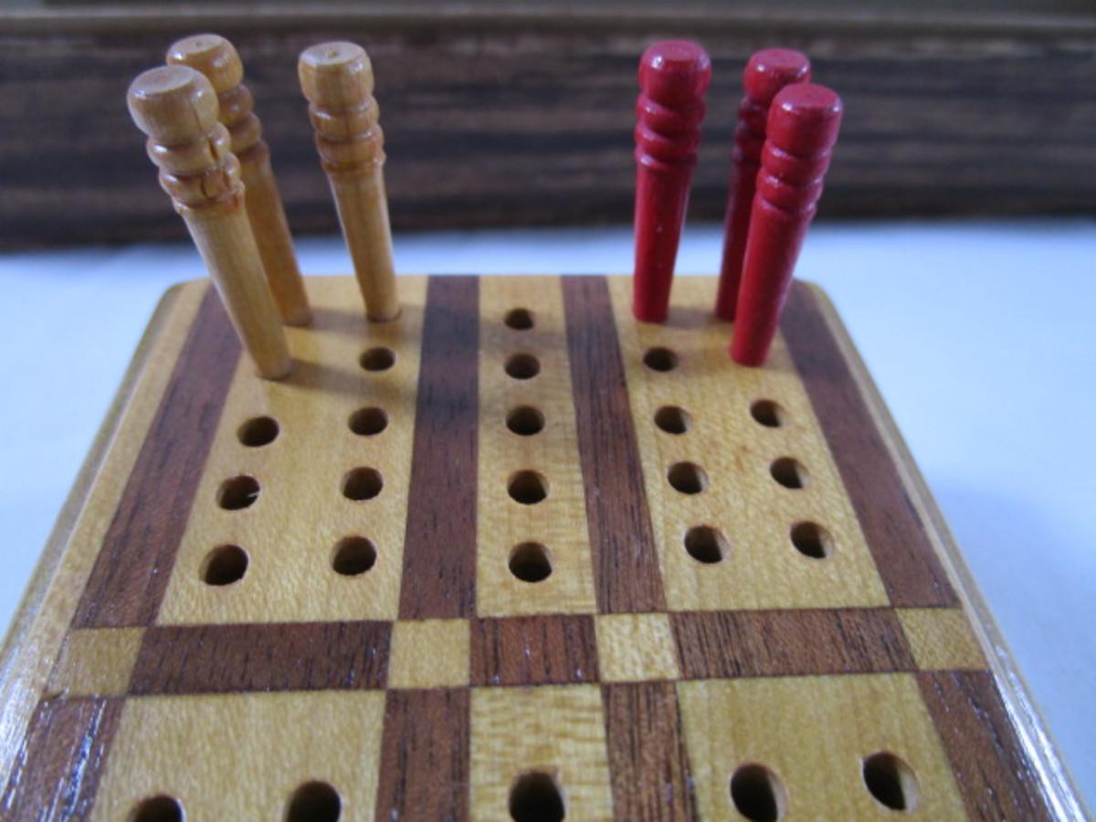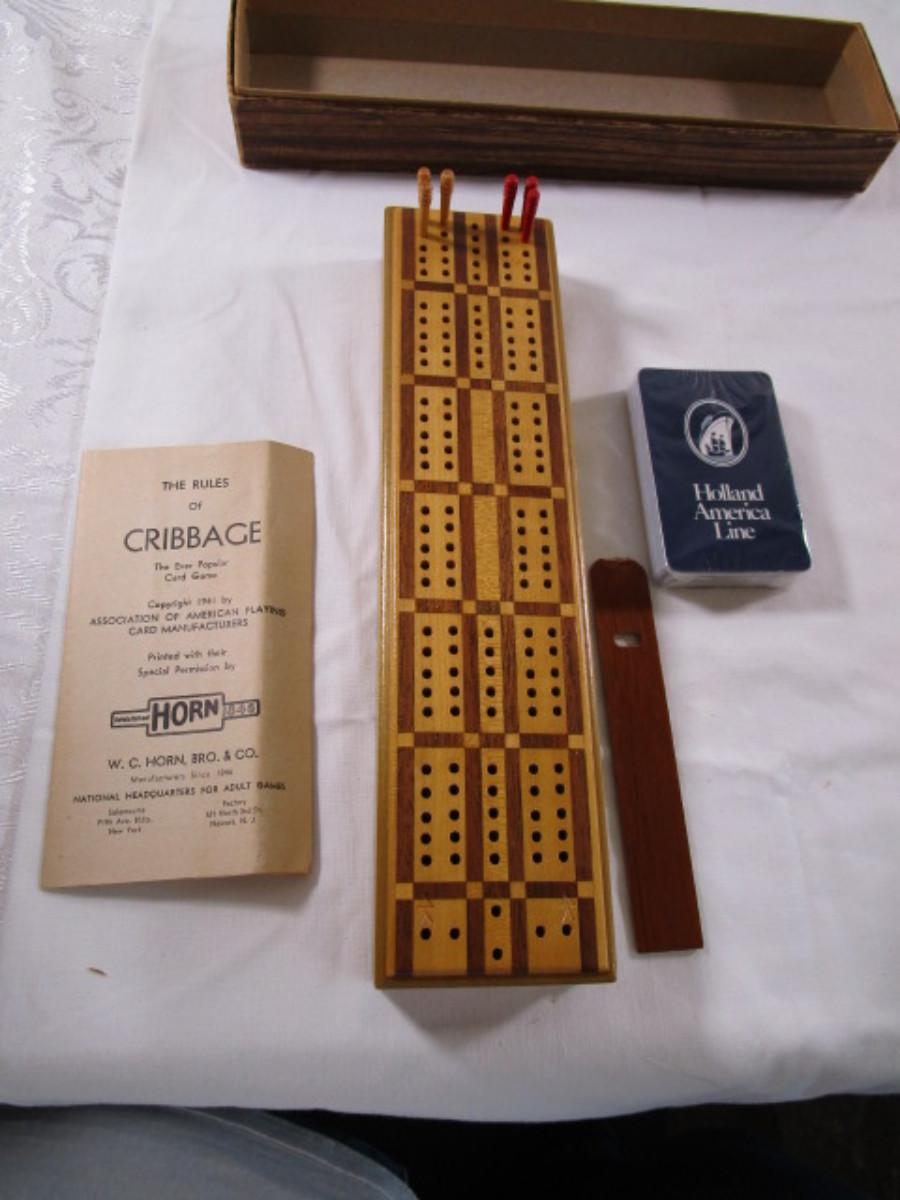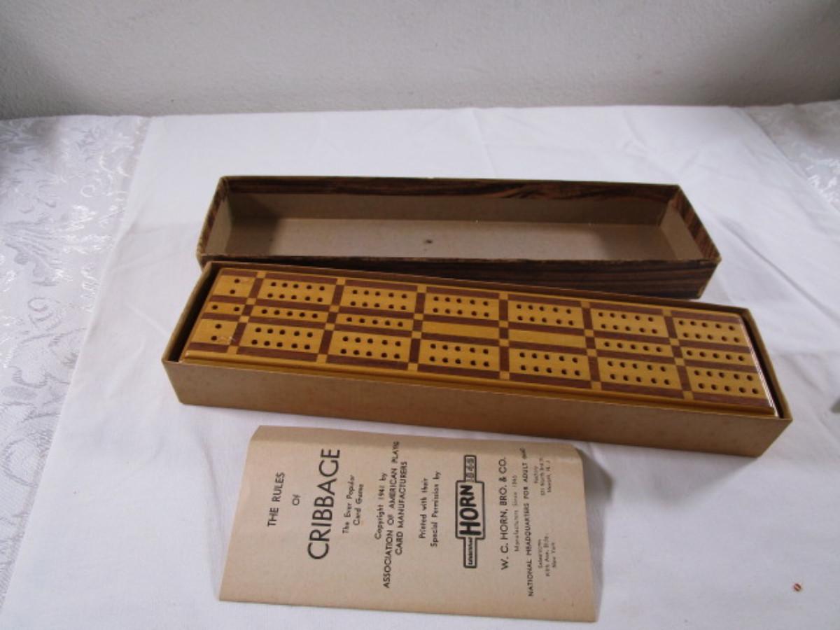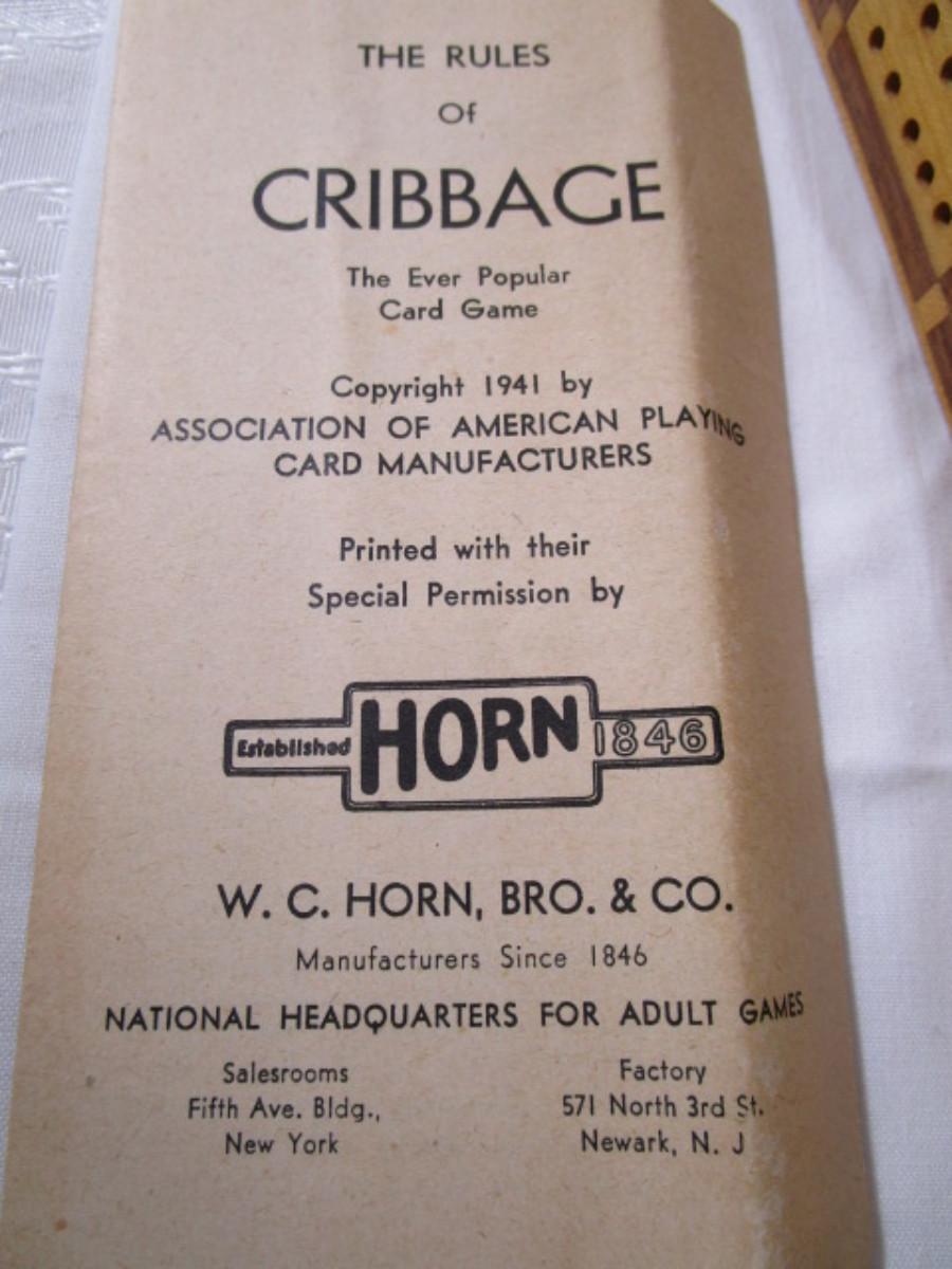 inlaid wood board, markers and deck of cards, instructions dated 1941