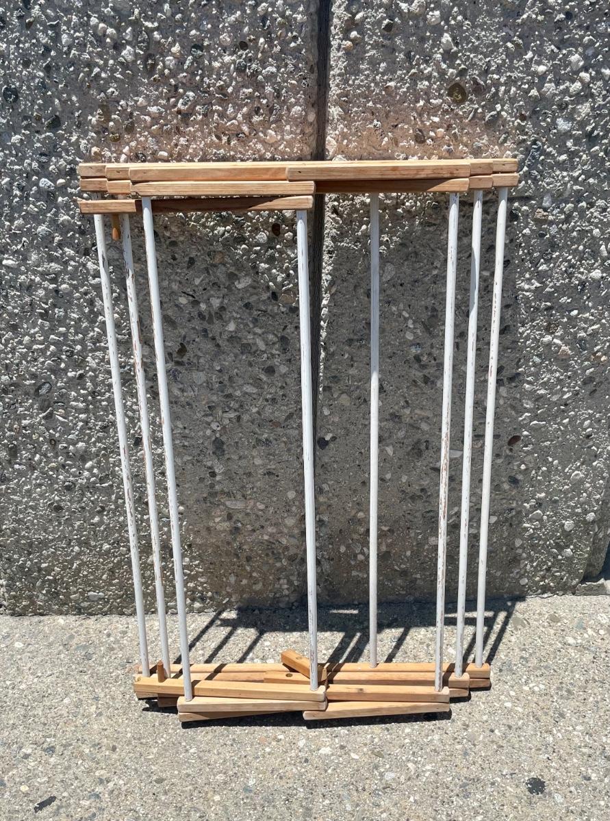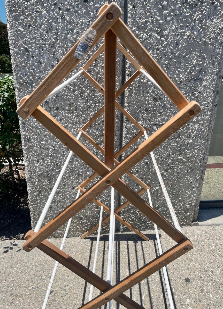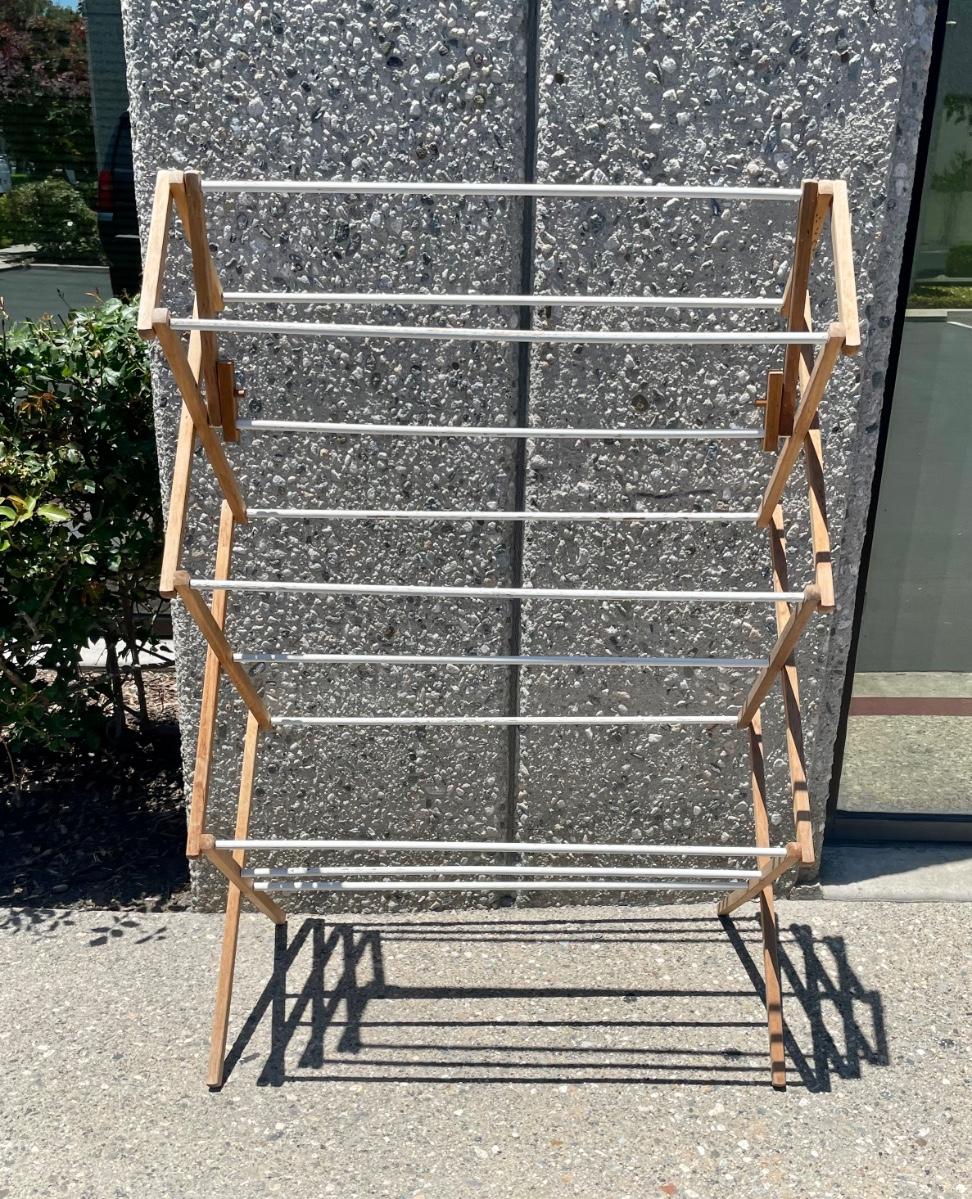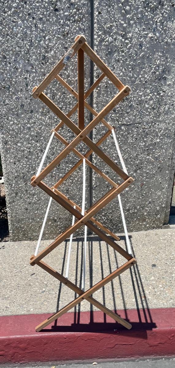 Clothes drying rack made from wooden framework and wood dowel. Stands approx 54" tall, 18" deep, and 36" wide when fully extended. Collapses to less than 6" wide for easy storage when not in use.