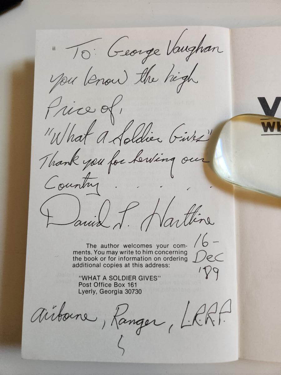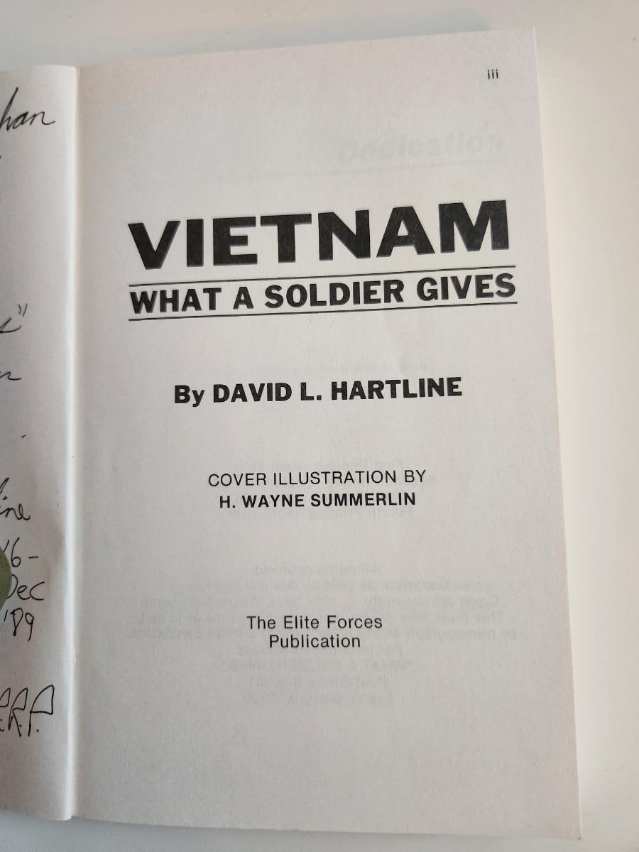This auction lot is for a crisp copy of the paper bound book What a Soldier Gives by David L. Hartline - Autographed by the author. This book published by Elite Forces Publication tells the story of one man's military experience - the good, the bad and the ugly. This is a 4th printing of 1988. 242 Pages. The book is crisp and in clean condition with some light handling wear.