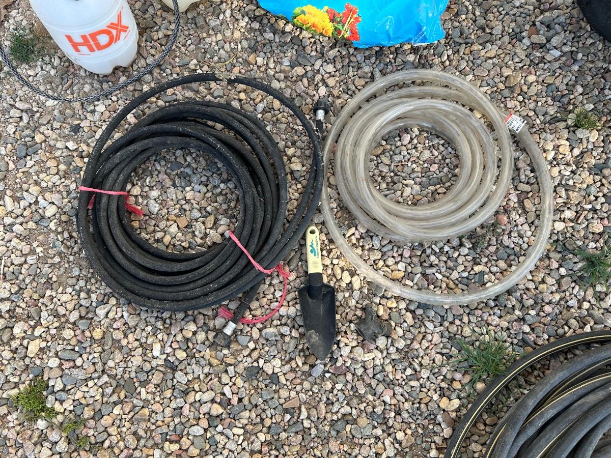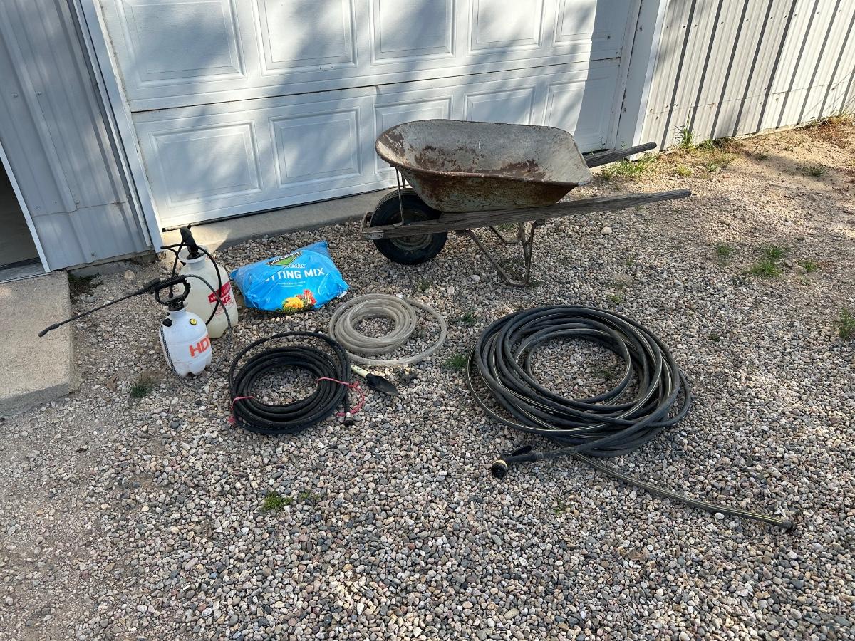 WHEEL BARROW, GARDEN HOSES, WEED SPRAYERS